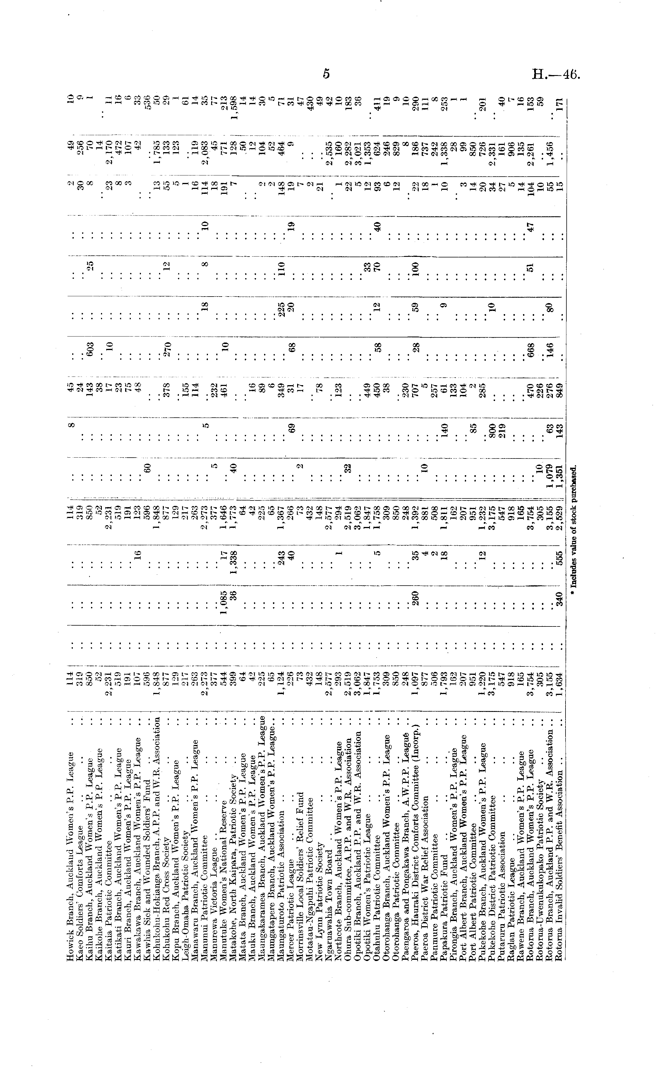 Howick Branch, Auckland Women s P.P. League .. I Kaeo Soldiers' Comforts League .. .. ... I Kaihu Branch, Auckland Women's P.P. League .. -| Kaikohe Brancli, Auckland Women's P.P. League Kaitaia Patriotic Committee Katikati Branch, Auckland Women's P.P. League Kauri Branch, Auckland Women's P.P. League Kawakawa Branch, Auckland Women's P.P. League Kawhia Sick and Wounded Soldiers' Fund Kohukohu- 11 okianga Brancli, A.P.P. and W.R, Association Kohukohu Red Cross Society .. .. Kopu Branch, Auckland Women's P.P. League Leigh-Omaha Patriotic Society .. .. .. Manaivaru Branch, Auckland Women's P.P. League Manunui Patriotic Committee .. .. Manurewa Victoria League .. .. .. ... Manutuke Women's National Reserve .. ... Matakohe, North Kaipara, Patriotic Society Matata Branch, Auckland Women's P.P. League Mauku Branch, Auckland Women's P.P. League Maungakaramea Branch, Auckland Women's P.P. League Maungatapere Branch, Auckland Women's P.P. League.. Maungaturoto Patriotic Association .. .. ... Mercer Patriotic League .. .. .. Morrinsville Local Soldiers' Relief Fund .. Motatau-Ngapuhi Patriotic Committee New Lynn Patriotic Society Ngaruawahia Town Board Northcote Branch, Auckland Women's P.P. League Ohura Sub-committee, A.P.P. and W.R. Association Opotiki Branch, Auckland P.P. and W.R. Association .. Opotiki Women's Patriotic League .. .. .. j Otahuhu Patriotic Committee .. .. Otorohanga Branch, Auckland Women's P.P. League .. ! Otorohanga Patriotic Committee Paengaroa and Pongakawa Branch, A.W.P.P. League .. Paeroa, Hauraki District Comforts Committee (Incorp.) Paeroa District War Relief Association Panmure Patriotic Committee Papakura Patriotic Fund .. .. Pirongia Branch, Auckland Women's P.P. League Port Albert Branch, Auckland Women's P.P. League .. Port Albert Patriotic Committee Pukekohe Branch, Auckland Women's P.P. League Pukekohe District Patriotic Committee Putaruru Patriotic Association Raglan Patriotic League Rawene Branch, Auckland Women's P.P. League Rotorua Branch, Auckland Women's P.P. League Rotorua-Uwenukukopako Patriotic Society Rotorua Branch, Auckland P.P. and W.R. Association .. Rotorua Invalid Soldiers' Benefit Association .. 114 319 850 52 2,231 519 191 107 596 1,848 877 129 217 263 2,273 377 544 399 64 42 225 65 1,124 226 73 432 148 2.577 293 2,519 3,062 1,847 1.753 309 850 248 1.097 877 506 1,793 162 207 951 1,220 3,175 547 918 I 165 I 3,754 305 3,155 1,634 •■ 1,085 36 260 340 ■• 16 17 1,338 243 40 5 35 4 2 I 18 | 12 555 • 319 850 52 2,231 519 191 123 596 1,848 877 129 217 263 2,273 377 1,646 1,773 64 42 225 65 1,367 266 73 432 148 2,577 294 2,519 3.062 1,847 1,758 309 850 248 1,392 881 508 1,811 162 207 951 1,232 3,175 547 918 165 3,754 305 3,155 2,529 60 40 ' 2 "32 8 5 69 45 ; 24 143 38 17 ! 23 i 75 48 37S 155 114 232 461 16 89 6 349 31 17 78 123 603 10 270 10 68 "l8 225 20 "l2 25 "l2 8 110 "33 70 10 "l9 "40 2 30 23 8 3 13 55 5 1 16 114 18 191 7 2 148 19 7 2 21 22 5 12 93 6 12 49 . 256 70 j 14 2,170 ! 472 ! 107 42 1,785 133 123 119 2,083 45 771 128 I .50 i 12 104 52 464 9 2,535 160 2,282 3,021 1,353 624 246 ; 829 186 737 242 1,338 28 99 850 726 2,331 161 906 135 2,261 1,456 10 9 1 11 16 6 33 536 50 29 1 61 14 35 77 213 1.598 14 14 30 5 71 31 47 430 49 42 10 183 36 411 19 9 10 290 111 8 253 1 1 201 40 16 153 59 171 a "lO "lO 1,079 1,351 140 "85 800 219 "63 143 449 450 38 230 707 5 257 61 133 104 2 285 470 226 276 849 58 28 668 146 "59 " 9 •• "lO "so ioo .. "51 •• "47 22 18 1 10 3 14 20 34 27 5 14 104 10 55 15 * Includes value of stock purchased.