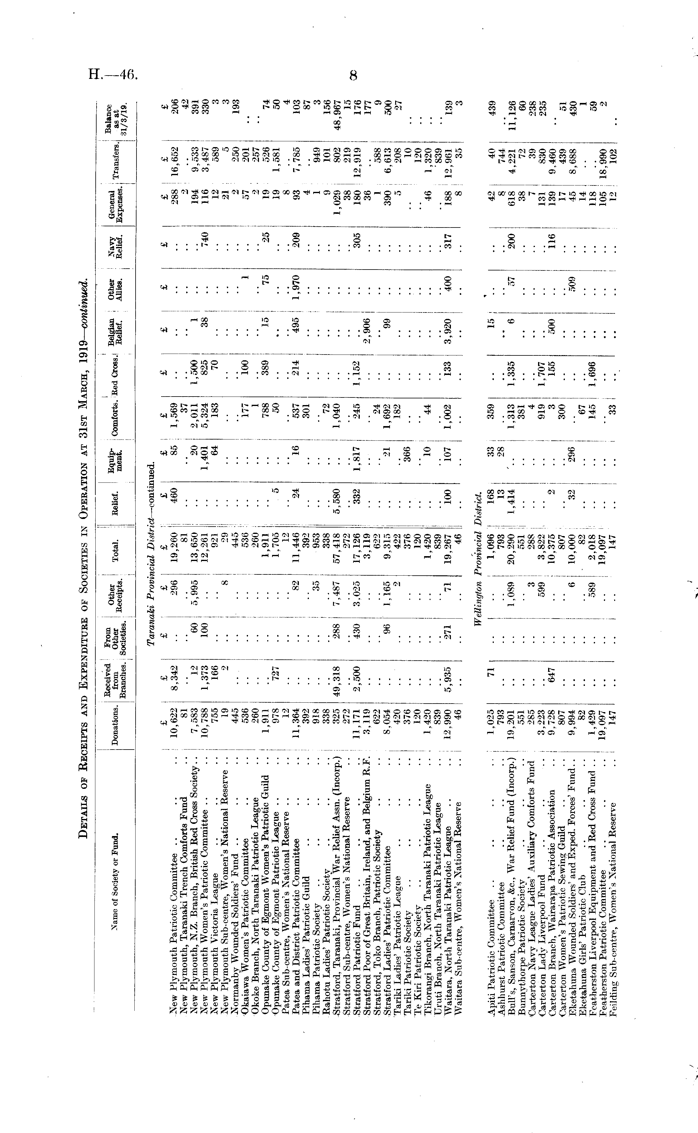 Name of Society or Fund. Received From I cm,** I Donations. from Other : »^S5L Branches. Societies. ■ Jiece, P ts - Total. Relic., **£ | Comforts. Across. Be.gan j Other j *avy Transfers. | JgT Taranaki Provincial District —contii med. New Plymouth Patriotic Committee .. .. .. | 10,622 New Plymouth, Taranaki Trench Comforts Fund .. 81 New Plymouth, N.Z. Branch, British Red Cross Society.. 7,583 New Plymouth Women's Patriotic Committee .. .. 10,788 New Plymouth Victoria League .. .. .. 755 New Plymouth Sub-centre, Women's National Reserve .. 19 Normanby Wounded Soldiers' Fund .. .. .. 445 Okaiawa Women's Patriotic Committee .. .. 536 Okoke Branch, North Taranaki Patriotic League .. 260 Opunake County of Egmont Women's Patriotic Guild .. 1,911 Opunake County of Egmont Patriotic League .. .. 978 Patea Sub-centre, Women's National Reserve .. .. 12 Patea and District Patriotic Committee .. .. 11,364 Pihama Ladies' Patriotic Guild .. .. .. 392 Pihama Patriotic Society .. .. .. .. 918 Rahotu Ladies' Patriotic Society .. .. .. 338 Stratford, Taranaki, Provincial War Relief Assn. (Incorp.) 325 Stratford Sub-centre, Women's National Reserve .. 272 Stratford Patriotic Fund .. .. .. .. 11,171 Stratford Poor of Great Britain, Ireland, and Belgium R.F. 3,119 Stratford, Toko Branch, Patriotic Society .. .. 622 Stratford Ladies'Patriotic Committee .. .. 8,054 Tariki Ladies' Patriotic League .. .. .. 420 Tariki Patriotic Society .. .. .. .. 376 Te Kiri Patriotic Society .. .. .. .. 120 Tikorangi Branch, North Taranaki Patriotic League .. 1,420 Uruti Branch, North Taranaki Patriotic League .. 839 Waitara, North Taranaki Patriotic League .. .. 12,990 Waitara Sub-centre, Women's National Reserve .. I 46 £ 8,342 12 1,373 166 2 £ £ £ £ 296 19,260 460 81 60 5,995 13,650 100 .. 12,261 921 8 29 .... 445 536 260 1,911 1.705 5 12 82 11,446 24 392 35 953 338 288 7,487 57,418 5,580 272 430 3.025 17,126 332 3,119 622 96 1,165 9,315 2 422 376 120 1,420 839 271 71 19,267 100 46 £ : £ 85 1,569 37 20 I 2,011 1,401 5,324 64 183 £ 1,500 825 70 £ 38 15 495 2,906 99 3,920 £ 75 1,970 400 740 25 209 305 317 £ ! £ 288 ! 16,652 2 194 9^533 116 3,487 12 589 21 | 5 2 '< 250 57 201 2 . 257 19 526 19 1,581 8 93 7,785 4 i 1 i 949 9 101 1,029 802 38 219 180 12,919 36 1 I 588 390 ; 6,613 5 j 208 10 120 46 1,320 '839 188 12,961 8 ! 35 £ 206 42 391 330 3 3 193 I 788 50 ioo 389 727 49,318 16 537 301 72 1,040 214 74 50 4 103 87 3 156 48,967 15 176 177 9 500 27 2^500 1,817 245 24 21 1,692 182 366 1,152 10 j 44 5,935 .. ! .. 107 1,002 133 139 3 Apiti Patriotic Committee .. .. .. . • 1,025 Ashhurst Patriotic Committee .. .. .. 793 Bull's, Sanson, Carnarvon, &c, War ReUef Fund (Incorp.) 19,201 Bunnythorpe Patriotic Society .. .. .. 551 Carterton Navy League Ladies' Auxiliary Comforts Fund 285 Carterton Lady Liverpool Fund .. .. .. 3,223 Carterton Branch, Wairarapa Patriotic Association .. 9,728 Carterton Women's Patriotic Sewing Guild .. .. 807 Eketalmna Wounded Soldiers' and Exped. Forces' Fund.. 9,994 Eketahuna Girls' Patriotic Club .. .. .. 82 Featherston Liverpool Equipment and Red Cross Fund .. 1,429 Featherston Patriotic Committee .. .. .. 19,097 Feilding Sub-centre, Women's National Reserve .. 147 71 Wellington Provincial District. 33 359 28 1,313 381 4 919 3 300 296 67 145 1,335 1,707 155 1,696 439 647 | .. 1,096 168 793 13 1,089 20,290 1,414 551 3 288 599 3,822 10.375 2 807 6 10,000 32 82 589 2.018 19,097 147 15] 6 500 57 509 200 116 42 40 8 744 618 4,221 38 72 7 39 131 830 139 9.460 17 439 45 8,688 14 118 I 105 18.990 12 I 102 11,126 60 238 235 51 430 59 2 .. i 33 i