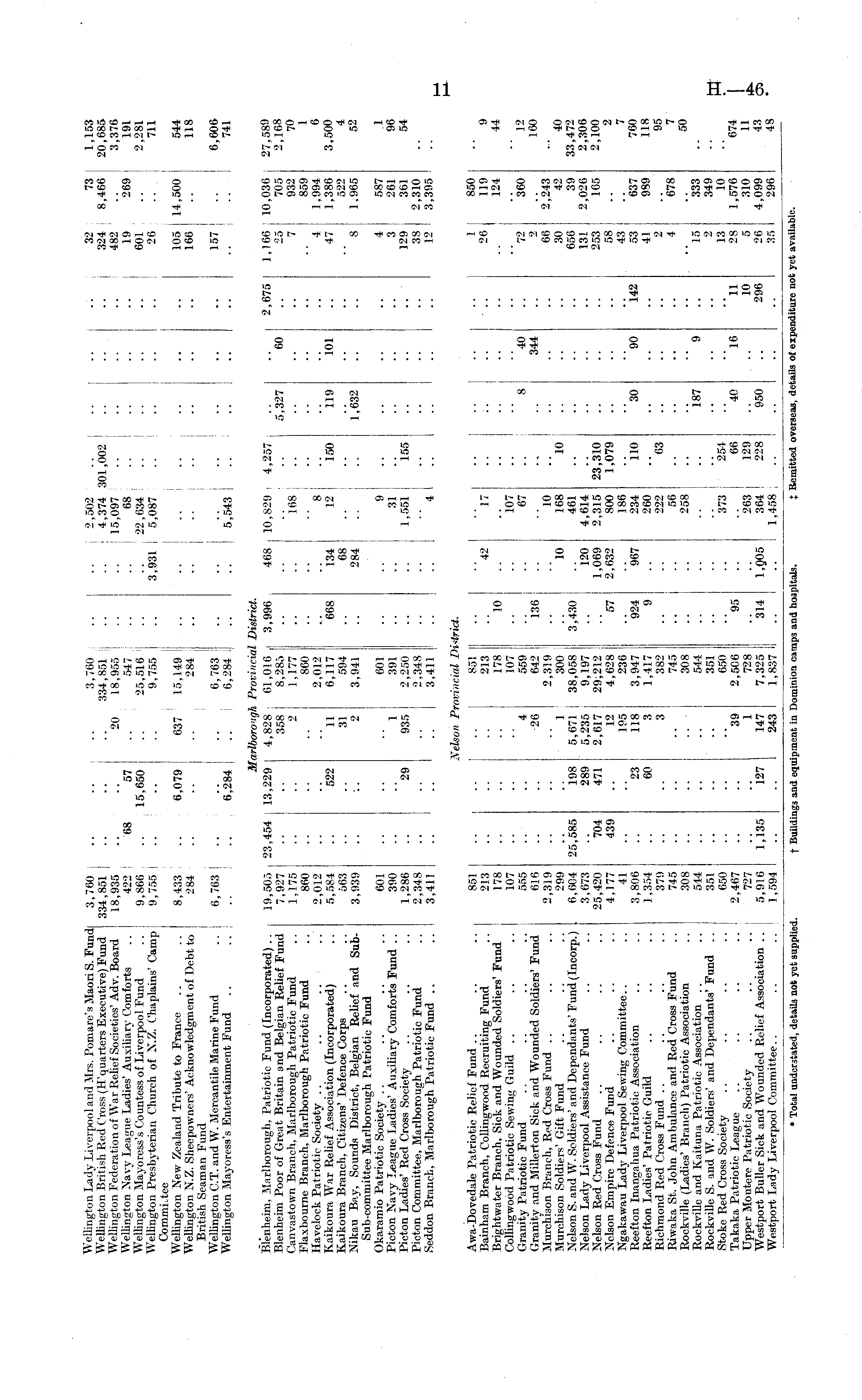 Wellington Lady Liverpool and Mrs. Pomare's Maori S. Fund WeUington British Red Cross (H'quarters Executive) Fund WelUngton Federation of War Relief Societies' Adv. Board WeUington Navy League Ladies' AuxiUary Comforts WelUngton Mayoress's Countess of Liverpool Fund W 7 elUngton Presbyterian Church of N.Z. Chaplains' Camp Committee WeUington New Zealand Tribute to France Wellington N.Z. Sheepowners' Acknowledgment of Debt to British Seaman Fund WelUngton C.T. and W. Mercantile Marine Fund WelUngton Mayoress's Entertainment Fund 3,760 334,851 18,935 422 9,866 9,755 68 •• .. - I 57 15,650 3,760 334,851 j 20 18,955 547 25,516 i 9,755 637 ! 15,149 284 j 2,502 4,374 301,002 15,097 68 j j 22,634 : 3,931 I 5,087 32 j 73 324 ; 8,466 482 19 269 601 26 1,153 20,685 3,376 191 2,281 711 8,433 I 284 6,079 105 14,500 166 157 544 118 6,606 741 6,284 1 6,763 6,763 6,284 Ij I 5,543 I .: i Blenheim, Marlborough, Patriotic Fund (Incorporated) .. Blenheim Poor of Great Britain and Belgian Relief Fund Canvastown Branch, Marlborough Patriotic Fund Flaxbourne Branch, Marlborough Patriotic Fund Havelock Patriotic Society .. Kaikoura War Relief Association (Incorporated) Kaikoura Branch, Citizens' Defence Corps Nikau Bay, Sounds District, Belgian Relief and Sub-Sub-committee Marlborough Patriotic Fund Okaramio Patriotic Society Picton Navy League Ladies' Auxiliary Comforts Fund .. Picton Ladies' Red Cross Society Picton Committee, Marlborough Patriotic Fund Seddon Branch, Marlborough Patriotic Fund 19,505 7,927 1,175 860 2,012 5,584 563 3,939 23,454 M, 13,229 1 arlboro'igh Provincial 4,828 61,016 358 8,285 2 1,177 860 2,012 11 6,117 31 594 2 3,941 District. 3,996 468 10,829 1 4,257 .. 168 134 12 150 68 284 9 31 1,551 155 " 4 .. 5^327 "60 2,675 1,166 10,036 25 705 7 932 859 4 1,994 47 1,386 522 8 1.965 27,589 2,168 70 6 3,500 4 52 522 668 119 101 l!(332 601 390 1,286 2,348 3,411 "29 601 1 391 935 2,250 2,348 3,411 4 587 3 261 129 361 38 2,310 12 3,395 1 96 54 I Awa-Dovedale Patriotic Relic! Fund Bainham Branch, CoUingwood Recruiting Fund Brightwater Branch, Sick and Wounded Soldiers' Fund CoUingwood Patriotic Sewing Guild Granity Patriotic Fund Granity and Millerton Sick and Wounded Soldiers' Fund Murchison Branch, Red Cross Fund Murchison Soldiers' Gift Fund Nelson S. and W. Soldiers' and Dependants' Fund (Incorp.) Nelson Lady Liverpool Assistance Fund Nelson Red Cross Fund Nelson Empire Defence Fund Ngakawau Lad}' Liverpool Sewing Committee.. Reefton Inanga liua Patriotic Association Reefton Ladies' Patriotic Guild Richmond Red Cross Fund Riwaka St. John Ambulance and Red Cross Fund Rockville (Ladies' Branch) Patriotic Association Rockville and Kaituna Patriotic Association Rockville S. and W. Soldiers' and Dependants' Fund .. Stoke Red Cross Society Takaka Patriotic League Upper Mouterc Patriotic Society Westport Buller Sick and Wounded Relief Association .. Westport Lady Liverpool Committee.. 851 213 178 107 555 616 2,319 299 6,604 3,673 25,420 4,177 41 3,806 1,354 379 745 308 544 351 650 2,467 727 5,916 1,594 Nelson Provincial Di <trwt. .. I .. _| .. I 1 [ 850 26 119 124 9 44 25,585 704 439 .. ■■ ! •• 198 289 471 23 60 851 213 178 107 4 559 26 642 2, 31 9 1 ! 300 5,671 i 38,058 5,235 : 9,197 2,617 29:212 12 4,628 195 236 118 3,947 3 1,417 3 382 745 .. 308 544 351 650 39 2,506 1 728 147 7,325 243 1,837 I •■ 10 136 3^430 57 924 9 42 17 '.'. io7 67 10 10 168 10 461 120 4,614 1,069 2.315 23,310 2,632 800 1,079 186 967 234 110 260 222 ! 63 56 ! 258 j .. 8 30 40 344 "90 'l42 72 360 2 66 2,243 30 42 656 39 131 2,026 253 165 58 43 53 637 41 989 2 4 678 12 160 40 33,472 2,306 2,100 2 7 760 118 95 7 " •• 187 9 15 333 2 349 13 10 28 1,576 5 310 26 4,099 35 296 50 "674 11 43 48 50 •• I .. I 95 373 j 254 66 263 i 129 1,Q05 364 ! 228 1,458 40 "l6 11 10 296 674 11 43 48 1,135 127 314 950 * Total understated, details not ■et suj ilied. Buildii Lgs and [ui] imcnt in Dominion camj 13 and hos] litals. ; Remitted overseas, details of expenditure not yet available.
