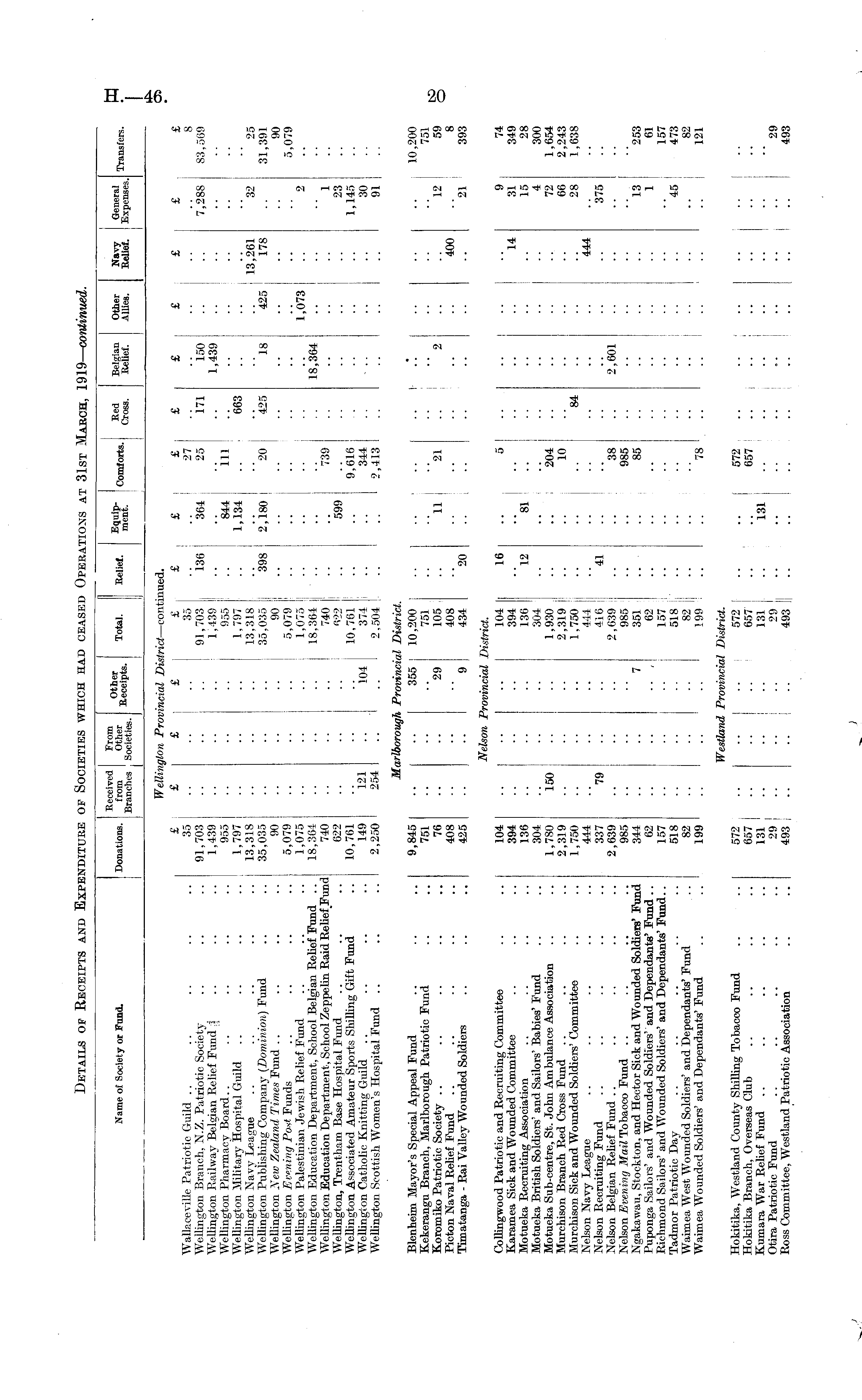 Name of Society or Fund. Donations. Received From from I Other Branches , Societies. Other Receipts. Total. ' BeHel Equip- Com{orts . Red Belgian Other Navy General t ment. | v -""" v,x "=- Cross. Relief. Allies. Relief. Expenses. +'•"""**'■ 1 WallaceviUe Patriotic Guild Wellington Branch, N.Z. Patriotic Society Wellington Railway Belgian Relief Fund i Wellington Pharmacy Board WeUington Military Hospital Guild Wellington Navy League WeUington Publishing Company (Dominion) Fund WeUington New Zealand Times Fund Wellington Even ing Post Funds WeUington Palestinian Jewish Relief Fund Wellington Education Department, School Belgian ReUef Fund .. WeUington Education Department, School ZeppeUn Raid ReUef Fund Wellington, Trentham Base Hospital Fund WeUington Associated Amateur Sports Shining Gift Fund WeUington Catholic Knitting Guild Wellington Scottish Women's Hospital Fund £ 35 91,703 1,439 955 1,797 13,318 35,035 90 5,079 1,075 18,364 740 622 10,761 149 2,250 Wellington Provincial District —continued. £ £ £ £ 1 £ , 35 1 91,703 136 1,439 955 1,797 13,318 35,035 398 90 5,079 1,075 18,364 740 10,701 121 .. 104 374 ; 254 ... .. 2.504 £ £ 27 364 25 844 ill 1,134 2 |180 20 .. 739 599 9,616 344 2,413 £ 171 663 425 £ 150 1,439 18 18,364 £ £ '.'. 13J261 425 178 '.'. £ £ 7,288 83,569 "32 25 31,391 90 5,079 2 23 1,145 30 91 Blenheim Mayor's Special Appeal Fund Kekerangu Branch, Marlborough Patriotic Fund Koromiko Patriotic Society Picton Naval ReUef Fund Timatanga - Rai Valley Wounded Soldiers 9,845 751 76 408 425 Marlborough Provincial District. 355 10,200 751 29 105 j 408 9 434 20 11 21 I- ' 2 400 10,200 751 12 59 21 393 Nelson Provincial District. CoUingwood Patriotic and Recruiting Committee Karamea Sick and Wounded Committee Motueka Recruiting Association Motueka British Soldiers' and Sailors' Babies' Fund Motueka Sub-centre, St. John Ambulance Association Murchison Branch Red Cross Fund Murchison Sick and Wounded Soldiers' Committee Nelson Navy League Nelson Recruiting Fund .. .. .. .. Nelson Belgian ReUef Fund Nelson Evening Mail Tobacco Fund Ngakawau, Stockton, and Hector Sick and Wounded Soldiers' Fund Puponga Sailors' and Wounded Soldiers' and Dependants' Fund .. Richmond Sailors' and Wounded Soldiers' and Dependants' Fund.. Tadmor Patriotic Day Waimea West Wounded Soldiers' and Dependants' Fund Waimea Wounded Soldiers' and Dependants' Fund .. .. ' 104 394 136 304 1,780 2,319 1,750 444 337 2,639 985 344 62 157 518 82 199 104 16 394 136 12 304 150 .. .. 1,930 2,319 1,750 444 .. 79 .. .. 416 : 41 2,639 j 985 7 351 .. , 62 .. 157 518 ". '.. 82 I .. 199 5 81 .. '.'. 204 10 '.'. "38 985 85 78 84 2,601 14 444 9 74 31 349 15 28 4 300 72 1,654 66 2,243 28 1,638 375 13 253 1 61 157 45 473 82 ..| 121 Hokitika, Westland County Shilling Tobacco Fund .. Hokitika Branch, Overseas Club Kumara War ReUef Fund Otira Patriotic Fund Ross Committee, Westland Patriotic Association 572 657 131 29 493 Westland Provincial District. .. I .. 572 ! 657 ! 131 ' 29 ! '.'. .'. '.'. 493 I! '.'. 572 657 131 .. 29 493