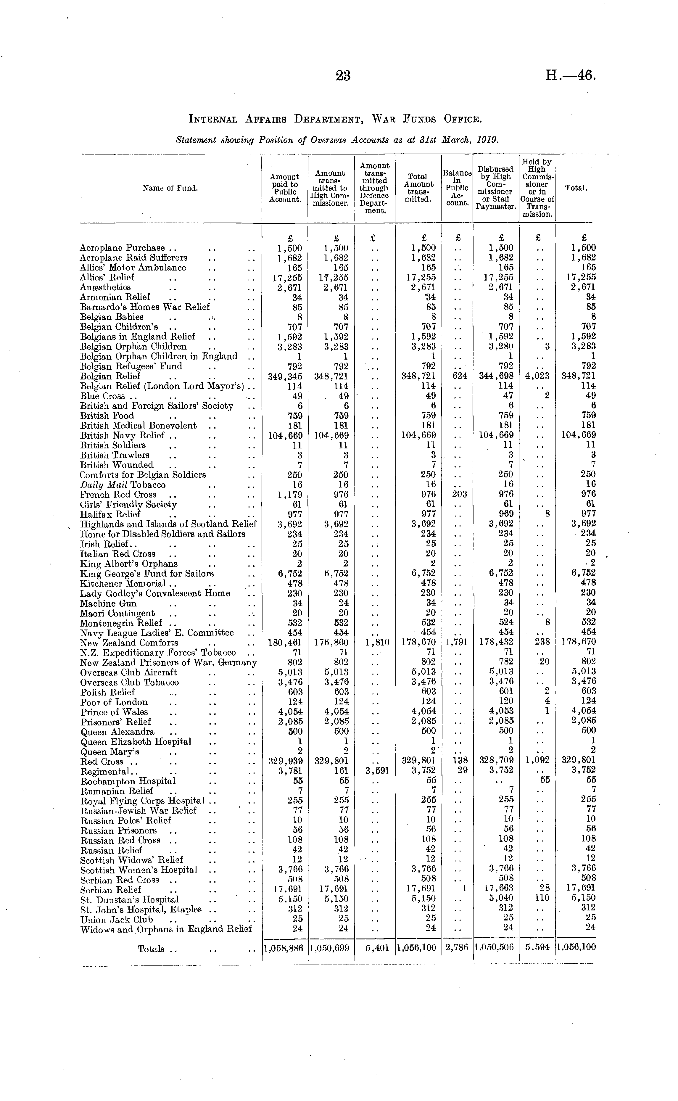 Name of Fund. Amount paid to Public Account. Amount transmitted to High Commissioner. Amount transmitted through Defence Department. Total Amount transmitted. Balance in Public Account. Disbursed by High Commissioner or Staff Paymaster. Held by High Commissioner or in Course of Transmission. Total. Aeroplane Purchase Aeroplane Raid Sufferers Allies' Motor Ambulance Allios' Relief Anaesthetics Armenian ReUef Barnardo's Homes War ReUof Belgian Babies .. . 1. Belgian Children's Belgians in England ReUef Belgian Orphan Children Belgian Orphan Children in England .. Belgian Refugees' Fund Belgian Relief Belgian Roliof (London Lord Mayor's) .. Blue Cross British and Foreign Sailors' Society British Food British Medical Benevolent British Navy Relief British Soldiers British Trawlers British Wounded Comforts for Belgian Soldiers Daily Mail Tobacco French Rod Cross Girls' Friondly Socioty Halifax Rolief Highlands and Islands of Scotland ReUef Homo for Disabled Soldiers and Sailors Irish Reliof Italian Rod Cross King Albert's Orphans King George's Fund for Sailors Kitchener Memorial Lady Godley's Convalescent Home Machine Gun Maori Contingent Montenegrin Relief Navy Loague Ladies' E. Committee Now Zoaland Comforts N.Z. Expeditionary Forces' Tobacco Now Zealand Prisonors of War, Germany Overseas Club Aircraft Overseas Club Tobacco Polish Relief Poor of London Princo of Wales Prisonors' RoUef Quoon Alexandra Queen Eliza both Hospital Queen Mary's Red Cross Regimental Roehampton Hospital Rumanian ReUef Royal Flying Corps Hospital Russian-Jewish War Relief .. Russian Polos' ReUef Russian Prisonors Russian Red Cross Russian Relief Scottish Widows' Relief Scottish Women's Hospital Serbian Red Cross Serbian Relief St. Dunstan's Hospital St. John's Hospital, Etaplcs Union Jack Club Widows and Orphans in England ReUef £ 1,500 1,682 165 17,255 2,671 34 85 8 707 1,592 3,283 1 792 349,345 114 49 6 759 181 104,069 11 3 7 250 16 1,179 61 977 3,692 234 25 20 2 6,752 478 230 34 20 532 454 180,461 71 802 5,013 3,476 603 124 4,054 2,085 500 1 2 329,939 3,781 55 7 255 77 1.0 50 108 42 12 3,766 508 17,691 5,150 312 25 24 £ 1,500 1,682 165 17,255 2,671 34 85 8 707 1,592 3,283 1 792 348,721 114 . 49 6 759 181 104,669 11 3 7 250 16 976 61 977 3,692 234 25 20 2 0,752 478 230 24 20 532 454 170,860 71 802 5,013 3,476 603 124 4,054 2,0-85 500 1 2 329,801 161 55 7 255 77 10 56 108 42 12 3,766 508 17,691 5,150 312 25 24 £ £ 1,500 1,682 165 17,255 2,671 34 85 8 707 1,592 3,283 1 792 348,721 114 49 6 759 181 104,669 11 3 7 250 10 976 61 977 3,692 234 25 20 2 6,752 478 230 34 20 532 454 178,670 71 802 5,013 3,476 603 124 4,054 2,085 500 1 2 329,801 3,752 55 7 255 77 10 50 108 42 12 3,766 508 1.7,691 5,150 312 25 24 024 203 £ £ 1,500 1 ,682 165 17,255 2,671 34 85 8 707 1,592 3,280 1 792 344,698 114 47 6 759 181 104,669 11 3 7 250 16 976 61 969 3,692 234 25 20 2 6,752 478 230 34 20 524 454 178,432 71 782 5,013 3,476 601 120 4,053 2,085 500 1 2 328,709 3,752 £ 3 4,023 "2 "8 £ 1,500 1,682 165 17,255 2,671 34 85 8 707 1,592 3,283 1 792 348,721 114 49 6 759 181 104,669 11 3 7 250 16 976 61 977 3,692 234 25 20 2 6,752 478 230 34 20 532 454 178,670 71 802 5,013 3,476 603 124 4,054 2,085 500 1 2 329,801 3,752 55 7 255 77 10 50 108 42 12 3,766 508 1 7,691 5,150 312 25 24 "8 1 *810 1,791 238 '.20 2 4 1 138 29 1,092 3^591 55 7 255 77 10 50 108 42 12 3,766 508 17,663 5,040 312 25 24 "l 28 110 Totals 1,058,886 1,050,699 5,401 1,066,100 2,786 jl, 050,500 5,594 1,056,100
