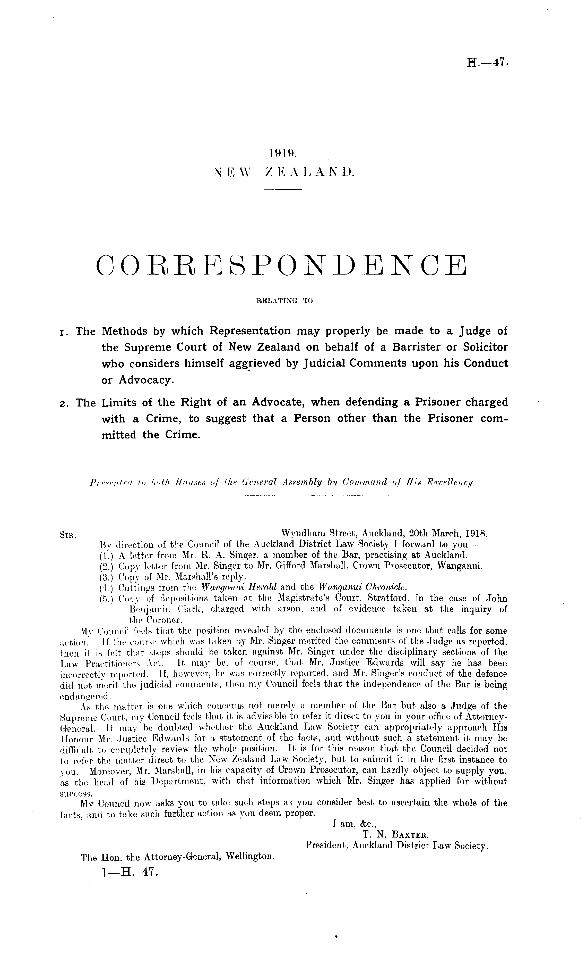 Presented to both Houses of the General Assembly by Command of His Excellency Sir, Wyndham Street, Auckland, 20th March, 1918. By direction of t v e Council of the Auckland District Law Society I forward to you—(l.) A letter from Mr. R. A. Singer, a member of the Bar, practising at Auckland. (2.) Copy letter from Mr. Singer to Mr. Gilford Marshall, Crown Prosecutor, Wanganui. (3.) Copy of Mr. Marshall's reply. (4.) Cuttings from the Wanganui Herald and the Wanganui Chronicle. (5.) Copy of depositions taken at the Magistrate's Court, Stratford, in the case of John Benjamin Clark, charged with arson, and of evidence taken at the inquiry of the Coroner. My Council feels that the position revealed by the enclosed documents is one that calls for some action. If the course which was taken by Mr. Singer merited the comments of the Judge as reported, then it is felt that steps should be taken against Mr. Singer under the disciplinary sections of the Law Practitioners Act. It may be, of course, that Mr. Justice Edwards will say he has been incorrectly reported. If, however, he was correctly reported, and Mr. Singer's conduct of the defence did not merit the judicial comments, then my Council feels that the independence of the Bar is being endangered. As the, matter is one which concerns not merely a member of the Bar but also a Judge of the Supreme Court, my Council feels that it is advisable to refer it direct to you in your office of AttorneyGeneral. It may be doubted whether the Auckland Law Society can appropriately approach His Honour Mr. Justice Edwards for a statement of the facts, and without such a statement it may be difficult to completely review the whole position. It is for this reason that the Council decided not to refer the matter direct to the New Zealand Law Society, but to submit it in the first instance to you. Moreover, Mr. Marshall, in his capacity of Crown Prosecutor, can hardly object to supply you, as the head of his Department, with that information which Mr. Singer has applied for without success. My Council now asks you to take such steps as you consider best to ascertain the whole of the facts, and to take such further action as you deem proper. I am, &c, T. N. Baxter, President, Auckland District Law Society. The Hon. the Attorney-General, Wellington.