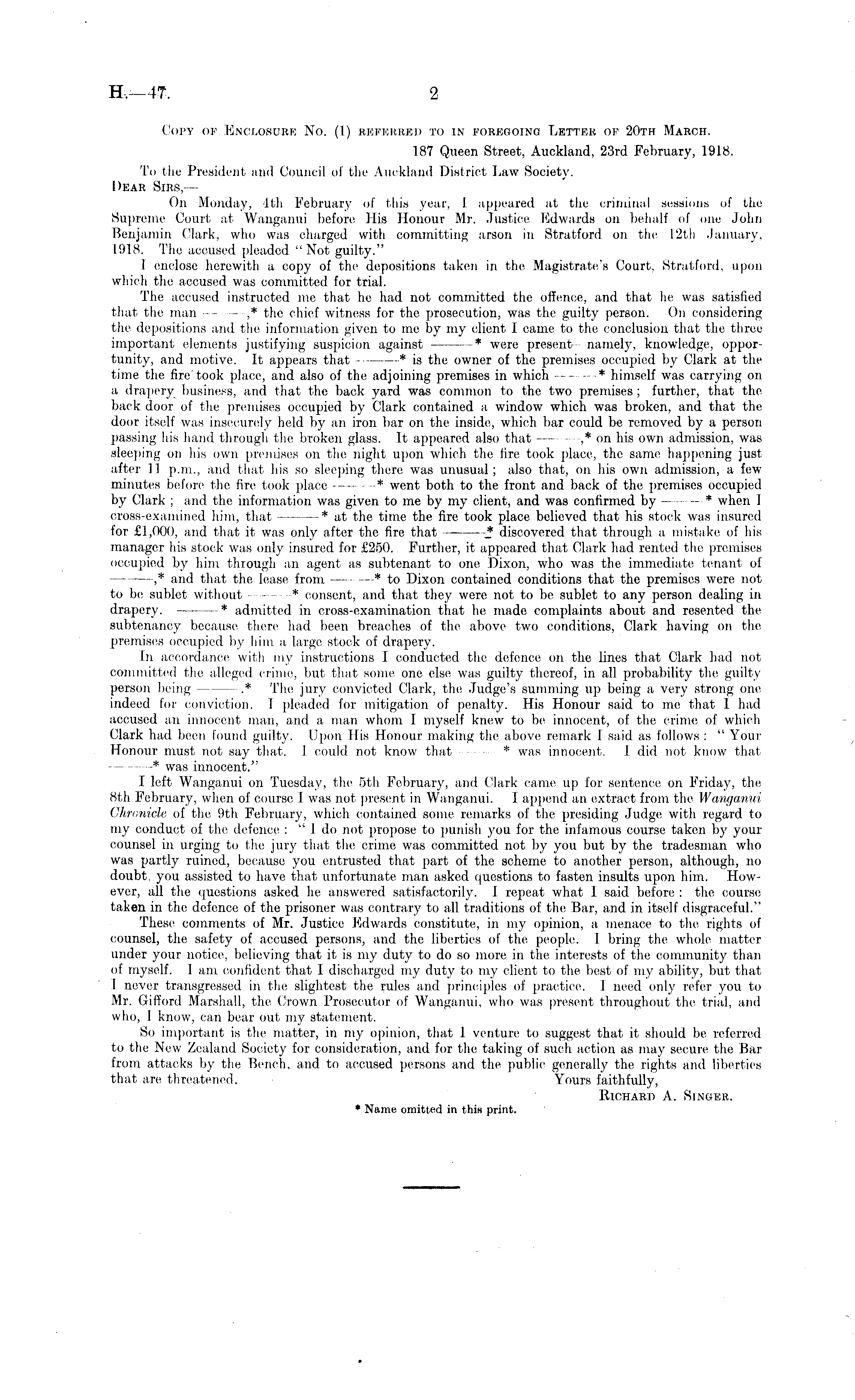 Copy op Enclosure No. (1) rbferrbd to in foregoing Letter op 20th March. 187 Queen Street, Auckland, 23rd February, 1918. To the President and Council of the Auckland District Law Society. Dear Sirs, — On Monday, 4th February of this year, I appeared at the criminal sessions of the Supreme Court at Wanganui before His Honour Mr. Justice Edwards on behalf of one John Benjamin Clark, who was charged with committing arson in Stratford on the 12th January, 1918. The accused pleaded "Not guilty." 1 enclose herewith a copy of the depositions taken in the, Magistrate's Court, Stratford, upon which the accused was committed for trial. The accused instructed me that he had not committed the offence, and that he was satisfied that the man — —,* the chief witness for the prosecution, was the guilty person. On considering the depositions and the information given to me by my client I came to the conclusion that the three important elements justifying suspicion against * were present- namely, knowledge, opportunity, and motive. It appears that - —* is the owner of the premises occupied by Clark at the time the fire'took place, and also of the adjoining premises in which — * himself was carrying on a drapery business, and that the back yard was common to the two premises ; further, that the back door of the premises occupied by Clark contained a window which was broken, and that the door itself was insecurely held by an iron bar on the inside, which bar could be removed by a person passing his hand through the broken glass. It appeared also that — ,* on his own admission, was sleeping on his own premises on the night upon which the fire took place, the same happening just after 11 p.m., and that his so sleeping there was unusual ; also that, on his own admission, a few minutes before the fire took place * went both to the front and back of the premises occupied by Clark ; and the information was given to me by my client, and was confirmed by — - * when 1 cross-examined him, that — — * at the time the fire took place believed that his stock was insured for £1,000, and that it was only after the fire that * discovered that through a mistake of his manager his stock was only insured for £250. Further, it appeared that Clark had rented the premises occupied by him through an agent as subtenant to one Dixon, who was the immediate tenant of ,* and that the lease from —* to Dixon contained conditions that the premises were not to be sublet without * consent, and that they were not to be sublet to any person dealing in drapery. — * admitted in cross-examination that he made complaints about and resented the subtenancy because there had been breaches of the above two conditions, Clark having on the premises occupied by him a large stock of drapery. In accordance with my instructions I conducted the defence on the lines that Clark had not committed the alleged crime, but that some one else was guilty thereof, in all probability the guilty person being — — -.* The jury convicted Clark, the Judge's summing up being a very strong one indeed for conviction. I pleaded for mitigation of penalty. His Honour said to me that I had accused an innocent man, and a man whom I myself knew to be innocent, of the crime of which Clark had been found guilty. Upon His Honour making the above remark I said as follows : " Your Honour must not say that. I could not know that * was innocent. 1 did not know that * was innocent." I left Wanganui on Tuesday, the sth February, and Clark came up for sentence on Friday, the Bth February, when of course I was not, present in Wanganui. I append an extract from the Wanganui Chronicle of the 9th February, which contained some remarks of the presiding Judge with regard to my conduct of the defence : " I do not propose to punish you for the infamous course taken by your counsel in urging to the jury that the crime was committed not by you but by the tradesman who was partly ruined, because you entrusted that part of the scheme to another person, although, no doubt, you assisted to have that unfortunate man asked questions to fasten insults upon him. However, all the questions asked he answered satisfactorily. I repeat what I said before : the course taken in the defence of the prisoner was contrary to all traditions of the Bar, and in itself disgraceful." These comments of Mr. Justice Edwards constitute, in my opinion, a menace to the rights of counsel, the safety of accused persons, and the liberties of the people. I bring the whole matter under your notice, believing that it is my duty to do so more in the interests of the community than of myself. lam confident that I discharged my duty to my client to the best of my ability, but that, I never transgressed in the slightest the rules and principles of practice. I need only refer you to Mr. Gifford Marshall, the Crown Prosecutor of Wanganui, who was present throughout the trial, and who, I know, can bear out my statement. So important is the matter, in my opinion, that 1 venture to suggest that it should be referred to the New Zealand Society for consideration, and for the taking of such action as may secure the Bar from attacks by the Pencil, and to accused persons and the public generally the rights and liberties that are threatened. Yours faithfully, Richard A. Singer. * Name omitted in this print.