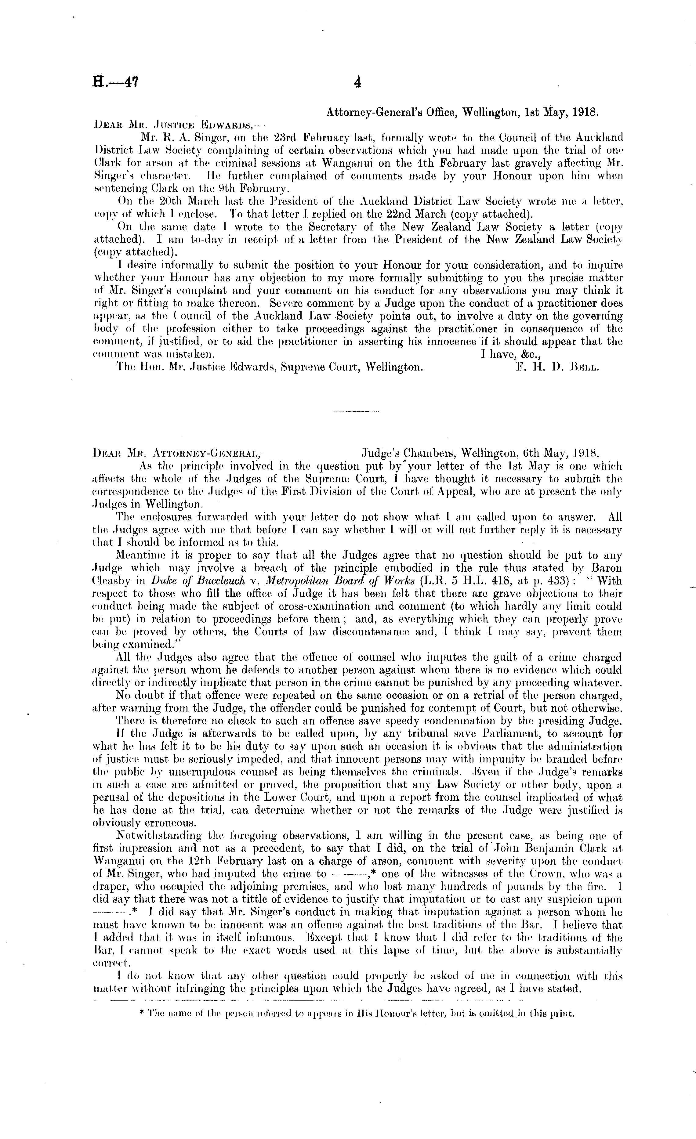 Attorney-General's Office, Wellington, Ist May, 1918. Dear Mr. Justice Edwards, Mr. 11. A. Singer, on the 23rd February last, formally wrote to the Council of the Auckland District Law Society complaining of certain observations which you had made upon the trial of one Clark for arson at the criminal sessions at Wanganui on the 4th February last gravely affecting Mr. Singer's character. He further complained of comments made by your Honour upon him when sentencing Clark on the 9th February. On the 20th March last the President of the Auckland District Law Society wrote me a letter. copy of which J enclose. To that letter I. replied on the 22nd March (copy attached). On the same date I wrote to the, Secretary of the New Zealand Law Society a letter (copy attached). 1 am to-day in receipt of a letter from the Piesident of the New Zealand Law Society (copy attached). I desire informally to submit the position to your Honour for your consideration, and to inquire whether your Honour has any objection to my more formally submitting to you the precise matter of Mr. Singer's complaint and your comment on his conduct for any observations you may think it right or fitting to make thereon. Severe comment by a Judge upon the conduct of a practitioner does appear, as the ( ouncil of the Auckland Law Society points out, to involve a duty on the governing body of the profession either to take proceedings against the practitioner in consequence of the comment, if justified, or to aid the practitioner in asserting his innocence if it should appear that, the, comment was mistaken. I have, &c, The lion. Mr. Justice Fdwards, Supreme Court, Wellington. F. 11. D. Bell. Dear Mr. Attorney-General, Judge's Chambers, Wellington, 6th May, 1918. As the principle involved in the question put by'your letter of the Ist May is one which affects the, whole of the Judges of the Supreme Court, 1 have thought it necessary to submit the correspondence to the Judges of the First Division of the Court of Appeal, who are at present the only Judges in Wellington. The enclosures forwarded with your letter do not show what lam called upon to answer. All the Judges agree with me that before, I can say whether I will or will not, further reply it is necessary that I should be informed as to this. Meantime it is proper to say that all the Judges agree that no question should be put to any Judge which may involve, a, breach of the principle embodied in the rule thus stated by Baron Cleasby in Duke of Bucdeuch v. Metropolitan Board, of Works (L.R. 5 H.L. 418, at p. 433) : " With respect to those who fill the office of Judge it has been felt that there are grave objections to their conduct being made the subject, of cross-examination and comment (to which hardly any limit could be put) in relation to proceedings before them ; and, as everything which the)- can properly prove can be proved by others, the Courts of law discountenance and, I think 1 may say, prevent, them being examined." All the Judges also agree that the offence of counsel who imputes the guilt, of a, crime charged against the person whom he defends to another person against whom there is no evidence which could directly or indirectly implicate that person in the crime cannot be punished by any proceeding whatever. No doubt if that offence were repeated on the same occasion or on a retrial of the person charged, after warning from the Judge, the offender could be punished for contempt of Court, but not otherwise. There is therefore no check to such an offence, save speedy condemnation by the presiding Judge. If the Judge is afterwards to be called upon, by any tribunal save Parliament, to account for what he has felt it to be his duty to say upon such an occasion it is obvious that the administration of justice must be seriously impeded, and that innocent persons may with impunity be, branded before the public by unscrupulous counsel as being themselves the criminals. Even if the Judge's remarks in such a case are admitted or proved, the proposition, that any Law Society or other body, upon a, perusal of the depositions in the Lower Court, and upon a report from the counsel implicated of what he has done at the trial, can determine whether or not the remarks of the Judge were justified is obviously erroneous. Notwithstanding the foregoing observations, 1 am willing in the present case, as being one of first impression and not as a precedent, to say that I did, on the trial of John Benjamin Clark at Wanganui on the 12th February last on a charge of arson, comment with severity upon the conduct, of Mr. Singer, who had imputed the crime to ,* one of the witnesses of the Crown, who was a draper, who occupied the adjoining premises, and who lost many hundreds of pounds by the lire. 1 did say that there was not a tittle of evidence to justify that imputation or to cast any suspicion upon .* I did say that Mr. Singer's conduct in making that imputation against a person whom he must have known to be innocent was an offence against the best traditions of the Bar. I believe that 1 added that it was in itself infamous. Except that I know that, I did refer to the traditions of the Bar, I cannot speak to (he exact, words used at this lapse of lime, but the above is substantially correct. I do not know that any other question could properly be asked of me in connection with this matter without infringing the principles upon which the Judges have agreed, as I have stated. * The name of the person referred to appears in His Honour's letter, but is omitted in tins print.