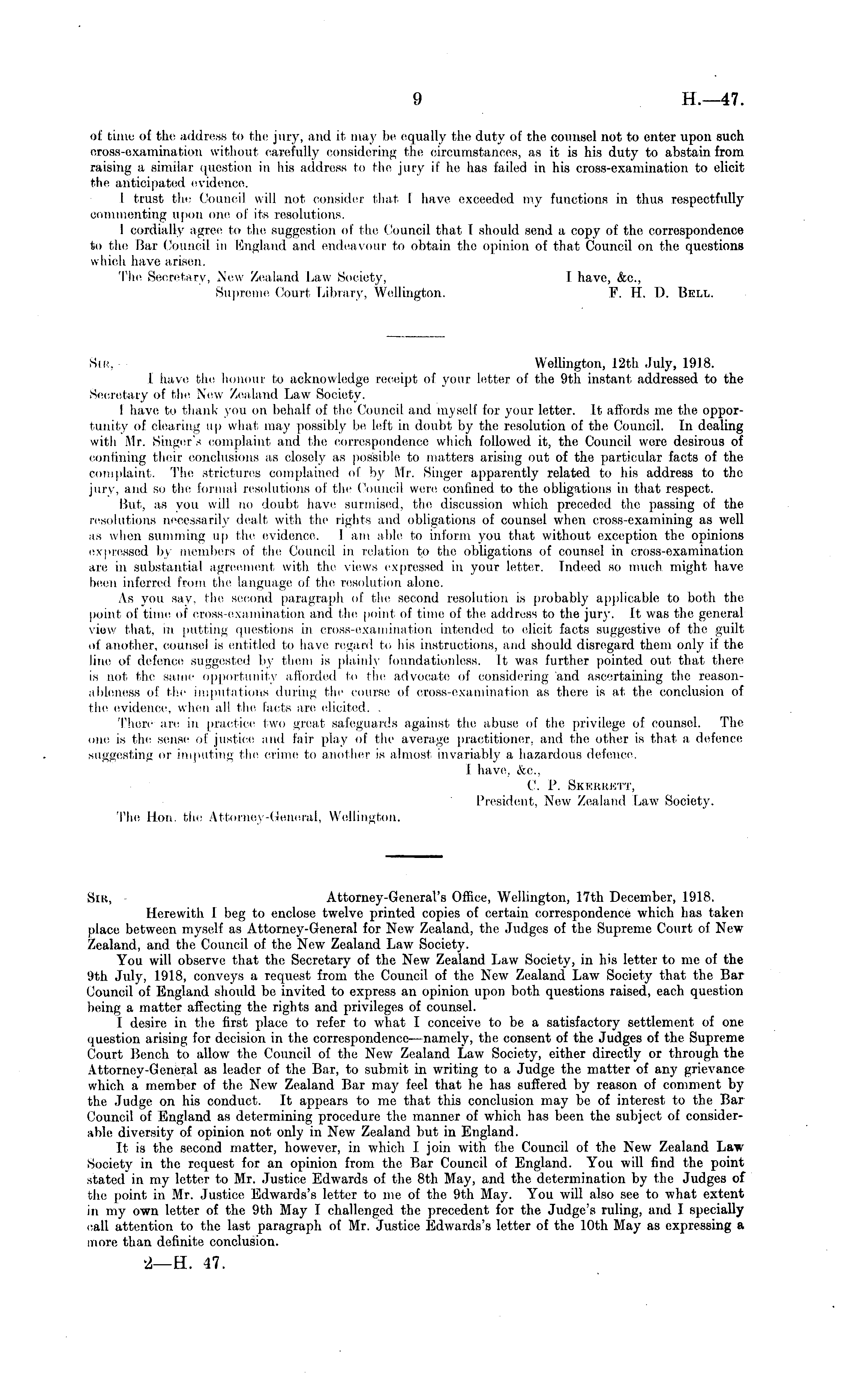 of time of the address to the jury, and it may be equally the duty of the counsel not to enter upon such cross-examination without carefully considering the circumstances, as it is his duty to abstain from raising a similar question in his address to the jury if he has failed in his cross-examination to elicit the anticipated evidence. I trust the Council will not consider that, I have exceeded my functions in thus respectfully commenting upon one of its resolutions. I cordially agree to the suggestion of the Council that I should send a copy of the, correspondence to the Bar Council in England and endeavour to obtain the opinion of that Council on the questions which have arisen. The, Secretary, New Zealand Law Society, I have, &c, Supreme Court, Library, Wellington. F. H. D. Bell. Sir, Wellington, 12th July, 1918. I have the honour to acknowledge receipt of your letter of the 9th instant, addressed to the Secretary of the New Zealand Law Society. I have to thank you on behalf of the Council and myself for your letter. It affords me the opportunity of clearing up what may possibly be left in doubt by the resolution of the Council. In dealing with Mr. Singer's complaint and the correspondence which followed it, the Council wore desirous of confining their conclusions as closely as possible to matters arising out of the particular facts of the complaint. The strictures complained of by Mr. Singer apparently related to his address to the jury, and so the formal resolutions of the Council were confined to the obligations in that respect. But, as you will no doubt have surmised, the discussion which preceded the passing of the resolutions necessarily dealt, with the rights and obligations of counsel when cross-examining as well as when summing up the evidence. lam able to inform you that without exception the opinions expressed by members of the Council in relation to the obligations of counsel in cross-examination are in substantial agreement with the views expressed in your letter. Indeed so much might have been inferred from the language of the resolution alone. As you say, the second paragraph of the second resolution is probably applicable to both the point of time of cross-examination and the point of time of the. address to the jury. It was the general view that, in putting questions in cross-examination intended to elicit facts suggestive of the guilt of another, counsel is entitled to have regard to his instructions, and should disregard them only if the line of defence suggested by them is plainly fonndationless. It was further pointed out that there is not the same opportunity afforded to the advocate of considering 'and ascertaining the reasonableness of the imputations during the course of cross-examination as there is at the conclusion of the evidence, when all the facts are elicited. . There an; in practice two great safeguards against tfie abuse of the privilege of counsel. The one is the sense of justice and fair play of the average practitioner, and the other is that a defence suggesting or imputing the crime to another is almost invariably a hazardous defence. I have, &c, C. P. Skerrett, President, New Zealand Law Society. The Hon. the Attorney-General, Wellington. Sir, — Attorney-General's Office, Wellington, 17th December, 1918. Herewith I beg to enclose twelve printed copies of certain correspondence which has taken place between myself as Attorney-General for New Zealand, the Judges of the Supreme Court of New Zealand, and the Council of the New Zealand Law Society. You will observe that the Secretary of the New Zealand Law Society, in his letter to me of the 9th July, 1918, conveys a request from the Council of the New Zealand Law Society that the Bar Council of England should be invited to express an opinion upon both questions raised, each question being a matter affecting the rights and privileges of counsel. I desire in the first place to refer to what I conceive to be a satisfactory settlement of one question arising for decision in the correspondence—namely, the consent of the Judges of the Supreme Court Bench to allow the Council of the New Zealand Law Society, either directly or through the Attorney-General as leader of the Bar, to submit in writing to a Judge the matter of any grievance which a member of the New Zealand Bar may feel that he has suffered by reason of comment by the Judge on his conduct. It appears to me that this conclusion may be of interest to the Bar Council of England as determining procedure the manner of which has been the subject of considerable diversity of opinion not only in New Zealand but in England. It is the second matter, however, in which I join with the Council of the New Zealand Law Society in the request for an opinion from the Bar Council of England. You will find the point stated in my letter to Mr. Justice Edwards of the Bth May, and the determination by the Judges of the point in Mr. Justice Edwards's letter to me of the 9th May. You will also see to what extent in my own letter of the 9th May I challenged the precedent for the Judge's ruling, and I specially call attention to the last paragraph of Mr. Justice Edwards's letter of the 10th May as expressing a more than definite conclusion.