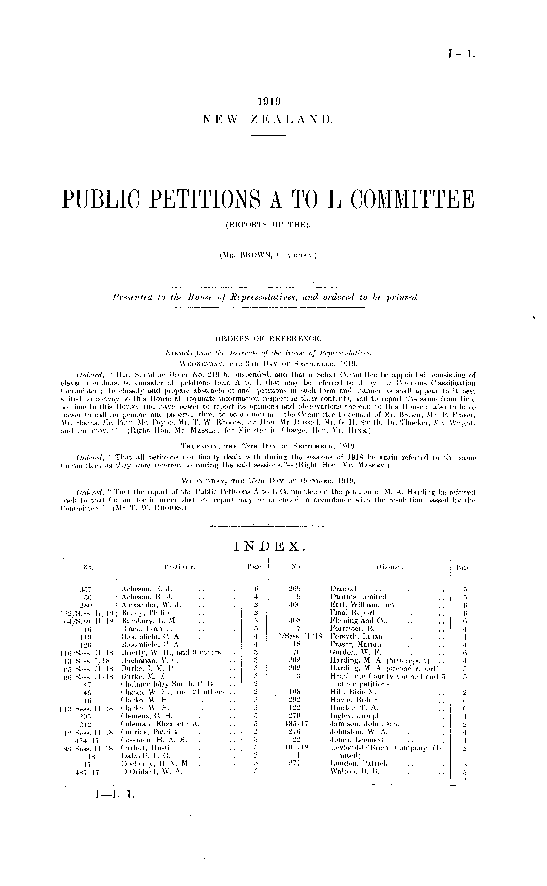 ORDERS OK REFERENCE. Extracts from the Journals of fJi.e House of Representatives. Wednesday, the 3ed Dai ok Septbmbeh, 1919. Ordered, "That Standing Order No. 21!) be suspended, and that a Select Committee be appointed, consisting of eleven members, to consider all petitions from A to L that may be referred to it by the Petitions Classification Committee ; to classify and prepare abstracts of such petitions in such form and manner as shall appear to it best suited to convey to this House all requisite information respecting their contents, and to report the same from time to time, to this House, and have power to report its opinions and observations thereon to this Horrse ; also to have power' to call for - persons arid papers; three to be a quorum : the Committee to consist of Mr. Brown, Mi - . P. Fraser, Mr. Harris, Mr-. Parr, Mr. Payne, Mr. T. W. Rhodes, the Hon. Mr. Russell, Mr-. C. 11. Smith, Dr. Thaoker, Mr. Wright, and the mover." —(Right Hon. Mr. M.ASBKY, for Minister in Charge, Hon. Mr. Hine.) Thursday, the 25th Day of September, 1!)1!). Ordered, "That all petitions not finally dealt with during the sessions of 1918 be again referred to the same Committees as they were referred to during the said sessions."--(Right Hon. Mr. Mass icy.) Wednesday, the 15th Day ok October, 1919. Ordered, "That- the report of the Public Petitions A to L Committee on the petition of M. A. Harding be referred back to that Committee in order that the report may be amended in accordance with the resolution passed by the Committee." -(Mr. T. W. Rhodes.)