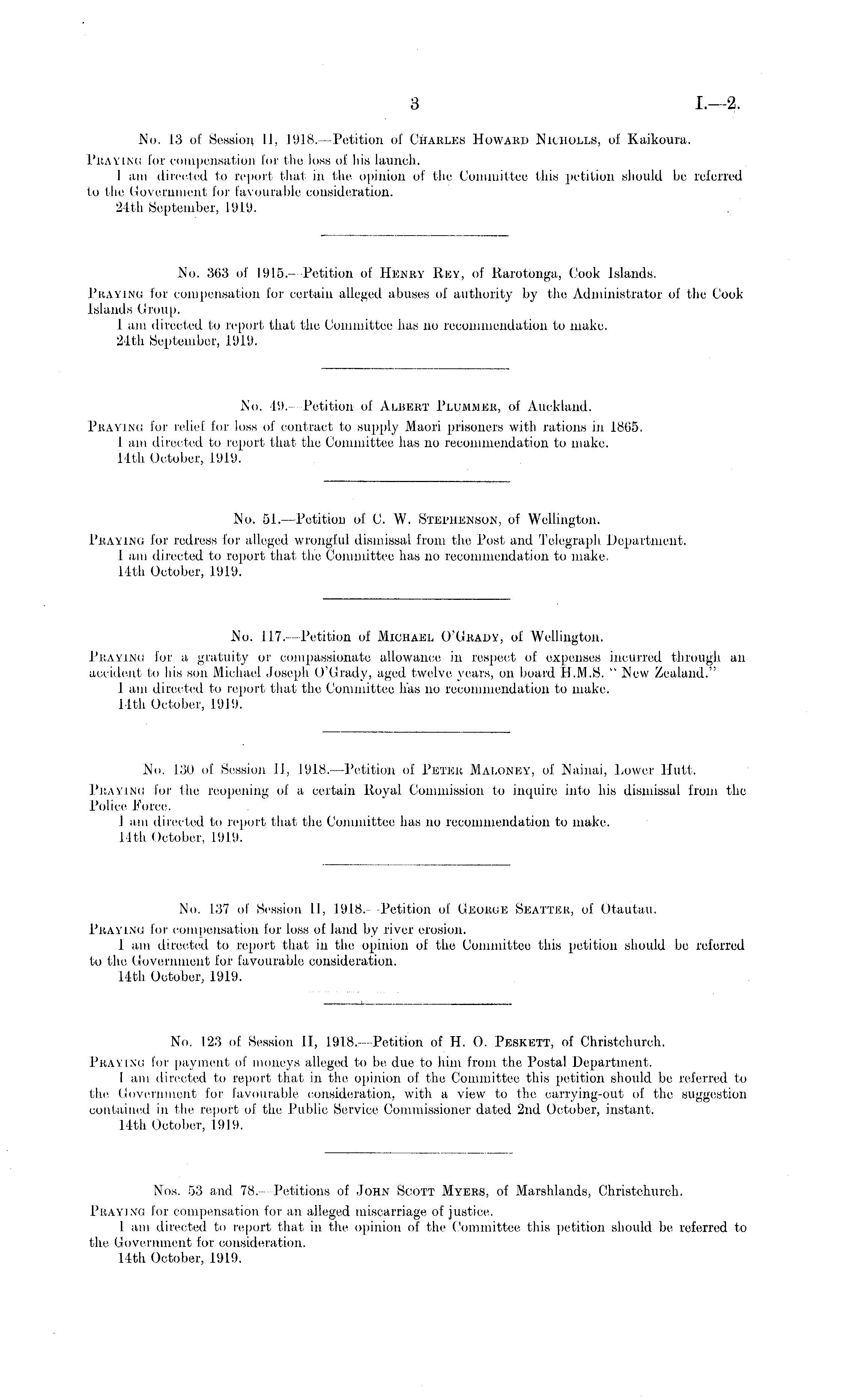 No. 13 of Session 11, 1918.— Petition of CHARLES HOWARD NICHOLLS, of Kaikoura. Praying for compensation for the loss of his launch. I am directed to report that in the opinion of the Committee this petition should be referred to the. Government lor favourable consideration. 24th September, 1919.