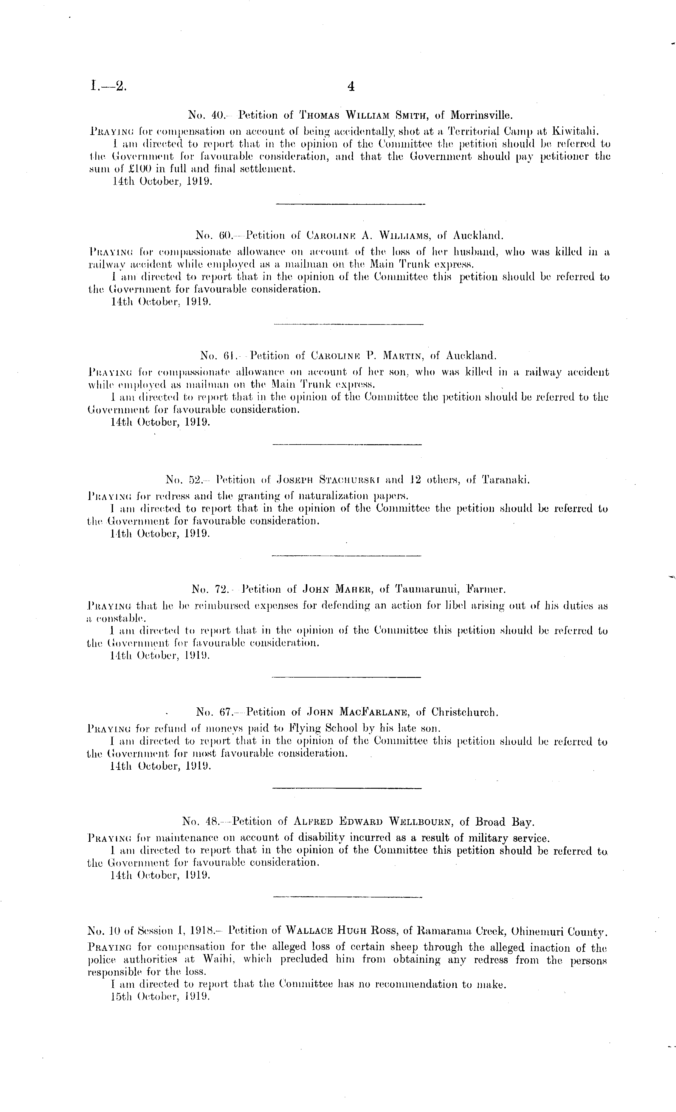 No. 40. Petition of Thomas William Smith, of Morrinsville. Praying for compensation on account of being accidentally shot at a, Territorial Camp at Kiwitahi. 1 am directed to report that in the opinion of the Committee the petition should be. referred to the Government lor favourable consideration, and that the Government should pay petitioner the sum of £100 in full and final settlement. 14th October, 1919.