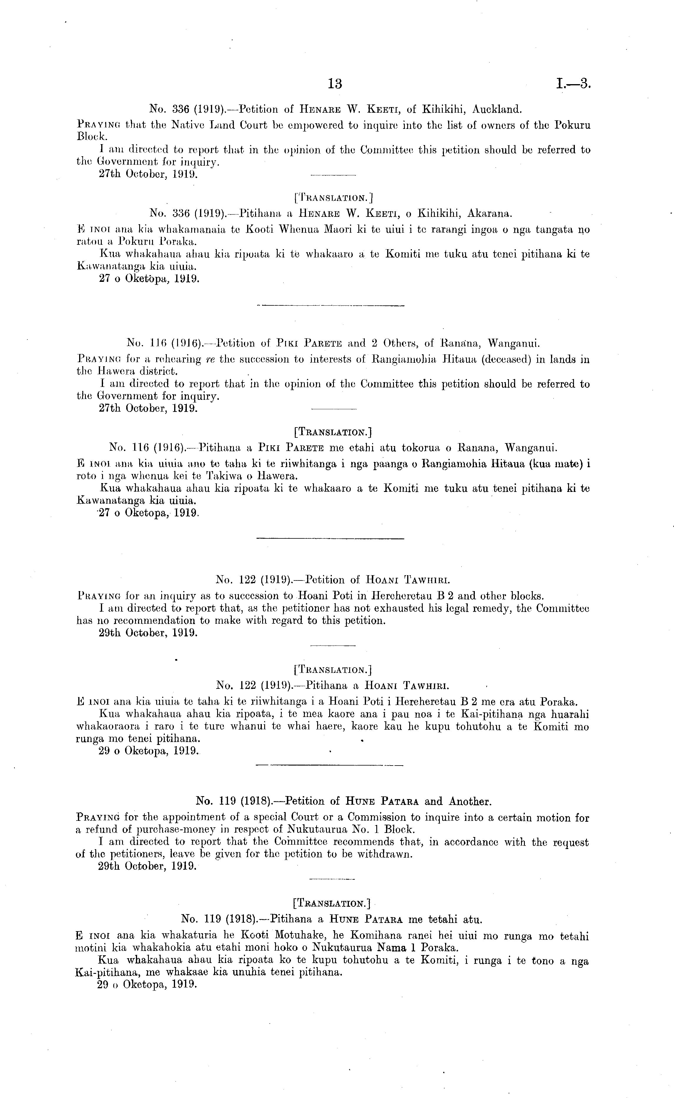 No. 336 (1919).—Petition of Henare W. Keeti, of Kihikihi, Auckland. Praying that the Native Land Court be empowered to inquire into the list of owners of the Pokuru Block. I am directed to report thai, in the opinion of the Committee this petition should be referred to the Government for inquiry. 27th October, 1919. [Translation.] No. 336 (1919).—Pitihana a, Henare W. Keeti, o Kihikihi, Akarana. E inoi ana, kia whakamanaia te Kooti Whenua Maori kite uiui i te rarangi ingoa o nga tangata no ratou a, Pokuru Poraka. Kua whakahaua ahau kia ripoata kite whakaaro a te Komiti me tuku atu tenei pitihana kite Kawanatanga kia uiuia. 27 o Oketopa, 1919.