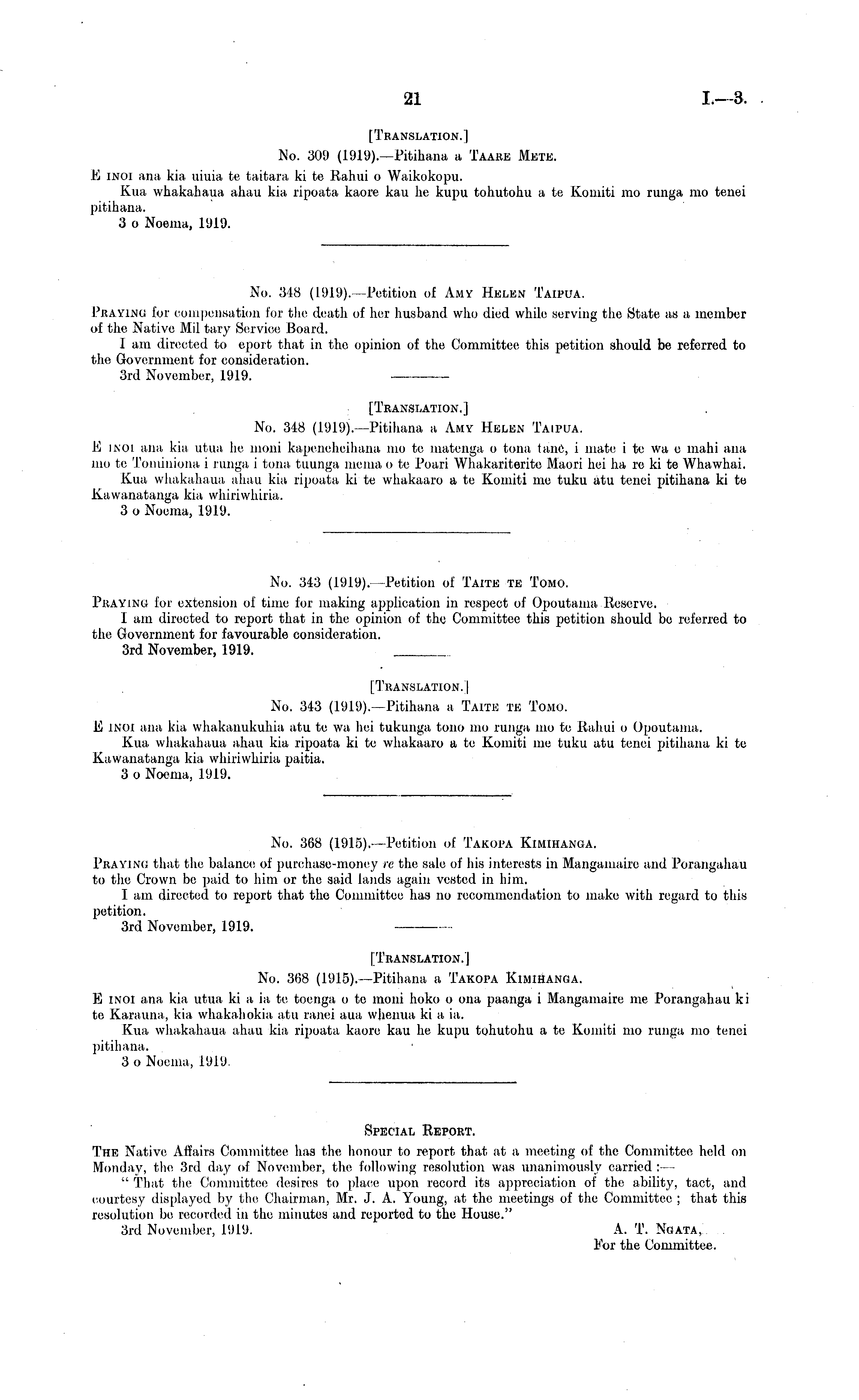 No. 343 (1919).—Petition of Taite te Tomo. Praying for extension of time for making application in respect of Opoutama Reserve. I am directed to report that in the opinion of the Committee this petition should bo referred to the Government for favourable consideration. 3rd November, 1919. [Translation.] No. 343 (1919).—Pitihana a Taitis te Tomo. E INOI ana kia whakanukuhia atu te wa hei tukunga tono mo runga mo te Rahui o Opoutama. Kua whakahaua ahau kia ripoata kite whakaaro a te Komiti me tuku atu tenei pitihana kite Kawanatanga kia whiriwhiria paitia. 3 o Noema, 1919.