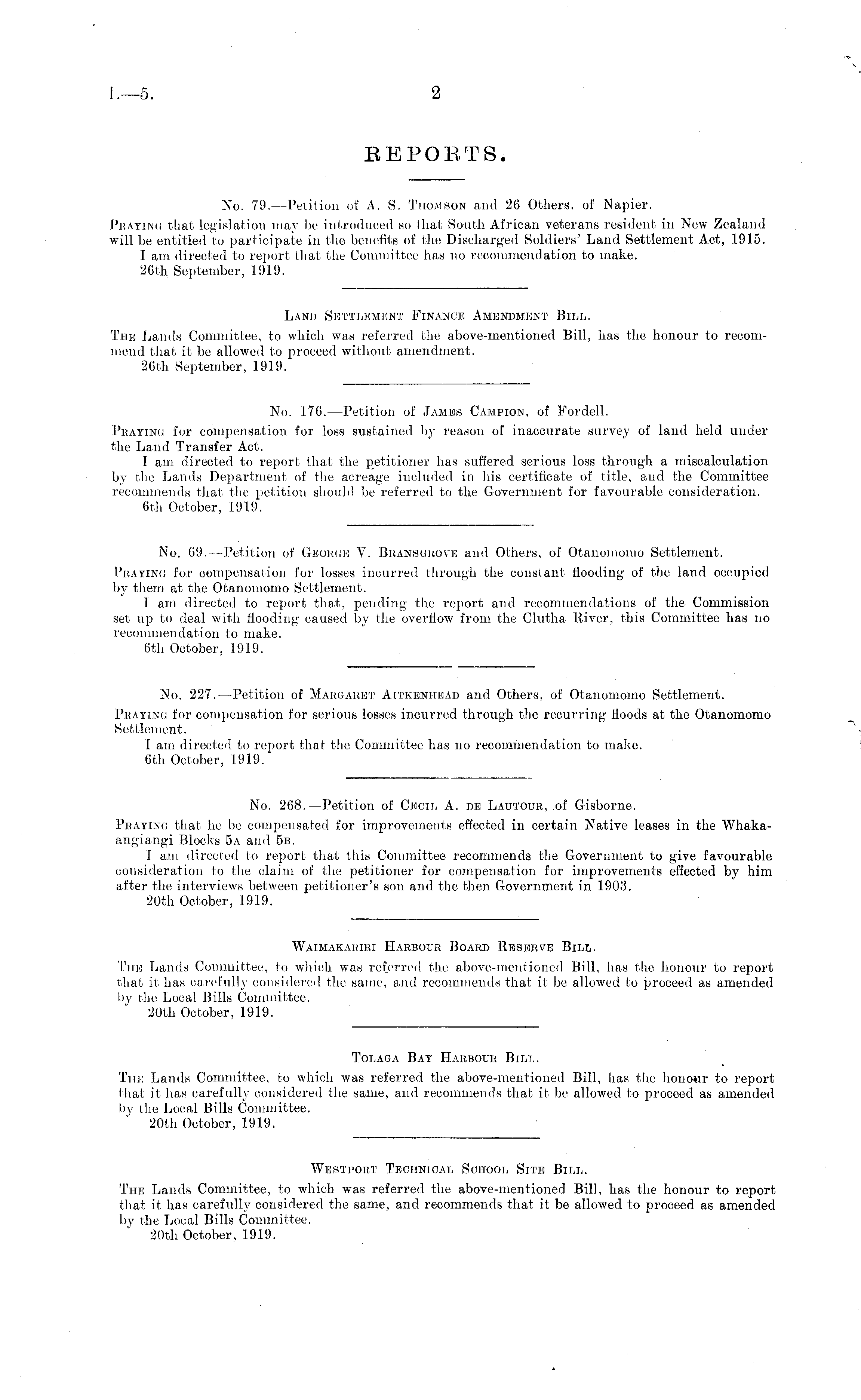 REPORTS. No. 79, —Petition of A. S. Thomson and 26 Others, of Napier. Praying that legislation may be in trod need so that South African veterans resident in New Zealand will be entitled to participate in the benefits of the Discharged Soldiers' Land Settlement Act, 1915. I am directed to report, that, the Committee has no recommendation to make. 26th September, 1919.
