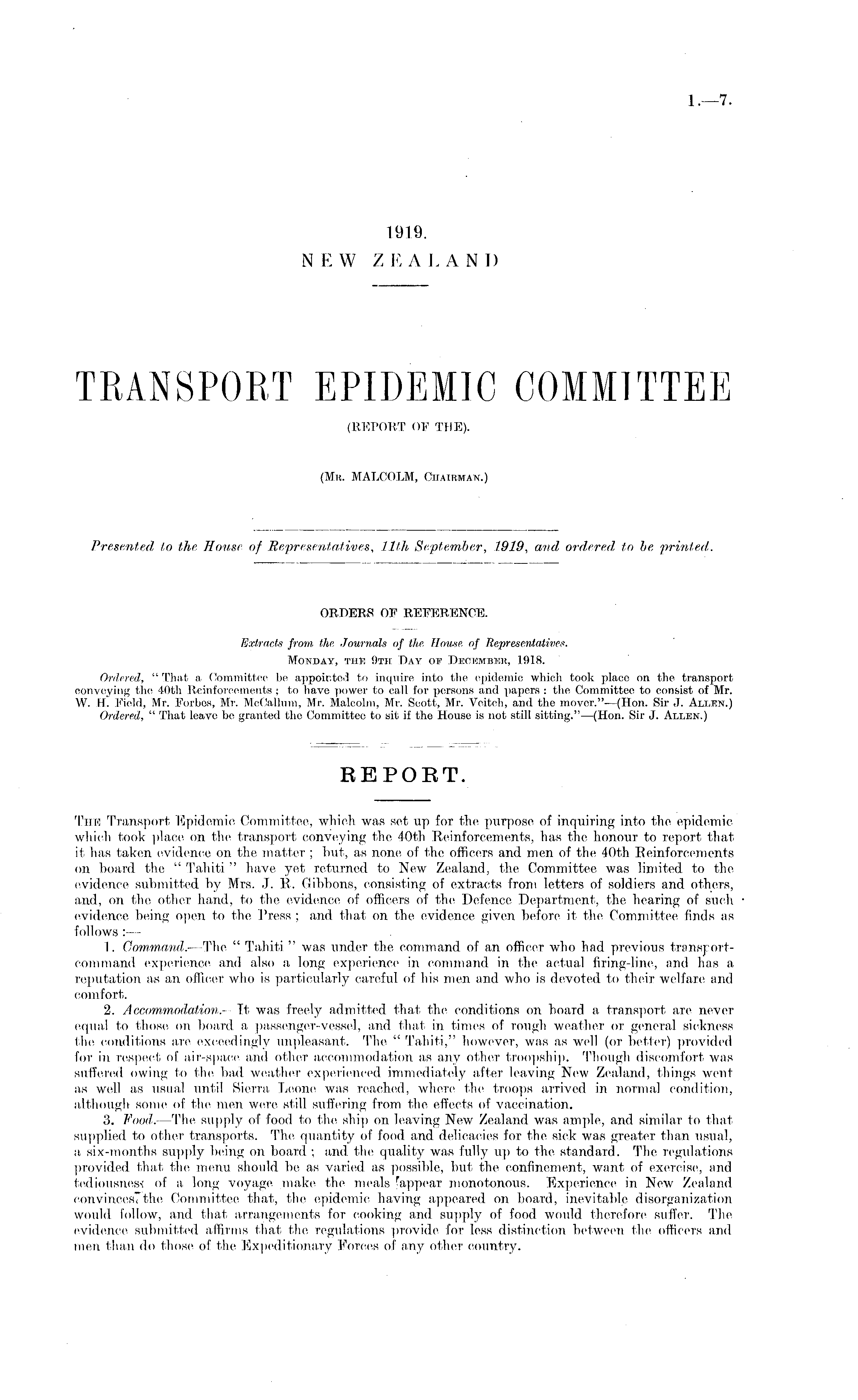 ORDERS OF REFERENCE. Extracts from the Journals of the. House of "Representatives. Monday, the 9th Day of Deoembbr, 1918. Ordered, " That a Committee be appointed to inquire into the epidemic which took place on the transport conveying tho 40th Reinforcements ; to have power to call for persons and papers : the. Committee to consist of Mr. W. H. Field, Mr. Forbes, Mr. McCallum, Mr. Malcolm, Mr. Scott, Mr. Voitch, and the mover."—(Hon. Sir J. Allen.) Ordered, " That leave be granted the Committee to sit if the House is not still sitting."—(Hon. Sir J. Allen.)