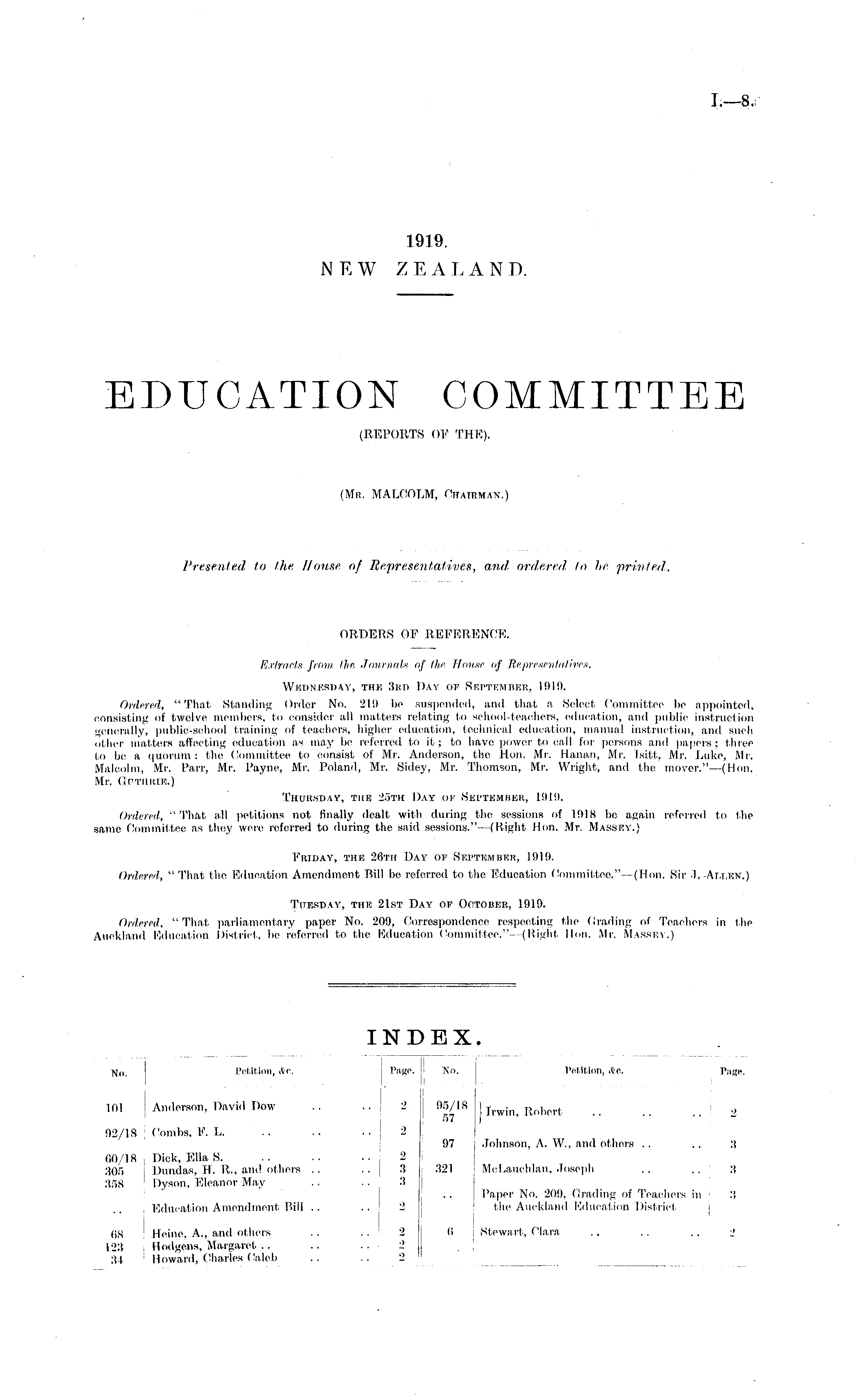 ORDERS OF REFERENCE. Extracts from the. Journals of the House of Representatives. Wednesday, the 3»d Day of September, 1919. Ordered, "That Standing Order No. 219 be suspended, and that a Select Committee be appointed, consisting of twelve members, to consider all matters relating to school-teachers, education, and public instruction generally, public-school training of teachers, higher education, technical education, manual instruction, and such other matters affecting education as may be referred to it; to have power to call for persons and papers; three to be a quorum.! the Committee to consist of Mr. Anderson, the Hon. Mr. Hanan, Mr. Isitt, Mr. Luke, Mi. Malcolm, Mr. Parr, Mr. Payne, Mr. Poland, Mr. Sidey, Mr. Thomson, Mr. Wright, and the mover." —(Hon. Mr. Guthrie.) Thursday, the 25th Day ok September, 1919. Ordered, "That all petitions not finally dealt with during the sessions of 1918 be again referred to the same Committee as they were referred to during the said sessions." —(Right Hon. Mr. Massey.) Friday, the 26th Day of September, 1919. Ordered, " That the Education Amendment Bill be referred to the Education Committee."—(Hon. Sir -1. -Allen.) Tuesday, the 21st Day of October, 1919. Ordered, " That parliamentary papor No. 209, Correspondence respecting the Grading of Teachers in the Auckland Education District, be referred to the Education Committee."- (Right lion. Mr. Massey.)