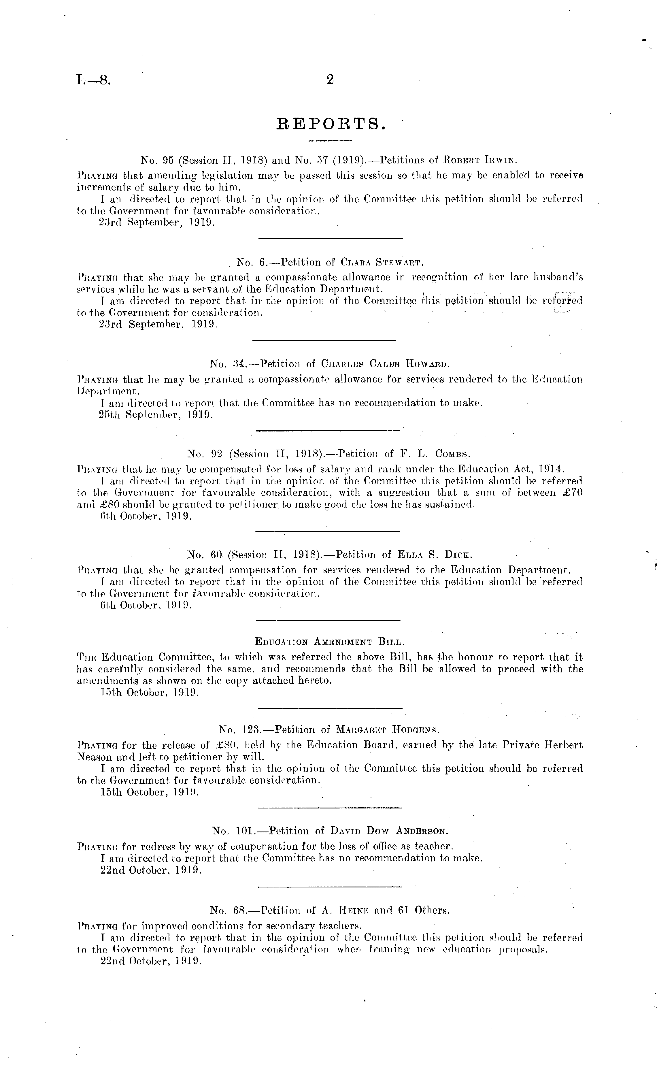 REPORTS. No. 95 (Session 11, 1918) and No. 57 (191 9).—Petitions of Robert Frwin. Prating that amending legislation may be passed this session so that he may be enabled to receive increments of salary due to him. I am directed to report: that in the opinion of the Committee this petition should be referred to the Government for favourable consideration. 23rd September, 1919,