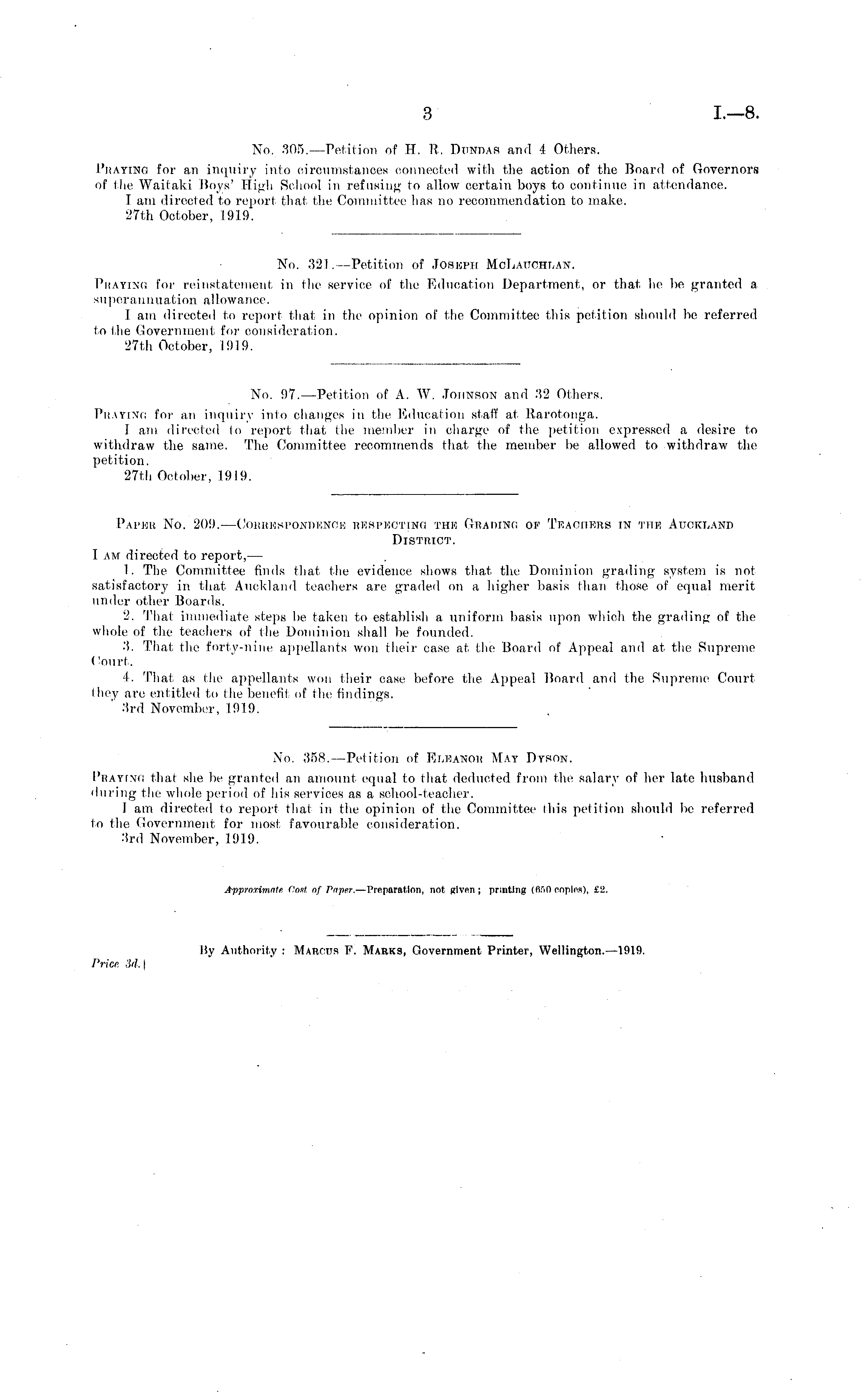 No. 305. —Petition of H. R. DtJNDAS and 4 Others. Prating for an inquiry into circumstances connected with the action of the Board of Governors of the Wailaki Boys' High School in refusing to allow certain boys to continue in attendance. I am directed to report that the Committee has no recommendation to make. 27th October, 1919.