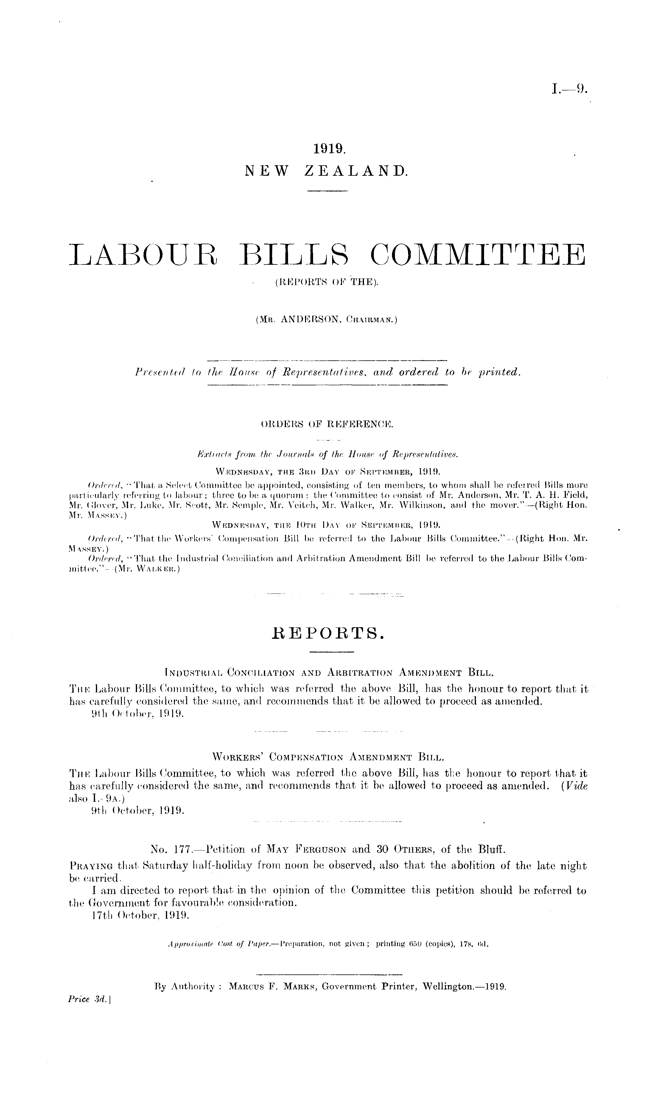 ORDERS OF REFERENCE. Extracts from the Journals of the House of Representatives. Wednesday, the 3rd Day of September, 1919. Ordered, " That a Select Committee be appointed, consisting of ten members, to whom shall be referred Bills more particularly referring to labour; three to be a quorum : the Committee to consist of Mr. Anderson, Mr. T. A. H. Field, Mr. Glover, Mr. Luke, Mr. Scott, Mr. Semple, Mr. Veitch, Mr. Walker, Mr. Wilkinson, and the mover." —(Right Hon. Mr. Massey.) Wednesday, the 10th Day of September, 1919. Ordered, " That the Workers' Compensation Bill be referred to the Labour Bills Committee."—(Right Hon. Mr. Massey.) Ordered, "That the Industrial Conciliation and Arbitration Amendment Bill be referred to the Labour Bills Committee."—(Mr. Walker.) EBPOETB. Industrial Conciliation and Arbitration Amendment Bill. The Labour Bills Committee, to which was referred the above Bill, has the honour to report that it has carefully considered the same, and recommends that it be allowed to proceed as amended. 9th October, 1919. Workers' Compensation Amendment Bill. The Labour Bills Committee, to which was referred the above Bill, has the honour to report that it has carefully considered the same, and recommends that it be allowed to proceed as amended. (Vide also 1.-9 a.) 9th October, 1919. No. 177.—Petition of May Ferguson and 30 Others, of the Bluff. Praying that Saturday half-holiday from noon be observed, also that the abolition of the late night be carried. I am directed to report that in the opinion of the Committee this petition should be referred to the Government for favourable consideration. 17th October, 1919.