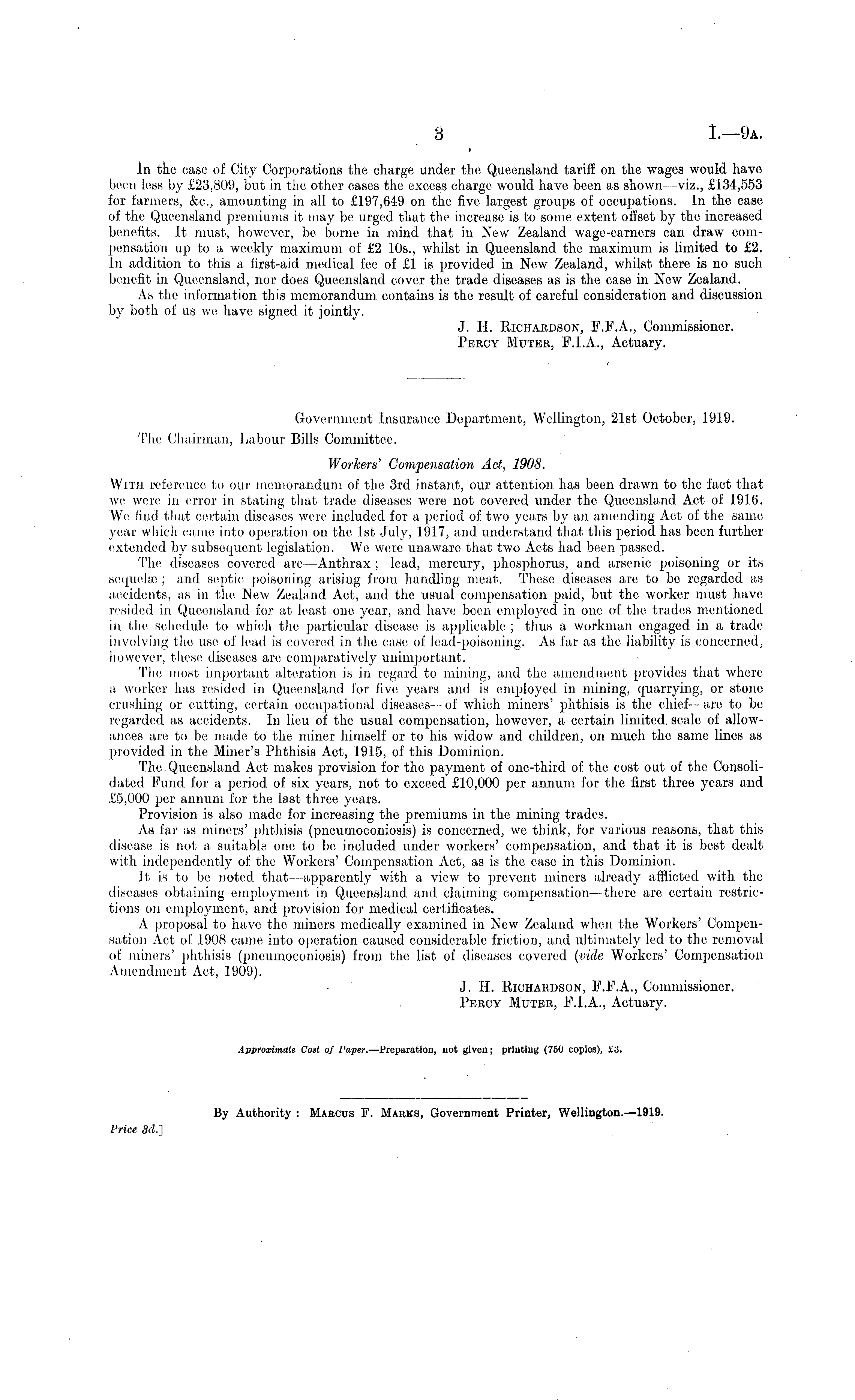 In the case of City Corporations the charge under the Queensland tariff on the wages would have been less by £23,809, but in the other cases the excess charge would have been as shown- -viz., £134,553 for farmers, &c, amounting in all to £197,649 on the five largest groups of occupations. In the case of the Queensland premiums it may be urged that the increase is to some extent offset by the increased benefits. It must, however, be borne in mind that in New Zealand wage-earners can draw compensation up to a weekly maximum of £2 10s., whilst in Queensland the maximum is limited to £2. In addition to this a first-aid medical fee of £1 is provided in New Zealand, whilst there is no such benefit in Queensland, nor does Queensland cover the trade diseases as is the case in New Zealand. As the information this memorandum contains is the result of careful consideration and discussion by both of us we have signed it jointly. J. H. Richardson, F.F.A., Commissioner. Percy Muter, F.1.A., Actuary. Government Insurance Department, Wellington, 21st October, 1919. The Chairman, Labour Bills Committee. Workers' Compensation Act, 1908. With reference to our memorandum of the 3rd instant, our attention has been drawn to the fact that we were in error in stating that trade diseases were not covered under the Queensland Act of 1.916. We find that certain diseases were included for a period of two years by an amending Act of the same year which came into operation on the Ist July, 1917, and understand that this period has been further extended by subsequent legislation. We were unaware that two Acts had been passed. The diseases covered are —Anthrax ; lead, mercury, phosphorus, and arsenic poisoning or its sequela; ; and septic poisoning arising from handling meat. These diseases are to be regarded as accidents, as in the New Zealand Act, and the usual compensation paid, but the worker must have resided in Queensland for at least one year, and have been employed in one of the trades mentioned in the schedule to which the particular disease is applicable ; thus a workman engaged in a trade involving the use of lead is covered in the case of lead-poisoning, As far as the liability is concerned, however, these diseases are comparatively unimportant. The most important alteration is in regard to mining, and the amendment provides that where a, worker has resided in Queensland for five; years and is employed in mining, quarrying, or stone crushing or cutting, certain occupational diseases--of which miners' phthisis is the chief- are to be regarded as accidents. In lieu of the usual compensation, however, a certain limited, scale of allowances are to be made to the miner himself or to his widow and children, on much the same lines as provided in the Miner's Phthisis Act, 1915, of this Dominion. The Queensland Act makes provision for the payment of one-third of the cost out of the Consolidated Fund for a period of six years, not to exceed £10,000 per annum for the first.three years and £5,000 per annum for the last three years. Provision is also made for increasing the premiums in the mining trades. As far as miners' phthisis (pneumoconiosis) is concerned, we think, for viirious reasons, that this disease is not a suitable one to be included under workers' compensation, and that it is best dealt with independently of the Workers' Compensation Act, as is the case in this Dominion. It is to be noted that--apparently with a view to prevent miners already afflicted with, the diseases obtaining employment in Queensland and claiming compensation—there are certain restrictions on employment, and provision for medical certificates. A proposal to have the miners medically examined in New Zealand when the Workers' Compensation Act of 1908 came into operation caused considerable friction, and ultimately led to the removal of millet's' phthisis (pneumoconiosis) from the list of diseases covered (vide Workers' Compensation Amendment Act, 1909). J. 11. Richardson, F.F.A., Commissioner. Percy Muter, F.1.A., Actuary.