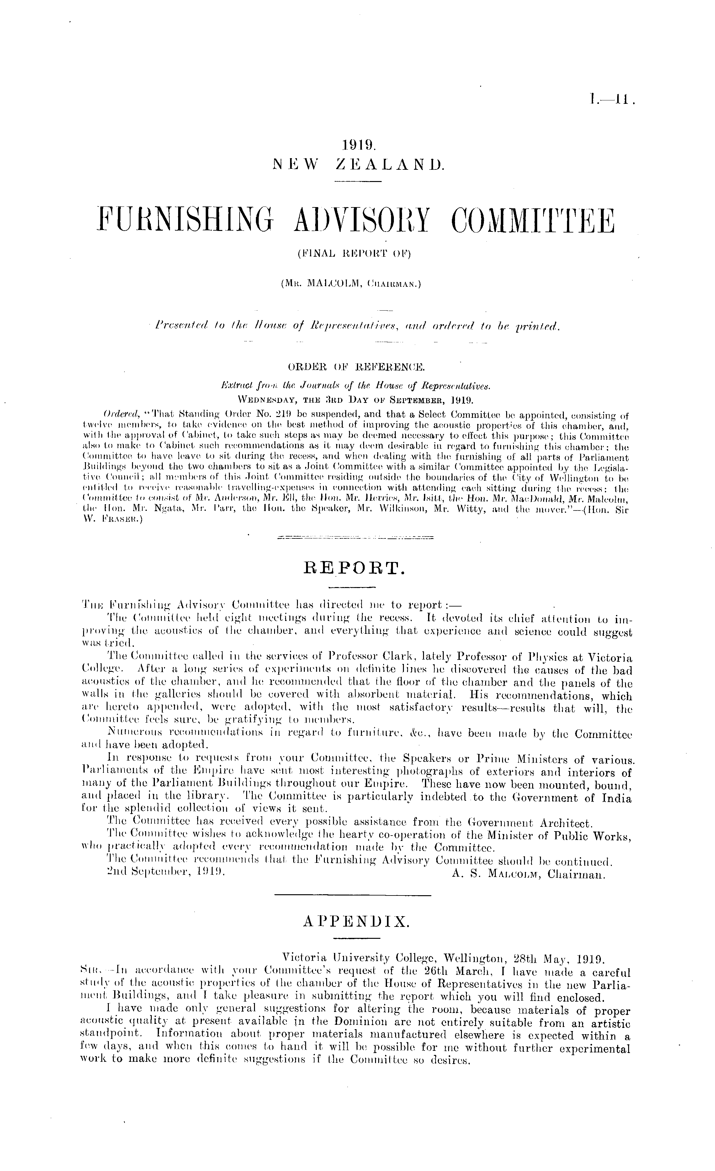 ORDER OF REFERENCE. Extract fron Ike Journals of the. House of Representatives. Wednesday, the .'!kd Day of September, 1919. Ordered, "That Standing Older No. 219 bo suspended, and that a Select Committee be appointed, consisting of twelve members, to lake evidence on the best method of improving the acoustic properties of this chamber, and, wilh the approval of Cabinet, to take such steps as may bo deemed necessary to effect this purpose; this Committee also to make to Cabinet such recommendations as it may deem desirable in regard to furnishing this chamber; the Committee to have leave to sit during the recess, and when dealing with the furnishing of all parts of Parliament Buildings beyond the two chambers to sit as a Joint Committee with a similar Committee appointed by the Legislative Council; all members of this Joint Committee residing outside the boundaries of the City of Wellington to Inentitled to receive reasonable travelling-expenses ill connection with attending each sitting during the recess: the Committee to consist of Mr, Anderson, Mr. Ell, the Hon. Mr. Hurries, Mr. Isitt, the Hon. Mr. Mac Donald, Mr. Malcolm, the lion. Mr. Ngata, Mr. Parr, the Hon. the Speaker, Mr. Wilkinson, Mr. Witty, and the mover."—(Hon. Sir W. Pbasee.)