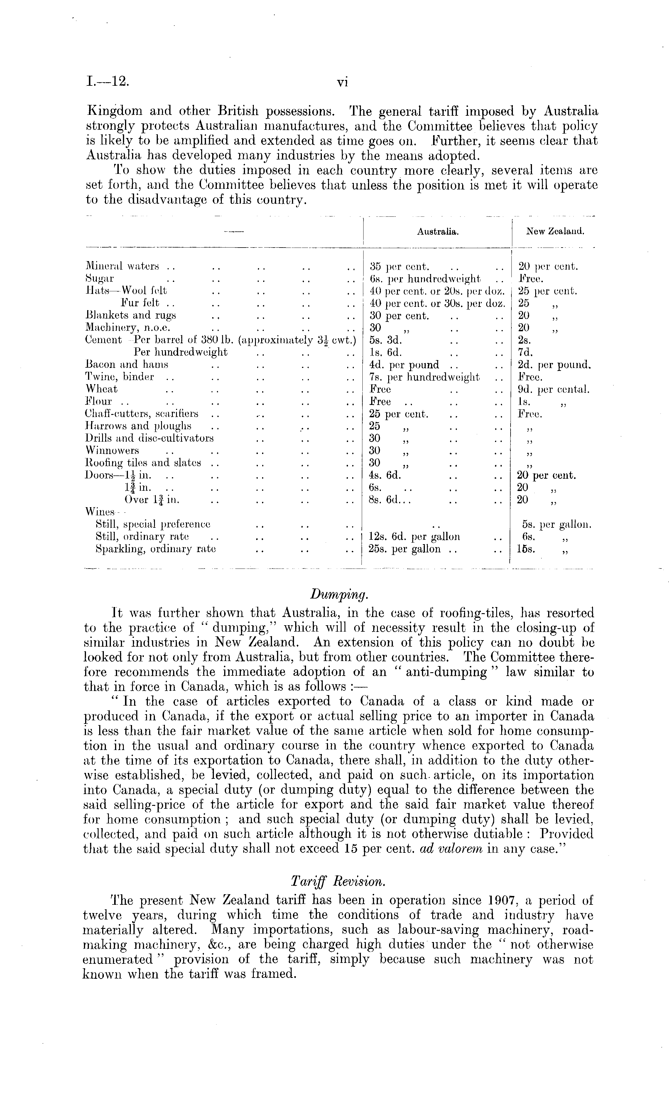 Kingdom and other British possessions. The general tariff imposed by Australia strongly protects Australian manufactures, and the Committee believes that policy is likely to be amplified and extended as time goes on. Further, it seems clear that Australia has developed many industries by the means adopted. To show the duties imposed in each country more clearly, several items are set forth, and the Committee believes that unless the position is met it will operate to the disadvantage of this country.