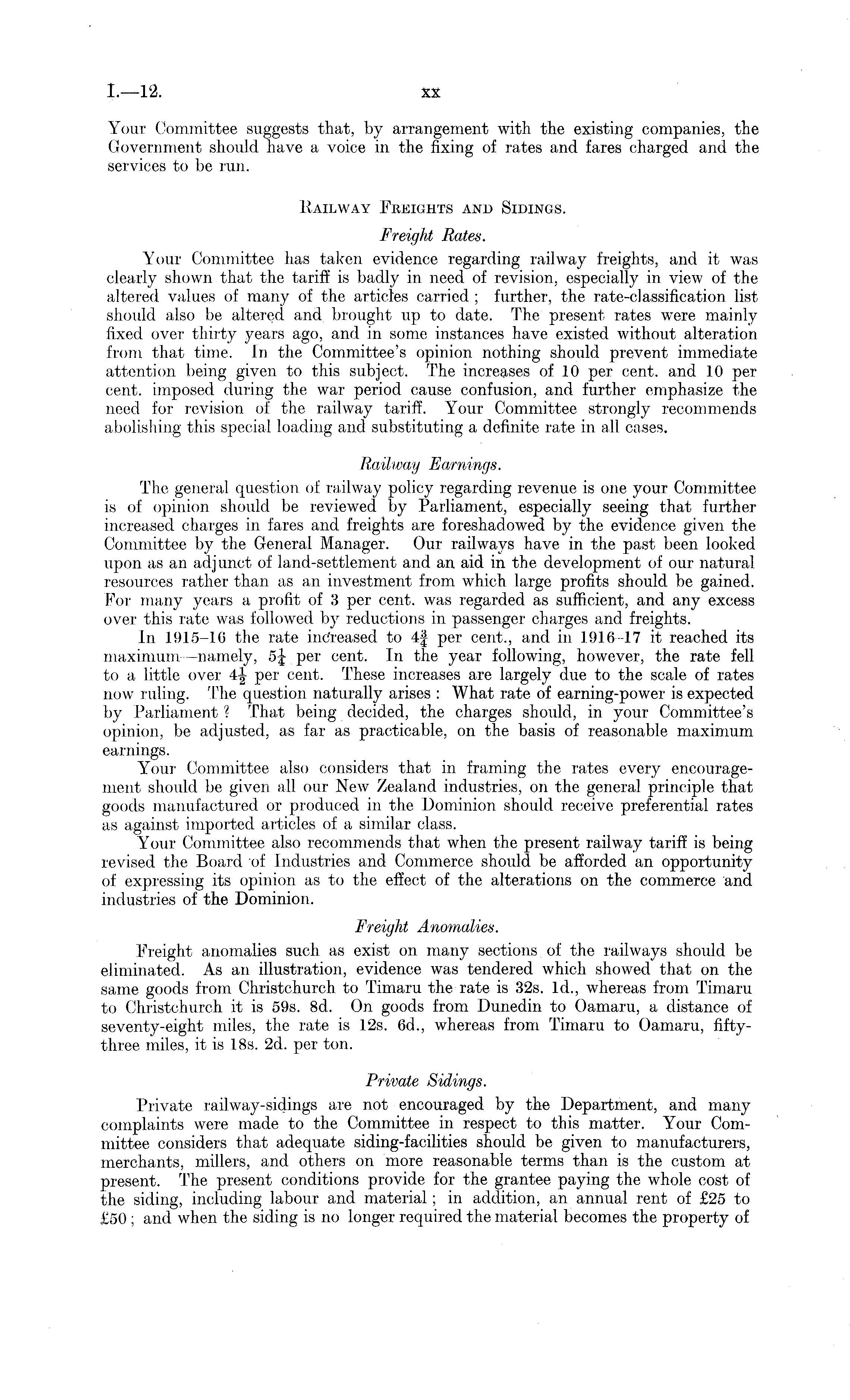 Your Committee suggests that, by arrangement with the existing companies, the Government should have a voice in the fixing of rates and fares charged and the services to be run. Railway Freights and Sidings. Freight Rates. Your Committee has taken evidence regarding railway freights, and it was clearly shown that the tariff is badly in need of revision, especially in view of the altered values of many of the articles carried ; further, the rate-classification list should also be altered and brought up to date. The present rates were mainly fixed over thirty years ago, and in some instances have existed without alteration from that time. In the Committee's opinion nothing should prevent immediate attention being given to this subject. The increases of 10 per cent, and 10 percent, imposed during the war period cause confusion, and further emphasize the need for revision of the railway tariff. Your Committee strongly recommends abolishing this special loading and substituting a definite rate in all cases. Railway Earnings. The general question of railway policy regarding revenue is one your Committee is of opinion should be reviewed by Parliament, especially seeing that further increased charges in fares and freights are foreshadowed by the evidence given the Committee by the General Manager. Our railways have in the past been looked upon as an adjunct of land-settlement and an aid in the development of our natural resources rather than as an investment from which large profits should, be gained. For many years a profit of 3 per cent, was regarded as sufficient, and any excess over this rate was followed by reductions in passenger charges and freights. In 1915-16 the rate increased to 4| per cent., and in 1916-17 it reached its maximum—namely, 5j per cent. In the year following, however, the rate fell to a little over 4j per cent. These increases are largely due to the scale of rates now ruling. The question naturally arises : What rate of earning-power is expected by Parliament ? That being decided, the charges should, in your Committee's opinion, be adjusted, as far as practicable, on the basis of reasonable maximum earnings. Your Committee also considers that in framing the rates every encouragement should be given all our New Zealand industries, on the general principle that goods manufactured or produced in the Dominion should receive preferential rates as against imported articles of a similar class. Your Committee also recommends that when the present railway tariff is being revised the Board of Industries and Commerce should be afforded an opportunity of expressing its opinion as to the effect of the alteratiorrs on the commerce and industries of the Dominion. Freight Anomalies. Freight anomalies such as exist on many sections of the railways should be eliminated. As an illustration, evidence was tendered which showed that on the same goods from Christchurch to Timaru the rate is 325. Id., whereas from Timaru to Christchurch. it is 595. Bd. On goods from Dunedin to Oarnaru, a distance of seventy-eight miles, the rate is 12s. 6d., whereas from Timaru to Oarnaru, fiftythree miles, it is 18s. 2d. per ton. Private Sidings. Private railway-sidings are not encouraged by the Department, and many complaints were made to the Committee in respect to this matter. Your Committee considers that adequate siding-facilities should be given to manufacturers, merchants, millers, and others on more reasonable terms than is the custom at present. The present conditions provide for the grantee paying the whole cost of the siding, including labour and material; in addition, an annual rent of £25 to £50 ; and when the siding is no longer required the material becomes the property of