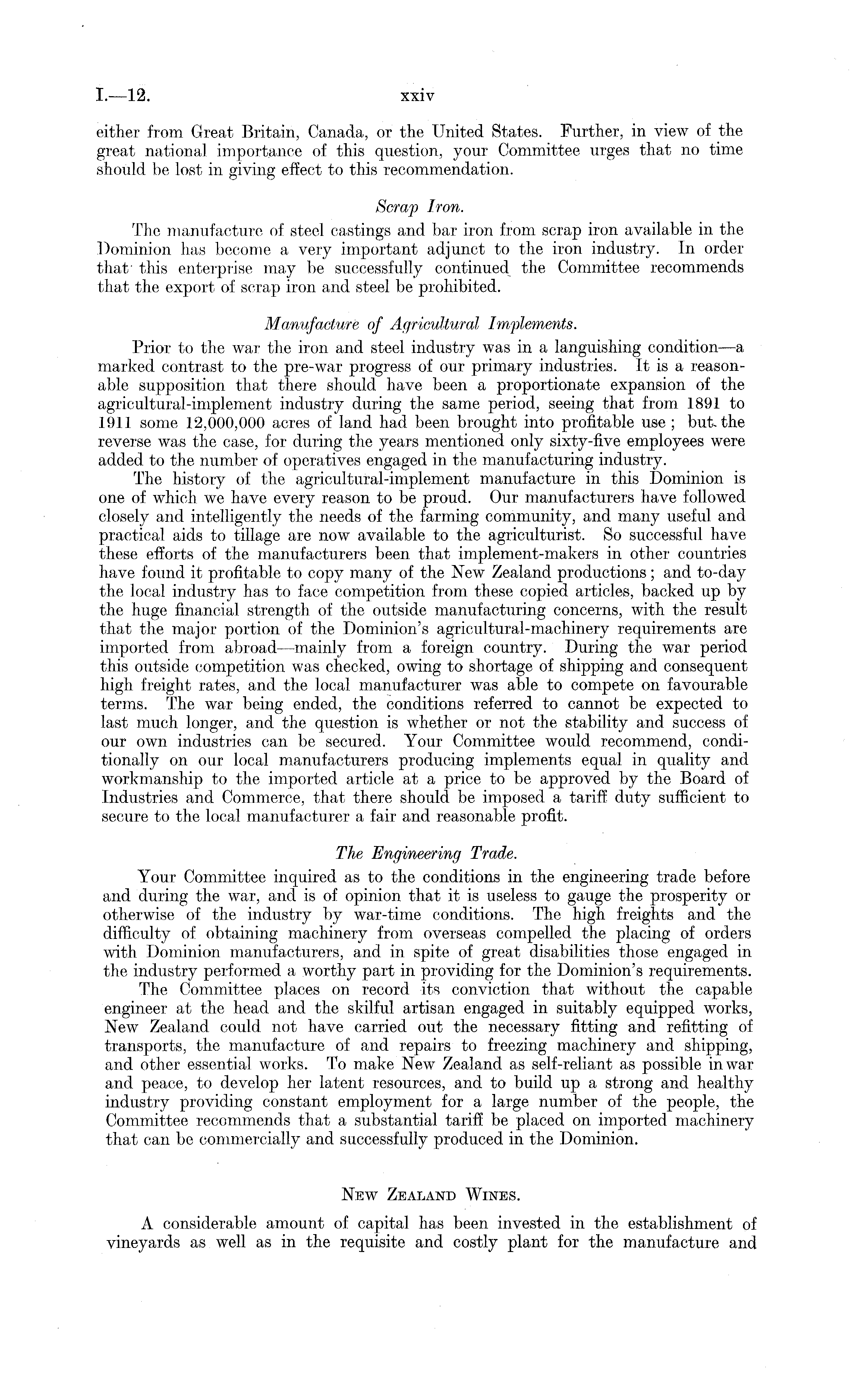 either from Great Britain, Canada, or the United States. Further, in view of the great national importance of this question, your Committee urges that no time should be lost in giving effect to this recommendation. Scrap Iron. The manufacture of steel castings and bar iron from scrap iron available in the Dominion has become a very important adjunct to the iron industry. In order that' this enterprise may be successfully continued the Committee recommends that the export of scrap iron and steel be prohibited. Manufacture of Agricultural Implements. Prior to the war the iron and steel industry was in a languishing condition —a marked contrast to the pre-war progress of our primary industries. It is a reasonable supposition that there should have been a proportionate expansion of the agricultural-implement industry during the same period, seeing that from 1891 to 1911 some 12,000,000 acres of land had been brought into profitable use ; but the reverse was the case, for during the years mentioned only sixty-five employees were added to the number of operatives engaged in the manufacturing industry. The history of the agricultural-implement manufacture in this Dominion is one of which we have every reason to be proud. Our manufacturers have followed closely and intelligently the needs of the farming community, and many useful and practical aids to tillage are now available to the agriculturist. So successful have these efforts of the manufacturers been that implement-makers in other countries have found it profitable to copy many of the New Zealand productions; and to-day the local industry has to face competition from these copied articles, backed up by the huge financial, strength of the outside manufacturing concerns, with the result that the major portion of the Dominion's agricultural-machinery requirements are imported from abroad —mainly from a foreign country. During tfie war period this outside competition was checked, owing to shortage of shipping and consequent high freight rates, and the local manufacturer was able to compete on favourable terms. The war being ended, the conditions referred to cannot be expected to last much longer, and the question is whether or not the stability and success of our own industries can be secured. Your Committee would recommend, conditionally on our local manufacturers producing implements equal in quality and workmanship to the imported article at a price to be approved by the Board of Industries and Commerce, that there should be imposed a tariff duty sufficient to secure to the local manufacturer a fair and reasonable profit. The Engineering Trade. Your Committee inquired as to the conditions in the engineering trade before and during the war, and is of opinion that it is useless to gauge the prosperity or otherwise of the industry by war-time conditions. The high freights and the difficulty of obtaining machinery from overseas compelled the placing of orders with Dominion manufacturers, and in spite of great disabilities those engaged in the industry performed a worthy part in providing for the Dominion's requirements. The Committee places on record its conviction, that without the capable engineer at the head and the skilful artisan engaged in suitably equipped works, New Zealand could not have carried out the necessary fitting and refitting of transports, the manufacture of and repairs to freezing machinery and shipping, and other essential works. To make New Zealand as self-reliant as possible in war and peace, to develop her latent resources, and to build up a strong and healthy industry providing constant employment for a large number of the people, the Committee recommends that a substantial tariff be placed on imported machinery that can be commercially and successfully produced in the Dominion. New Zealand Wines. A considerable amount of capital has been invested in the establishment of vineyards as well as in the requisite and costly plant for the manufacture and