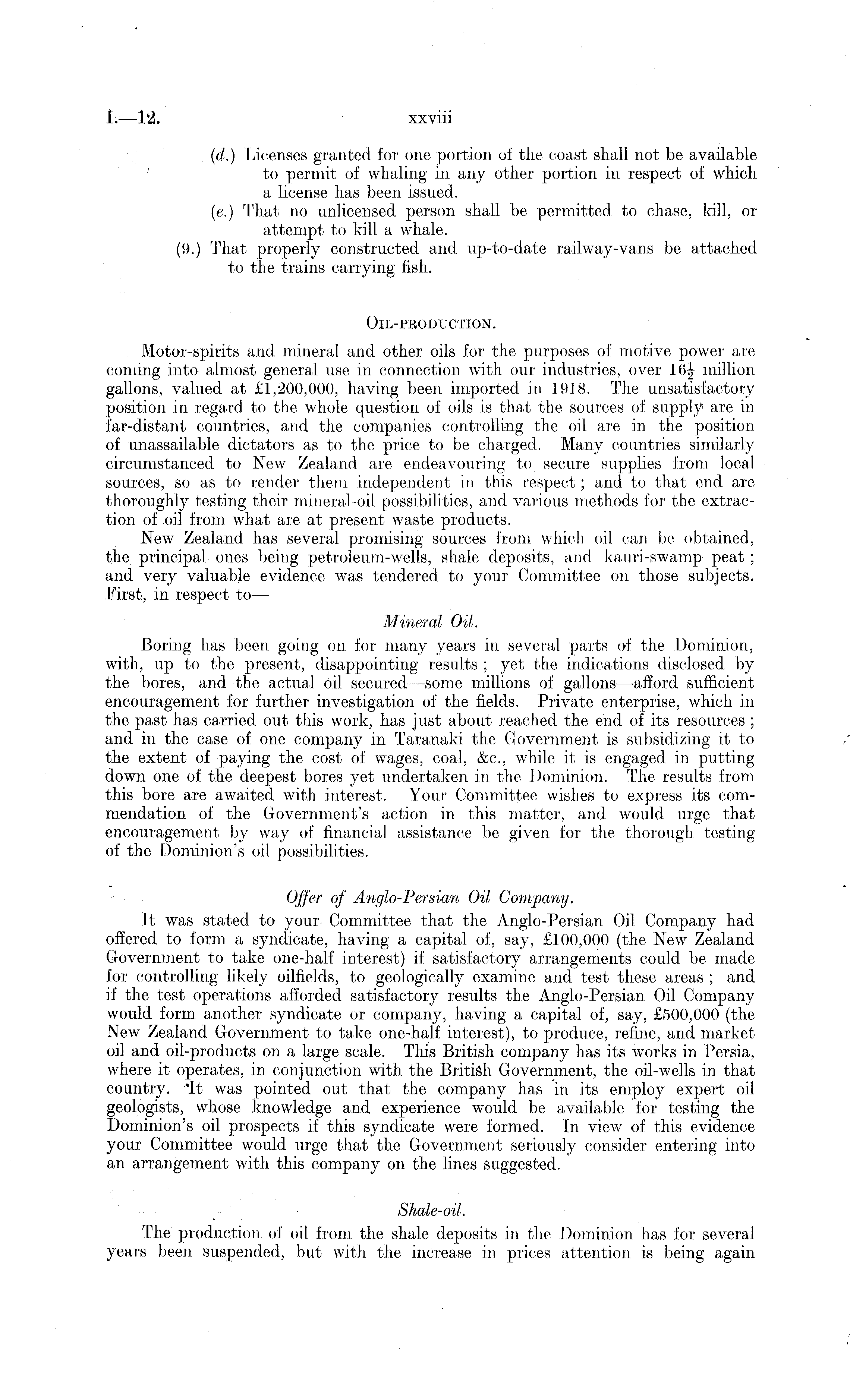 (d.) Licenses granted for one portion of the coast shall not be available to permit of whaling in any other portion in respect of which a license has been issued. (c.) That no unlicensed person shall be permitted to chase, kill, or attempt to kill a whale. (9.) That properly constructed and up-to-date railway-vans be attached to the trains carrying fish. Oil-production. Motor-spirits and mineral and other oils for the purposes of motive power are coming into almost general use in connection with our industries, over 16| million gallons, valued at £1,200,000, having been imported in 1918. The unsatisfactory position in regard to the whole question of oils is that the sources of supply are in far-distant countries, and the companies controlling the oil are in the position of unassailable dictators as to the price to be charged. Many countries similarly circumstanced to New Zealand are endeavouring to secure supplies from local sources, so as to render them independent in this respect; and to that end are thoroughly testing their mineral-oil possibilities, and various methods for the extraction of oil from what are at present waste products. New Zealand has several promising sources from which oil can be obtained, the principal ones being petroleum-wells, shale deposits, and kauri-swamp peat ; and very valuable evidence was tendered to your Committee on those subjects. Ifirst, in respect to — Mineral Oil. Boring has been going on for many years in several parts of the Dominion, with, up to the present, disappointing results ; yet the indications disclosed by the bores, and the actual oil secured--some millions of gallons —afford sufficient encouragement for further investigation of the fields. Private enterprise, which in the past has carried out this work, has just about reached the end of its resources ; and in the case of one company in Taranaki the Government is subsidizing it to the extent of paying the cost of wages, coal, &c, while it is engaged in putting down one of the deepest bores yet undertaken in the Dominion. The results from this bore are awaited with interest. Your Committee wishes to express its commendation of the Government's action in this matter, and would urge that encouragement by way of financial assistance be given for the thorough testing of the Dominion's oil possibilities. Offer of Anglo-Persian Oil Company. It was stated to your- Committee that the Anglo-Persian Oil Company had offered to form a syndicate, having a capital of, say, £.100,000 (the New Zealand Government to take one-half interest) if satisfactory arrangements could be made for controlling likely oilfields, to geologically examine and test these areas ; and if the test operations afforded satisfactory results the Anglo-Persian Oil Company would form another syndicate or company, having a capital of, say, £500,000 (the New Zealand Government to take one-half interest), to produce, refine, and market oil and oil-products on a large scale. This British company has its works in Persia, where it operates, in conjunction with the British Government, the oil-wells in that country. 'It was pointed out that the company has in its employ expert oil geologists, whose knowledge and experience would be available for testing the Dominion's oil prospects if this syndicate were formed. In view of this evidence your Committee would urge that the Government seriously consider entering into an arrangement with this company on the lines suggested. Shale-oil. The production of oil from the shale deposits in the Dominion has for several years been suspended, but with the increase in prices attention is being again