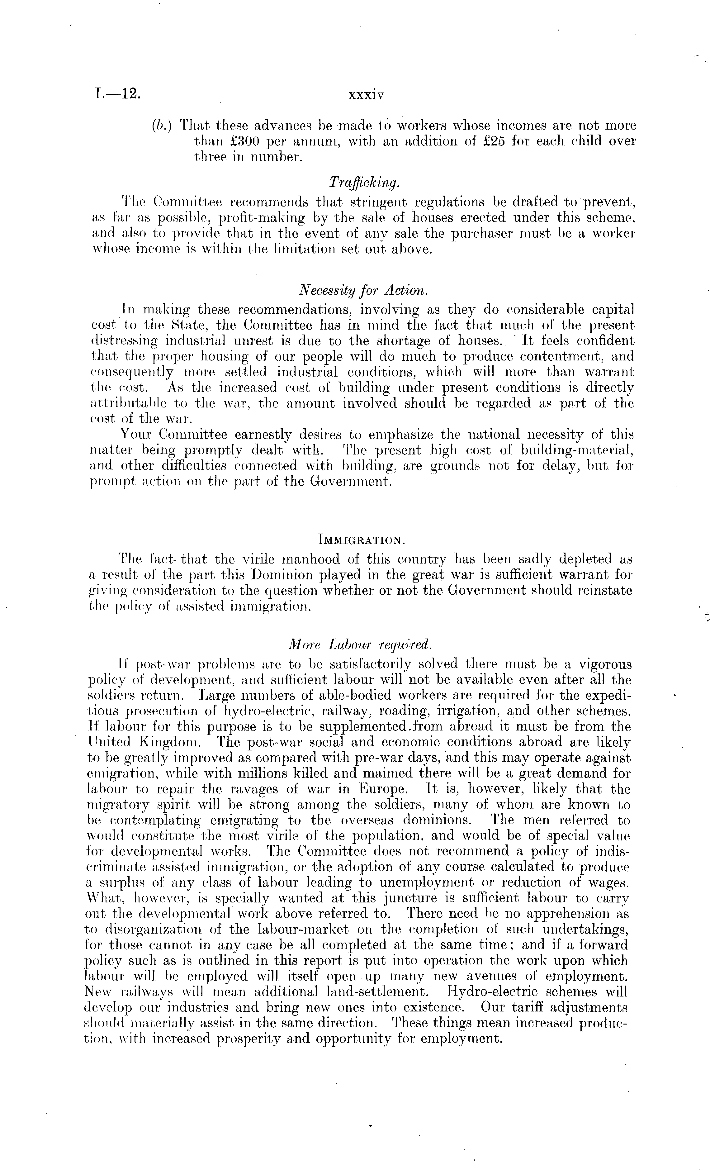 (b.) That these advances be made to workers whose incomes are not more than £300 per annum, with an addition of £25 for each child over three in number. Trafficking. The Committee recommends that stringent regulations be drafted to prevent, as far as possible, profit-making by the sale of houses erected under this scheme, and also to provide that in the event of any sale the purchaser must be a worker whose income is within the limitation set out above. Necessity for Action. In making these recommendations, involving as they do considerable capital cost to the State, the Committee has in mind the fact that much of the present distressing industrial unrest is due to the shortage of houses.. ' It feels confident that the proper' housing of our people will do much to produce contentment, and consequently more settled industrial conditions, which will more than warrant the cost. As the increased cost of building under present conditions is directly attributable to the war, the amount involved should, be regarded as part of the cost of the war. Your Committee earnestly desires to emphasize the national necessity of this matter being promptly dealt with. The present high cost of building-material, and other difficulties connected, with building, are grounds not for delay, but for prompt action on the part of the Government. Immigration. The fact- that the virile manhood of this country has been sadly depleted as a result of the part this Dominion played in the great war is sufficient warrant for giving consideration to the question whether or not the Government should reinstate the policy of assisted immigration. More Labour required. If post-war problems are to be satisfactorily solved there must be a vigorous policy of development, and sufficient labour' will not be available even after all the soldiers return. Large numbers of able-bodied workers are required for the expeditious prosecution of hydro-electric, railway, reading, irrigation, and other schemes. If labour for this purpose is to be supplemented.from abroad it must be from the United Kingdom. The post-war social and economic conditions abroad are likely to be greatly improved as compared with pre-war days, and this may operate against emigration, while with millions killed and maimed there will be a great demand for labour to repair the ravages of war in Europe. It is, however, likely that the migratory spirit will be strong among the soldier's, many of whom are known to be contemplating emigrating to the overseas dominions. The men referred to would constitute the most virile of the population, and would be of special value for developmental works. The Committee does not recommend a policy of indiscriminate assisted immigration, or' the adoption of any course calculated to produce a surplus of any class of labour leading to unemployment or reduction of wages. What, however, is specially wanted at this juncture is sufficient labour' to carry out the developmental work above referred to. There need be no apprehension as to disorganization of the labour-market on the completion of such undertakings, for those cannot in any case be all completed at the same time; and if a forward policy such as is outlined in this report is put into operation the work upon which labour will be employed will itself open up many new avenues of employment. New railways will mean additional land-settlement. Hydro-electric schemes will develop our industries and bring new ones into existence. Our tariff adjustments should materially assist in the same direction. These things mean increased production, with increased prosperity and opportunity for employment.