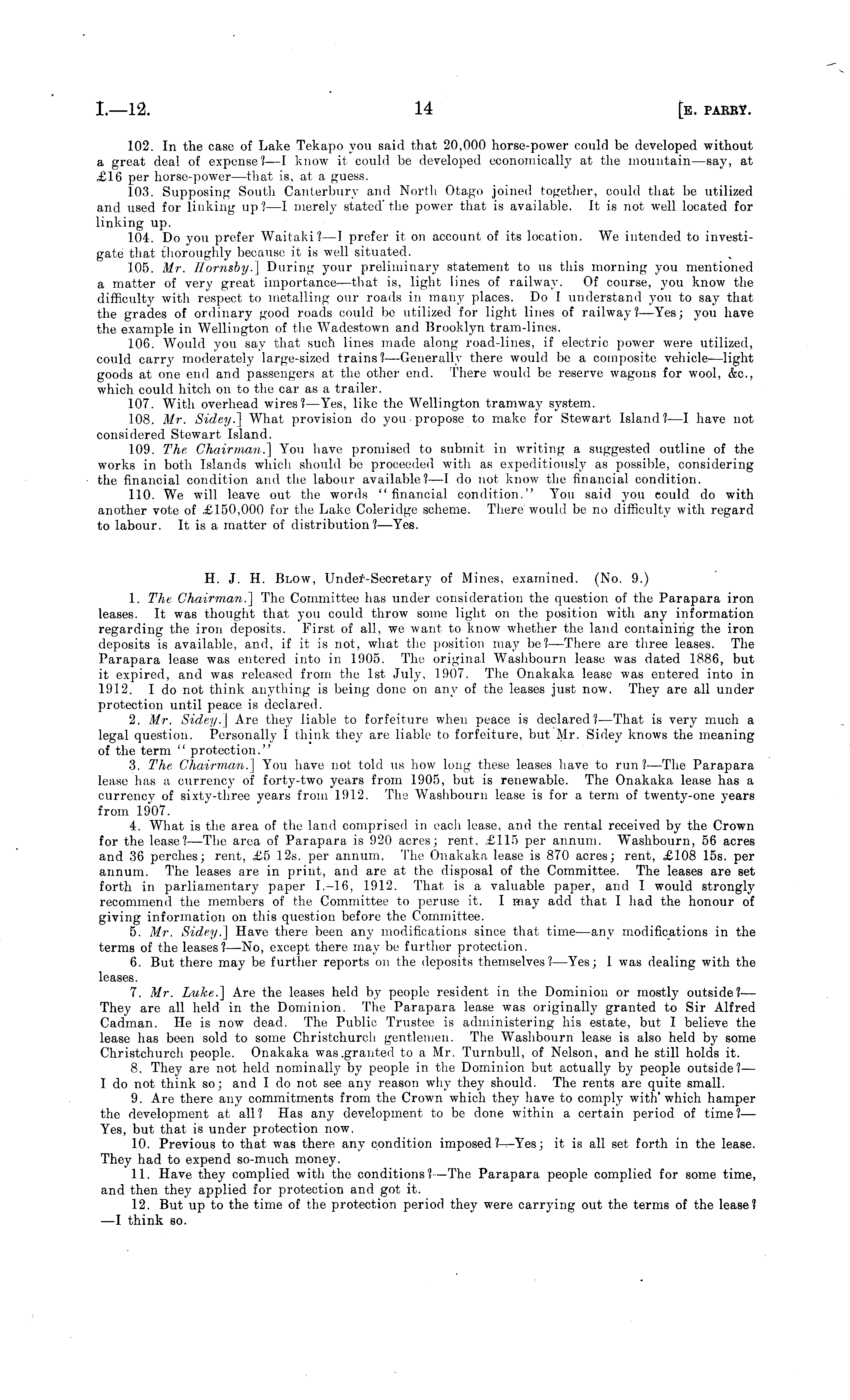 102. In the case of Lake Tekapo you said that 20,000 horse-power could be developed without a great deal of expense?—l know it could be developed economically at the mountain —say, at £16 per horse-power—that is, at a guess. 103. Supposing South Canterbury and North Otago joined together, could that be utilized and used for linking up?—l merely stated'the power that is available. It is not well located for linking up. 104. Do you prefer Waitaki? —I prefer it on account of its location. We intended to investigate that thoroughly because it is well situated. 105. Mr. Hornsby.] During your preliminary statement to us this morning you mentioned a matter of very great importance—that is, light lines of railway. Of course, you know the difficulty with respect to metalling our roads in many places. Do I understand you to say that the grades of ordinary good roads could be utilized for light lines of railway?— Yes; you have the example in Wellington of the Wadestown and Brooklyn tram-lines. 106. Would you say that such lines made along road-lines, if electric power were utilized, could carry moderately large-sized trains? —Generally there would be a composite vehicle—light goods at one end and passengers at the other end. There would be reserve wagons for wool, &c, which could hitch on to the car as a trailer. 107. With overhead wires? —Yes, like the Wellington tramway system. 108. Mr. Sidey.] What provision do you propose to make for Stewart Island? —I have not considered Stewart Island. 109. The Chairman.] You have promised to submit in writing a suggested outline of the works in both Islands which should be proceeded with as expeditiously as possible, considering the financial condition and the labour available?—l do not know the financial condition. 110. We will leave out the words "financial condition." You said you could do with another vote of £150,000 for the Lake Coleridge scheme. There would be no difficulty with regard to labour. It is a matter of distribution?— Yes. H. J. H. Blow, Under-Secretary of Mines, examined. (No. 9.) 1. The Chairman.] The Committee has under consideration the question of the Parapara iron leases. It was thought that you could throw some light on the position with any information regarding the iron deposits. First of all, wo want to know whether the land containing the iron deposits is available, and, if it is not, what the position may be?— There are three leases. The Parapara lease was entered into in 1905. The original Washbourn lease was dated 1886, but it expired, and was released from the Ist July, 1907. The Onakaka lease was entered into in 1912. Ido not think anything is being done on any of the leases just now. They are all under protection until peace is declared. 2. Mr. Sidey.\ Are they liable to forfeiture when peace is declared?— That is very much a legal question. Personally I think they are liable to forfeiture, but Mr. Sidey knows the meaning of the term " protection." 3. The Chairman.] You have not told us how long these leases have to run I —The Parapara lease has a currency of forty-two years from 1905, but is renewable. The Onakaka lease has a currency of sixty-three years from 1912. The Washbourn lease is for a term of twenty-one years from 1907. 4. What is the area of the land comprised in each lease, and the rental received by the Crown for the lease?— The area of Parapara is 920 acres; rent, £115 per annum. Washbourn, 56 acres and 36 perches; rent, £5 12s. per annum. The Onakaka lease is 870 acres; rent, £108 15s. per annum. The leases are in print, and are at the disposal of the Committee. The leases are set forth in parliamentary paper 1.-16, 1912. That is a valuable paper, and I would strongly recommend the members of the Committee to peruse it. I may add that I had the honour of giving information on this question before the Committee. 5. Mr. Sidey.] Have there been any modifications since that time—any modifications in the terms of the leases?—No, except there may be further protection. 6. But there may be further reports on the deposits themselves? —Yes; 1 was dealing with the leases. 7. Mr. Luke.] Are the leases held by people resident in the Dominion or mostly outside?'— They are all held in the Dominion. The Parapara lease was originally granted to Sir Alfred Cadman. He is now dead. The Public Trustee is administering his estate, but I believe the lease has been sold to some Christchurch gentlemen. The Washbourn lease is also held by some Christchurch people. Onakaka was .granted to a Mr. Turnbull, of Nelson, and he still holds it. 8. They are not held nominally by people in the Dominion but actually by people outside? — Ido not think so; and Ido not see any reason why they should. The rents are quite small. 9. Are there any commitments from the Crown which they have to comply with'which hamper the development at all? Has any development to be done within a certain period of time?— Yes, but that is under protection now. 10. Previous to that was there any condition imposed ?—Yes; it is all set forth in the lease. They had to expend so-much money. 11. Have they complied with the conditions? —The Parapara people complied for some time, and then they applied for protection and got it. 12. But up to the time of the protection period they were carrying out the terms of the lease? —I think so.