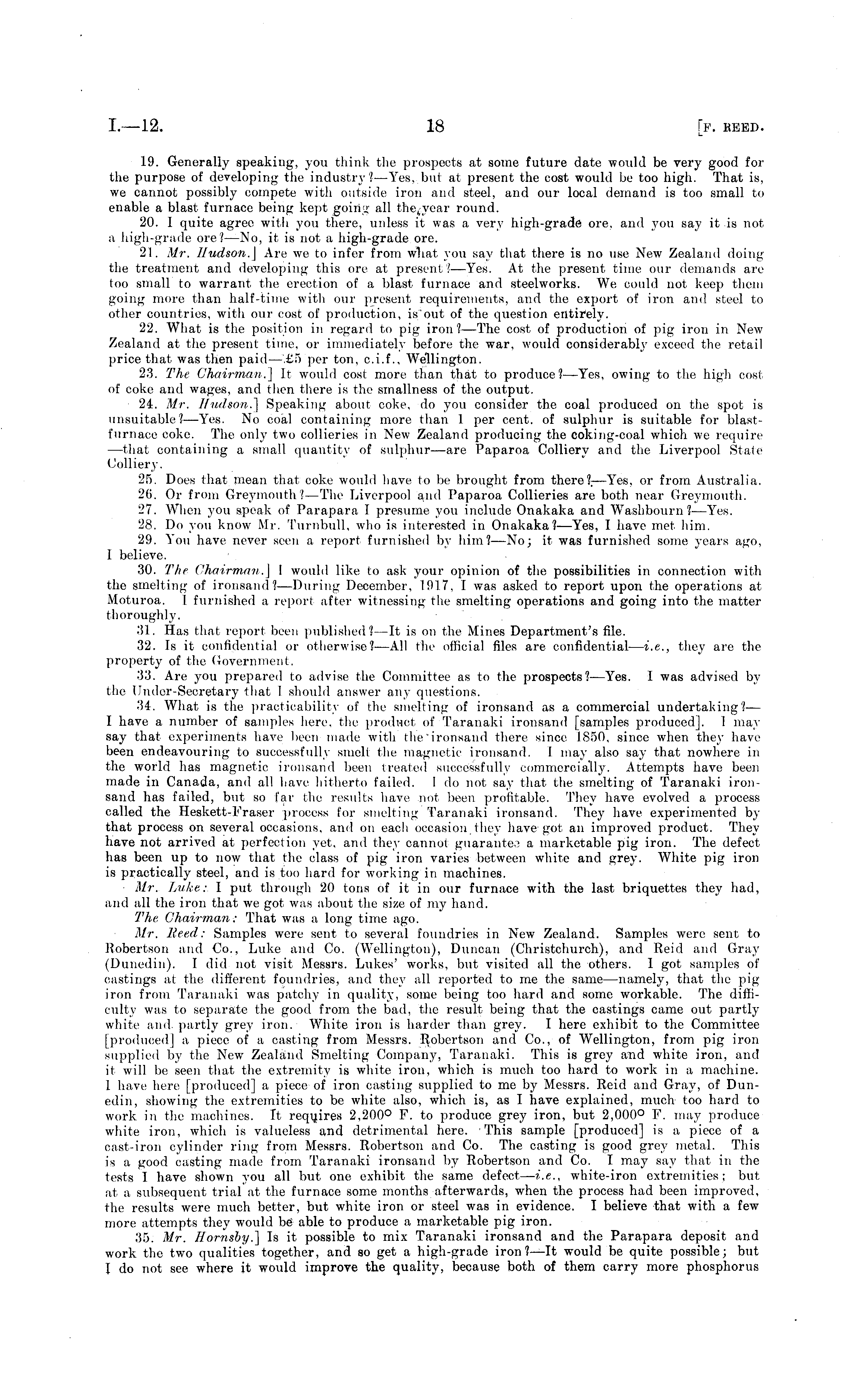 19. Generally speaking, you think the prospects at some future date would be very good for the purpose of developing the industry?— Yes, but at present the cost would be too high. That is, we cannot possibly compete with outside iron and steel, and our local demand is too small to enable a blast furnace being kept going all the t year round. 20. I quite agree with you there, unless it was a very high-grade ore, and you say it is not a high-grade ore? —No, it is not a high-grade ore. 21. Mr. Hudson.] Are we to infer from what you say that there is no use New Zealand doing the treatment and developing this ore at present?— Yes. At the present time our demands are too small to warrant the erection of a blast furnace and steelworks. We could not keep them going more than half-time with our present requirements, and the export of iron and steel to other countries, with our cost of production, is"out of the question entirely. 22. What is the position in regard to pig iron?— The cost of production of pig iron in New Zealand at the present time, or immediately before the war, would considerably exceed the retail price that was then paid —£5 per ton, c.i.f., Wellington. 23. The Chairman.] It would cost more than that to produce?— Yes, owing to the high cost of coke and wages, and then there is the smallness of the output. 24. Mr. Hudson.] Speaking about coke, do you consider the coal produced on the spot is unsuitable?— Yes. No coal containing more than 1 per cent, of sulphur is suitable for blastfurnace coke. The only two collieries in New Zealand producing the coking-coal which we require —that containing a small quantity of sulphur—are Paparoa Colliery and the Liverpool State Colliery. 25. Does that mean that coke would have to be brought from there?. —Yes, or from Australia. 26. Or from Greymouth?—The Liverpool and Paparoa Collieries are both near Greymouth. 27. When you speak of Parapara I presume you include Onakaka and Washbourn?—Yes. 28. Do you know Mr. Turnbull, who is interested in Onakaka?—Yes, I have met him. 29. You have never seen a report furnished by him?—No; it was furnished some years ago, 1 believe. 30. The Chairman.] I would like to ask your opinion of the possibilities in connection with the smelting of ironsand?—During December, 1917, I was asked to report upon the operations at Moturoa. I furnished a report after witnessing the smelting operations and going into the matter thoroughly. 31. Has that report been published?—lt is on the Mines Department's file. 32. Is it confidential or otherwise? —All the official files are confidential— i.e., they are the property of the Government. 33. Are you prepared to advise the Committee as to the prospects?— Yes. I was advised by the Under-Secretary that \ should answer any questions. 34. What is the practicability of the smelting of ironsand as a commercial undertaking? — I have a number of samples here, the product of Taranaki ironsand [samples produced], I may say that experiments have been made with the "ironsand there since iBSO, since when they have been endeavouring to successfully smelt the magnetic ironsand. I may also say that nowhere in the world has magnetic ironsand been treated successfully commercially. Attempts have been made in Canada, and all have hitherto failed. I do not say that the smelting of Taranaki ironsand has failed, but so far the results have not been profitable. They have evolved a process called the Heskett-Fraser process for smelting Taranaki ironsand. They have experimented by that process on several occasions, and on each occasion they have got an improved product. They have not arrived at perfection yet, and they cannot guarantee a marketable pig iron. The defect has been up to now that the class of pig iron varies between white and grey. White pig iron is practically steel, and is too hard for working in machines. ■ Mr. Luke: I put through 20 tons of it in our furnace with the last briquettes they had, and all the iron that we got was about the size of my hand. The Chairman: That was a long time ago. Mr. Reed: Samples were sent to several foundries in New Zealand. Samples were sent to Bobertson and Co., Luke and Co. (Wellington), Duncan (Christchurch), and Reid and Gray (Dunedin). I did not visit Messrs. Lukes' works, but visited all the others. 1 got samples of castings at the different foundries, and they all reported to me the same —namely, that the pig iron from Taranaki was patchy in quality, some being too hard and some workable. The difficulty was to separate the good from the bad, the result being that the castings came out partly white and. partly grey iron. White iron is harder than grey. I here exhibit to the Committee [produced] a piece of a casting from Messrs. Robertson and Co., of Wellington, from pig iron supplied by the New Zealand Smelting Company, Taranaki. This is grey and white iron, and it will be seen that the extremity is white iron, which is much too hard to work in a machine. I have here [produced] a piece of iron casting supplied to me by Messrs. Reid and Gray, of Dunedin, showing the extremities to be white also, which is, as I have explained, much too hard to work in the machines. It requires 2,200° F. to produce grey iron, but 2,000° F. may produce white iron, which is valueless and detrimental here. This sample [produced] is a piece of a cast-iron cylinder ring from Messrs. Robertson and Co. The casting is good grey metal. This is a good casting made from Taranaki ironsand by Robertson and Co. I may say that in the tests I have shown you all but one exhibit the same defect — i.e., white-iron extremities; but at a subsequent trial at the furnace some months afterwards, when the process had been improved, the results were much better, but white iron or steel was in evidence. I believe that with a few more attempts they would be able to produce a marketable pig iron. 35. Mr. Hornsby.] Is it possible to mix Taranaki ironsand