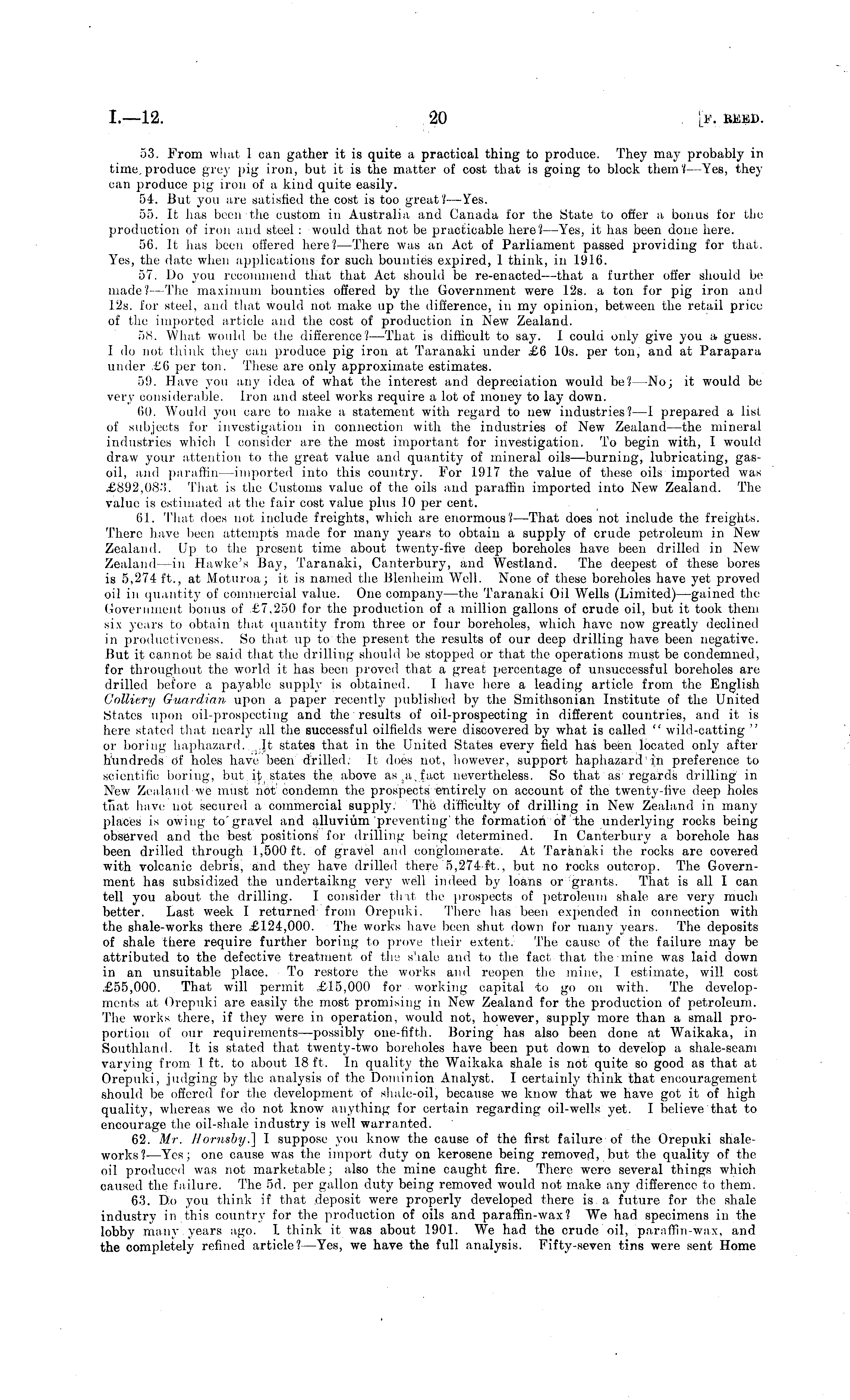 53. From what 1 can gather it is quite a practical thing to produce. They may probably in time,produce grey pig iron, but it is the matter of cost that is going to block them? —Yes, they can produce pig iron of a kind quite easily. 54. But you are satisfied the cost is too great? —Yes. 55. It has been'the custom in Australia and Canada for the State to offer a bonus for the production of iron and steel : would that not be practicable here? —Yes, it has been done here. 56. It has been offered here?— There was an Act of Parliament passed providing for that. Yes, the date when applications for such bounties expired, I think, in 1916. 57. Do you recommend that that Act should be re-enacted—that a further offer should be made? —The maximum bounties offered by the Government were I2s. a ton for pig iron and 12s. for steel, and that Would not make up the difference, in my opinion, between the retail price of the imported article and the cost of production in New Zealand. 58. What would lie the difference? —That is difficult to say. I could only give you a guess. I do not think they can produce pig iron at Taranaki under £6 10s. per ton, and at Parapara under £6 per ton. These are only approximate estimates. 59. Have you any idea of what the interest and depreciation would be?—No; it would be very considerable. Iron and steel works require a lot of money to lay down. 60. Would you care to make a statement with regard to new industries? —1 prepared a list of subjects for investigation in connection with the industries of New Zealand —the mineral industries which 1 consider are the most important for investigation. To begin with, I would draw your attention to the great value and quantity of mineral oils —burning, lubricating, gasoil, and paraffin—imported into this country. For 1917 the value of these oils imported was £892,083. That is the Customs value of the oils and paraffin imported into New Zealand. The value is estimated at the fair cost value plus 10 per cent. 61. That does not include freights, which are enormous?— That does not include the freights. There have been attempts made for many years to obtain a supply of crude petroleum in New Zealand. Up to the present time about twenty-five deep boreholes have been drilled in New Zealand—in Hawke's Bay, Taranaki, Canterbury, and Westland. The deepest of these bores is 5,274 ft., at Moturoa; it is named the Blenheim Well. None of these boreholes have yet proved oil in quantity of commercial value. One company —the Taranaki Oil Wells (Limited) —gained the Government bonus of £7,250 for the production of a million gallons of crude oil, but it took them six years to obtain that quantity from three or four boreholes, which have now greatly declined in productiveness. So that up to the present the results of our deep drilling have been negative. But it cannot be said that the drilling should be stopped or that the operations must be condemned, for throughout the world it has been proved that a great percentage of unsuccessful boreholes are drilled before a payable supply is obtained. I have here a leading article from the English Colliery Guardian upon a paper recently published by the Smithsonian Institute of the United States upon oil-prospecting and the results of oil-prospecting in different countries, and it is here stated that nearly all the successful oilfields were discovered by what is called " wild-catting " or boring haphazard. It states that in the United States every field has been located only after hundreds of holes have been drilled: It does not, however, support haphazard'in preference to scientific boring, but,,it states the above as a, fact nevertheless. So that as regards drilling in New Zealand we must not condemn the prospects entirely on account of the twenty-five deep holes tnat have" not secured a commercial supply. The difficulty of drilling in New Zealand in many places is owing to'gravel and alluvium preventing'the formation of the underlying rocks being observed and the best positions for drilling being determined. In Canterbury a borehole has been drilled through 1,500 ft. of gravel and conglomerate. At Taranaki the rocks are covered with volcanic debris, and they have drilled there 5,274 ft., but no rocks outcrop. The Government has subsidized the undertaikng very well indeed by loans or grants. That is all I can tell you about the drilling. I consider th it the prospects of petroleum shale are very much better. Last week I returned from Orepuki. There has been expended in connection with the shale-works there £124,000. The works have been shut down for many years. The deposits of shale there require further boring to prove their extent. The cause of the failure may be attributed to the defective treatment of the shale and to the fact that the mine was laid down in an unsuitable place. To restore the works and reopen the mine, I estimate, will cost £55,000. That will permit £15,000 for working capital to go on with. The developments at Orepuki are easily the most promising in New Zealand for the production of petroleum. The works there, if they were in operation, would not, however, supply more than a small proportion of our requirements—possibly one-fifth. Boring has also been done at Waikaka, in Southland. It is stated that twenty-two boreholes have been put down to develop a shale-seam varying from 1 ft. to about 18 ft. In quality the Waikaka shale is not quite so good as that at Orepuki, judging by the analysis of the Dominion Analyst. I certainly think that encouragement should be offered for the development of shale-oil, because we know that we have got it of high quality, whereas we do not know anything for certain regarding oil-wells yet. I believe that to encourage the oil-shale industry is well warranted. 62. Mr. Hornsby.] I suppose you know the cause of the first failure of the Orepuki shaleworks? —Yes; one cause was the import duty on kerosene being removed, but