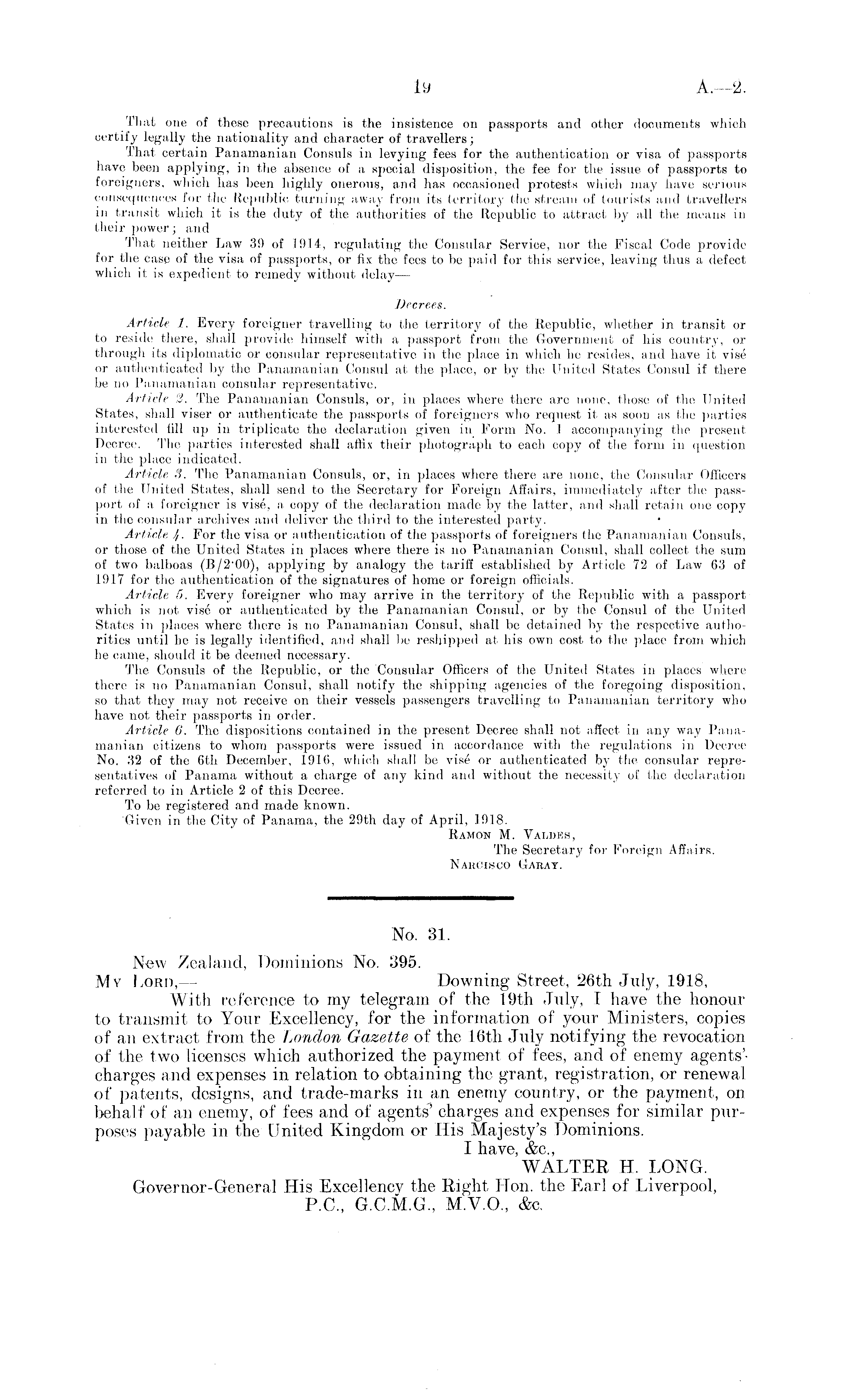 No. 31. New Zealand, Dominions No. 395. My Lord,— Downing Street, 26th July, 1918, With reference to my telegram of the 19th July, I have the honour to transmit to Your Excellency, for the information of your Ministers, copies of an extract from the London Gazette of the 16th July notifying the revocation of the two licenses which authorized the payment of fees, and of enemy agents'charges and expenses in relation to obtaining the grant, registration, or renewal of patents, designs, and trade-marks in an enemy country, or the payment, on behalf of an enemy, of fees and of agents'' charges and expenses for similar purposes payable in the United Kingdom or His Majesty's Dominions. I have, &c, WALTER H. LONG. Governor-General His Excellencv the Right Hon. the Earl of Liverpool, P.C., G.C.M.G., M.V.0., &c.