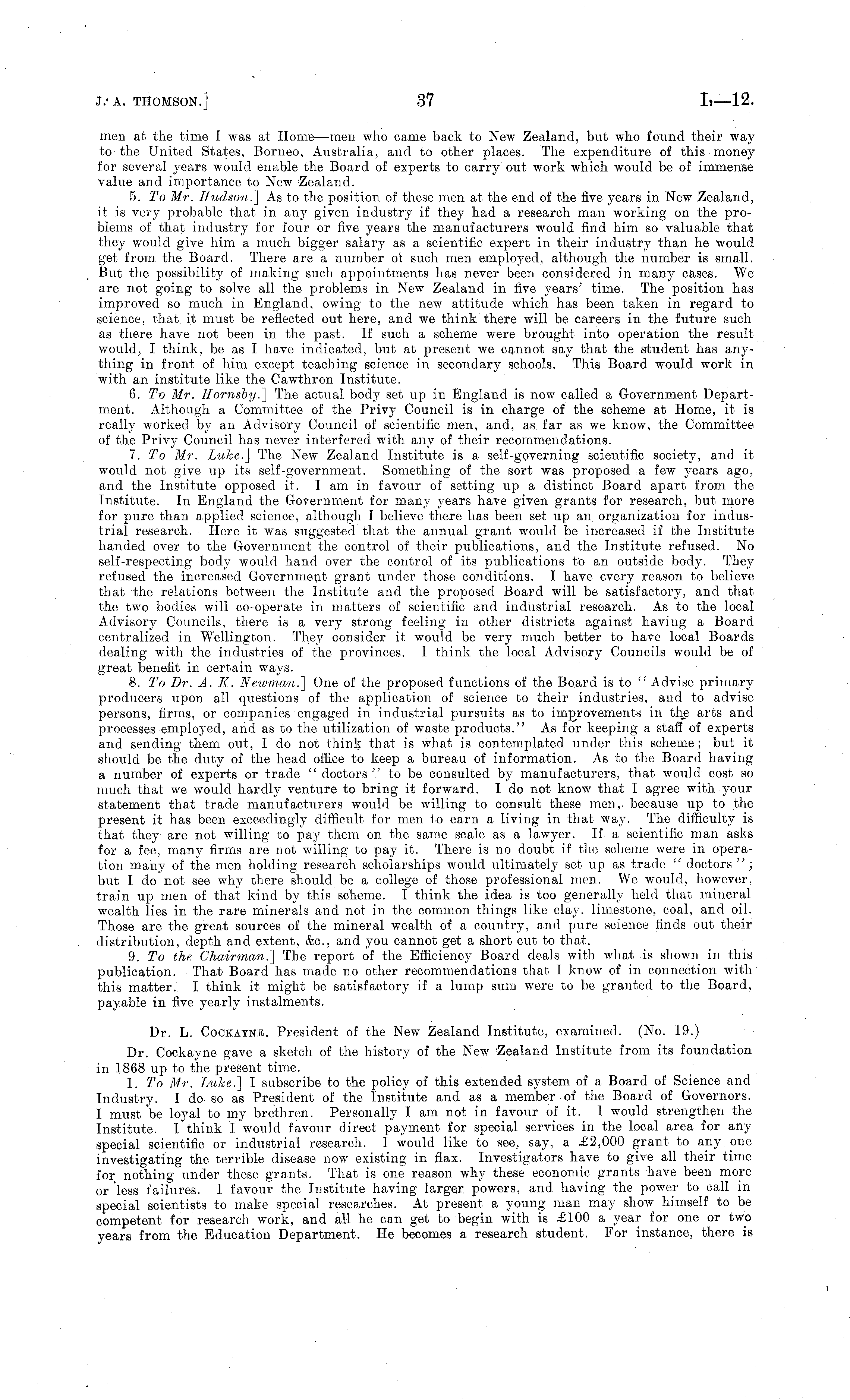 men at the time I was at Horne —men who came back to New Zealand, but who found their way to the United States, Borneo, Australia, and to other places. The expenditure of this money for several years would enable the Board of experts to carry out work which would be of immense value and importance to New Zealand, 5. 7'o Mr. Hudson.] As to the position of these men at the end of the five years in New Zealand, it is very probable that in any given industry if they had a research man working on the problems of that industry for four or five years the manufacturers would find him so valuable that they would give him a much bigger salary as a scientific expert in their industry than he would get from the Board. There are a number oi such men employed, although the number is small. But the possibility of making such appointments has never been considered in many cases. We arc not going to solve all the problems in New Zealand in five years' time. The position has improved so much in England, owing to the new attitude which has been taken in regard to science, that it must be reflected out here, and we think there will be careers in the future such as there have not been in the past. If such a scheme were brought into operation the result would, I think, be as I have indicated, but at present we cannot say that the student has anything in front of him except teaching science in secondary schools. This Board would work in with an institute like the Cawthron Institute. 6. To Mr. Hornsby.] The actual body set up in England is now called a Government Department. Although a Committee of the Privy Council is in charge of the scheme at Home, it is really worked by an Advisory Council of scientific men, and, as far as we know, the Committee of the Privy Council has never interfered with any of their recommendations. 7. To Mr. Luke.] The New Zealand Institute is a self-governing scientific society, and it would not give up its self-government. Something of the sort was proposed a few years ago, and the Institute opposed it. I am in favour of setting up a distinct Board apart from the Institute. In England the Government for many years have given grants for research, but more for pure than applied science, although. I believe there has been set up an organization for industrial research, Here it was suggested that the annual grant would be increased if the Institute handed over to the Government the control of their publications, and the Institute refused. No self-respecting body would hand over the control of its publications to an outside body. They refused the increased Government grant under those conditions. I have every reason to believe that the relations between the Institute and the proposed Board will be satisfactory, and that the two bodies will co-operate in matters of scientific and industrial research. As to the local Advisory Councils, there is a very strong feeling in other districts against having a Board centralized in Wellington. They consider it would be very much better to have local Boards dealing with the industries of the provinces. 1 think the local Advisory Councils would be of great benefit in certain ways. 8. To Dr. A. K. Newman.] One of the proposed functions of the Board is to " Advise primary producers upon all questions of the application of science to their industries, and to advise persons, firms, or companies engaged in industrial pursuits as to improvements in the arts and processes employed, and as to the utilization of waste products." As for keeping a staff of experts and sending them out, I do not think that is what is contemplated under this scheme ; but it should be the duty of the head office to keep a bureau of information. As to the Board having a number of experts or trade " doctors " to be consulted by manufacturers, that would cost so much that we would hardly venture to bring it forward. I do not know that I agree with your statement that trade manufacturers would be willing to consult these men, because up to the present it has been exceedingly difficult for men to earn a living in that way. The difficulty is that they arc not willing to pay them on the same scale as a lawyer. If a scientific man asks for a fee, many firms are not willing to pay it. There is no doubt if the scheme were in operation many of the men holding research scholarships would ultimately set up as trade " doctors "; but I do not see why there should be a college of those professional men. We would, however, train up men of that kind by this scheme. I think the idea is too generally held that mineral wealth lies in the rare minerals and not in the common things like clay, limestone, coal, and oil. Those are the great sources of the mineral wealth of a country, and pure science finds out their distribution, depth and extent, &c, and you cannot get a short cut to that. 9. To the Chairman.] The report of the Efficiency Board deals with what is shown in this publication. That Board has made no other recommendations that f know of in connection with this matter. I think it might be satisfactory if a lump sum were to be granted to the Board, payable in five yearly instalments. Dr. L. Cockayne, President of the New Zealand Institute, examined. (No. 19.) Dr. Cockayne gave a sketch of the history of the New Zealand Institute from its foundation in 1868 up to the present time. I. To Mr. Luke.] I subscribe to the policy of this extended system of a Board of Science and Industry. I do so as President of the Institute and as a member of the Board of Governors. I must be loyal to my brethren. Personally I am not in favour of it. 1 would strengthen the Institute. I think I' would favour direct payment for special services in the local area for any special scientific or industrial research. I would like to see, say, a £2,000 grant to any one investigating the terrible disease now existing in flax. Investigators have to give all their time for nothing under these grants. That is one reason why the