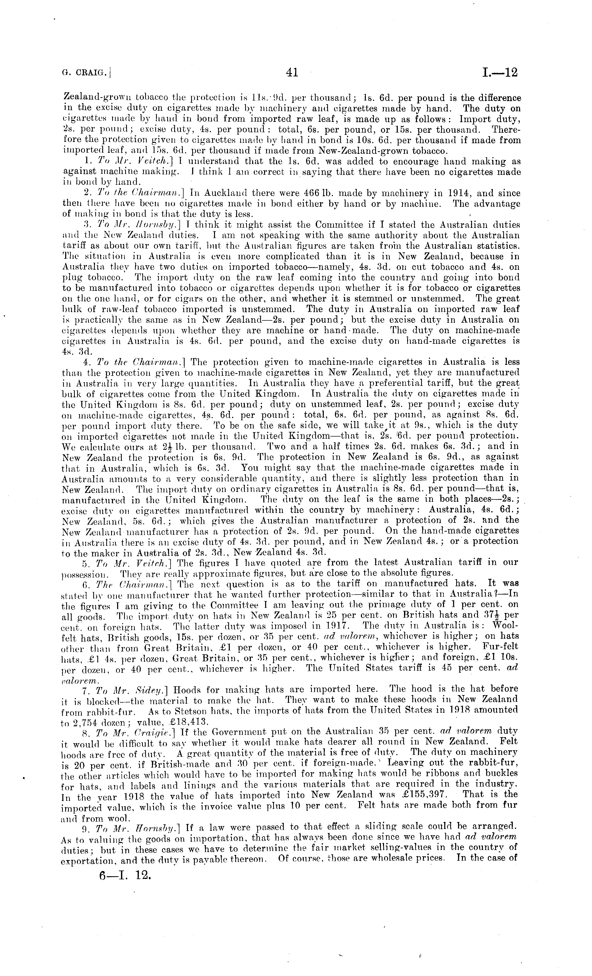 Zealand-grown tobacco the protection is I Is. 9d. per thousand; Is. 6d. per pound is the difference in the excise duty on cigarettes made by machinery and cigarettes made by hand. The duty on cigarettes made by hand in bond from imported raw leaf, is made up as follows : Import duty, 2s. per pound; excise duty, 4s. per pound: total, 6s. per pound, or 15s. per thousand. Therefore the protection given to cigarettes made by hand in bond is 10s. 6d. per thousand if made from imported leaf, and 15s. 6d. per thousand if made from New-Zealand-grown tobacco. 1. To Mr. Veitch.] I understand that the Is. 6d. was added to encourage hand making as against machine making. 1 think lam correct in saying that there have been no cigarettes made in bond by hand. 2. To the Chairman.] In Auckland there were 466 lb. made by machinery in 1914, and since then there have been no cigarettes made in bond either by hand or by machine. The advantage of making in bond is that the duty is less. 3. To Mr. Hornsby.] I think it might assist the Committee if I stated the Australian duties and the New Zealand duties. lam not speaking with the same authority about the Australian tariff as about our own tariff, but the Australian figures are taken from the Australian statistics. The situation in Australia is even more complicated than it is in New Zealand, because in Australia they have two duties on imported tobacco —namely, 4s. 3d. on cut tobacco and 4s. on plug tobacco. The import duty on the raw leaf coming into the country and going into bond to be manufactured into tobacco or cigarettes depends upon whether it is for tobacco or cigarettes on the one hand, or for cigars on the other, and whether it is stemmed or unstemmed. The great bulk of raw-leaf tobacco imported is unstemmed. The duty in Australia on imported raw leaf is practically the same as in New Zealand —2s. per pound; but the excise duty in Australia on cigarettes depends upon whether they are machine or hand •made. The duty on machine-made cigarettes in Australia is 4s. 6d. per pound, and the excise duty on hand-made cigarettes is 4s. 3d. 4. To the Chairman.] The protection given to machine-made cigarettes in Australia is less than the protection given to machine-made cigarettes in New Zealand, yet they are manufactured in Australia in very large quantities. In Australia they have a preferential tariff, but the great bulk of cigarettes come from the United Kingdom. In Australia the duty on cigarettes made in the United Kingdom is Bs. 6d. per pound; duty on unstemmed leaf, 2s. per pound; excise duty on machine-made cigarettes, 4s. 6d. per pound: total, 6s. 6d. per pound, as against Bs. 6d. per pound import duty there. To be on the safe side, we will takej't at 95., which is the duty on imported cigarettes not made in the United Kingdom—that is, 2s. fid. per pound protection. We calculate ours at 2 1 lb. per thousand. Two and a half times 2s. 6d. makes 6s. 3d.; and in New Zealand the protection is 6s. 9d. The protection in New Zealand is 6s. 9d., as against that in Australia, which is 6s. 3d. You might say that the machine-made cigarettes made in Australia amounts to a, very considerable quantity, and there is slightly less protection than in New Zealand. The import duty on ordinary cigarettes in Australia is Bs. 6d. per pound—that is, manufactured in the United Kingdom. The duty on the leaf is the same in both places —25.; excise duty on cigarettes manufactured within the country by machinery: Australia, 4s. 6d.; New Zealand, ss. 6d.; which gives the Australian manufacturer a protection of 2s. and the New Zealand manufacturer has a protection of 2s. 9d. per pound. On the hand-made cigarettes in Australia there is an excise duty of 4s. 3d. per pound, and in New Zealand 4s. ; or a protection to the maker in Australia of 2s. 3d., New Zealand 4s. 3d. 5. To Mr. Veitch.] The figures I have quoted are from the latest Australian tariff in our possession. They are really approximate figures, but are close to the absolute figures. 6. The Chairman.] The next question is as to the tariff on manufactured hats. It was slated by one manufacturer that he wanted further protection —similar to that in Australia?—ln the figures T am giving to the Committee I am leaving out the primage duty of 1 per cent, on all goods. The import duty on hats in New Zealand is 25 per cent, on British hats and 37J per cent, on foreign hats. The latter duty was imposed in 1917. The duty in Australia is: Woolfelt hats, British goods, 15s. per dozen, or 35 per cent, ad valorem, whichever is higher; on hats other than from Great Britain, £1 per dozen, or 40 per cent,, whichever is higher. Fur-felt hats, £1 4s. per dozen, Great Britain, or 35 per cent., whichever is higher; and foreign, £1 10s. per dozen, or 40 per cent,, whichever is higher. The United States tariff is 45 per cent, ad valorem. 7. To Mr. Sidey.] Hoods for making hats are imported here. The hood is the hat before it is blocked —the material to make the hat, They want to make these hoods in New Zealand from rabbit-fur. As to Stetson hats, the imports of hats from, the United States in 1918 amounted to 2,754 dozen; value, £18,413. 8. To Mr. Graigie.] If the Government put on the Australian 35 per cent, ad valorem, duty it, would be difficult to say whether it would make hats dearer all round in New Zealand. Felt hoods are free of duty. A great quantity of the material is free of duty. The duty on machinery is 20 per cent, if British-made and 30 per cent, if foreign-made. 1 Leaving out the rabbit-fur, the other articles which would have to be. imported for making hats would be ribbons and buckles for hats, and labels and linings and the various materials that are required in the industry. In the year 1918 the value of hats imported into New Zealand was £155,397. That is the imported value, which is the invoice value plus 10 per cent, Felt hats are made both from fur and from wool. 9. To Mr. Hornsby.] If a law were 