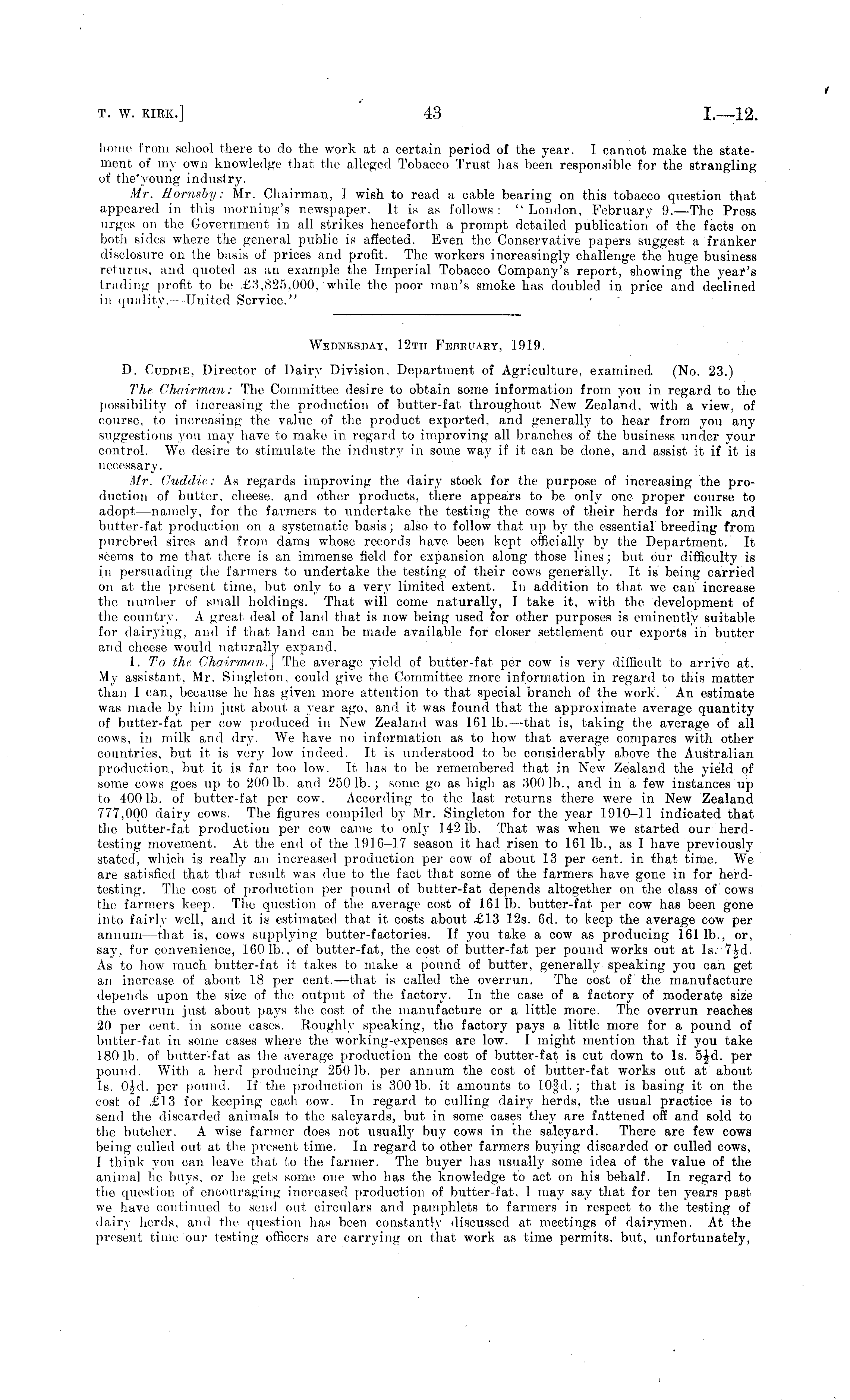 Wednesday, 12th February, 1919. D. Cuddie, Director of Dairy Division, Department of Agriculture, examined (No. 23.) The Chairman: The, Committee desire to obtain some information from you in regard to the possibility of increasing the production of butter-fat throughout New Zealand, with a view, of course, to increasing the value of the product exported, and generally to hear from you any suggestions you may have to make in regard to improving all branches of the business under your control. We desire to stimulate the industry in some way if it can be done, and assist it if it is necessary. Mr. Cuddie: As regards improving the dairy stock for the purpose of increasing the production of butter, cheese, and other products, there appears to be only one proper course to adopt—namely, for the farmers to undertake the testing the cows of their herds for milk and butter-fat production on a basis; also to follow that up by the essential breeding from purebred sires and from dams whose records have been kept officially by the Department. It seems to me that there is an immense field for expansion along those lines; but our difficulty is in persuading the farmers to undertake the testing of their cows generally. It is being carried on at the present time, but only to a very limited extent. In addition to that we can increase the number of small holdings. That will come naturally, I take it, with the development of the country. A great deal of land that is now being used for other purposes is eminently suitable for dairying, and if that land can be made available for closer settlement our exports in butter and cheese would naturally expand. I. To the Chairman.] The average yield of butter-fat per cow is very difficult to arrive at. My assistant, Mr. Singleton, could give the Committee more information in regard to this matter than I can, because he has given more attention to that special branch of the work. An estimate was made by him just about a year ago, and it was found that the approximate average quantity of butter-fat per cow produced in New Zealand was 161 lb. —that is, taking the average of all cows, in milk and dry. We have no information as to how that average compares with other countries, but it is very low indeed. It is understood to be considerably above the Australian production, but it is far too low. It has to be remembered that in New Zealand the yield of some cows goes up to 200 Ib. and 2501b.; some go as high as 3001b., and in a few instances up to 400 lb. of butter-fat per cow. According to the last returns there were in New Zealand 777,000 dairy cows. The figures compiled by Mr. Singleton for the year 1910-11 indicated that the butter-fat production per cow came to only 1421b. That was when we started our herdtesting movement. At the end of the 1916-17 season it had risen to 161 lb., as I have previously stated, which is really an increased production per cow of about 13 per cent, in that time. We are satisfied that that result was due, to the fact that some of the farmers have gone in for herdtesting. The cost of production per pound of butter-fat depends altogether on the class of cows the farmers keep. The question of the average cost of 161 lb. butter-fat per cow has been gone into fairly well, and it is estimated that it costs about £13 12s. 6d. to keep the average cow per annum —that is, cows supplying butter-factories. If you take a cow as producing 1611b., or, say, for convenience, 1601b.. of butter-fat, the cost of butter-fat per pound works out at Is. 7id. As to how much butter-fat it takes to make a pound of butter, generally speaking you can get an increase, of about 18 per cent, —that is called the overrun. The cost of the manufacture depends upon the size of the output of the factory. In the case of a factor)' of moderate size the overrun just about pays the cost of the manufacture or a little more. The overrun reaches 20 per cent, in some cases. Roughly speaking, the factory pays a little more for a pound of butter-fat in some cases where the working-expenses are low. I might mention that if you take 1801b. of butter-fat as the average production the cost of butter-fat is cut down to Is. sJ>d. per pound. With a herd" producing 250 lb. per annum the cost of butter-fat works out at about Is. o|d. per pound. If the production is 300 Ib. it amounts to 10f-d.; that is basing it on the cost of £13 for keeping each cow. In regard to culling dairy herds, the usual practice, is to send the discarded animals to the saleyards, but in some cases they are fattened off and sold to the butcher. A wise farmer does not usuallj' buy cows in the saleyard. There are few cows being culled out at the present time. In regard to other farmers buying discarded or culled cows, I think you can leave that to the farmer. The buyer has usually some idea of the value of the animal he buys, or he gets some one who has the knowledge to act on his behalf. In regard to the question of encouraging increased production of butter-fat. I may say that for ten years past we have continued to send out circulars and pamphlets to farmers in respect to the testing of dairy herds, and the question has been constantly discussed at meetings of dairymen. At the present time our testing officers are carrying on that work as time permits, but, unfortunately,
