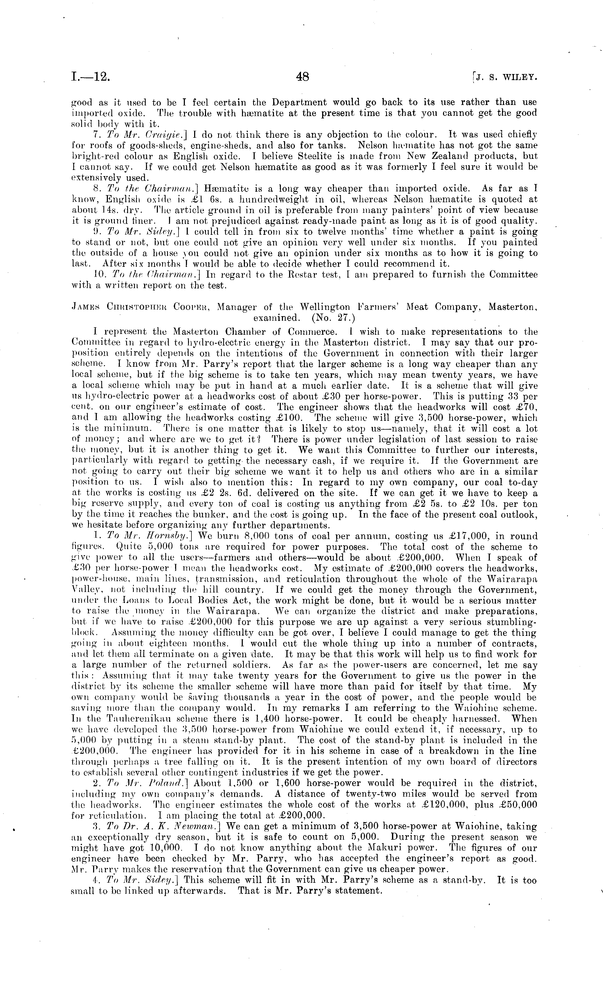 good as it used to be I feel certain the Department would go back to its use rather than use imported oxide. The trouble with haematite at the present time is that you cannot get the good solid body with it. 7. To Mr. Graigie.] Ido not think there is any objection to the colour. It was used chiefly for roofs of goods-sheds, engine-sheds, and also for tanks. Nelson haematite has not got the same bright-red colour as English oxide. I believe Steelite is made from New Zealand products, but I cannot say. If we could get Nelson haematite as good as it was formerly I feel sure it would be extensively used. 8. To the Chairman.] Haematite is a long way cheaper than imported oxide. As far as I know, English oxide is £1 6s. a hundredweight in oil, whereas Nelson haematite is quoted at about 14s. dry. The article ground in oil is preferable from many painters' point of view because it is ground finer. lam not prejudiced against ready-made paint as long as it is of good quality. 9. To Mr. Sidey.] I could tell in from six to twelve months' time whether a paint is going to stand or not, but one could not give an opinion very well under six months. If you painted the outside of a house you could not give an opinion under six months as to how it is going to last. After six months I would be able to decide whether I could recommend it. 10. To the Chairman.] In regard to the Restar test, I am prepared to furnish the Committee with a written report on the test. James Chutstopiter Cooper, Manager of the Wellington Farmers' Meat Company, Masterton, examined. (No. 27.) I represent the Masterton Chamber of Commerce. I wish to make representations to the Committee in regard to hydro-electric energy in the Masterton district. I may say that our proposition entirely depends on the intentions of the Government in connection with their larger scheme. I know from Mr. Parry's report that the larger scheme is a long way cheaper than any local scheme, but if the big scheme is to take ten years, which may mean twenty years, we have a local scheme which may be put in hand at a much earlier date. It is a scheme that will give us hydro-electric power at a headworks cost of about £30 per horse-power. This is putting 33 per cent, on our engineer's estimate of cost. The engineer shows that the headworks will cost £70, and I am allowing the headworks costing £100. The scheme will give 3,500 horse-power, which is the minimum. There is one matter that is likely to stop us—namely, that it will cost a lot of money; and where are we to get it? There is power under legislation of last session to raise the money, but it is another thing to get it. We want this Committee to further our interests, particularly with, regard to getting the necessary cash, if we require it, If the Government are not going to carry out their big scheme we want it to help us and others who are in a similar position to us. I wish also to mention this: In regard to my own company, our coal to-day at the works is costing us £2 2s. 6d. delivered on the site. If we can get it we have to keep a big reserve supply, and every ton of coal is costing us anything from £2 ss. to £2 10s. per ton by the time it reaches the bunker, and the cost is going up. In the face of the present coal outlook, we hesitate before organizing any further departments. 1. To Mr. Hornsby.] We burn 8,000 tons of coal per annum, costing us £17,000, in round figures. Quite 5,000 tons are required for power purposes. The total cost of the scheme to give power to all the users —farmers and others —would be about £200,000. When I speak of £30 per horse-powerT mean the headworks cost. My estimate of £200.000 covers the headworks, power-house, main lines, transmission, and reticulation throughout the whole of the Wairarapa Valley, not including the hill country. If we could get the money through the Government, under the Loans to Local Bodies Act, the work might be done, but it would be a serious matter to raise the .money in the Wairarapa. We can organize the district and make preparations, but if we have to raise £200,000 for this purpose we are up against a very serious stumblingblock. Assuming the money difficulty can be got over, I believe I could manage to get the thing going in about eighteen months. I. would cut the whole thing up into a number of contracts, and let them all terminate on a given date, It may be that this work will help us to find work, for a large number of the returned soldiers. As far as the power-users are concerned, let me say this : Assuming that it may take twenty years for the Government to give us the power in the district by its scheme the smaller scheme will have more than paid for itself by that time. My own company would be saving thousands a year in the cost of power, and the people would be saving more than the company would. In my remarks I am referring to the Waiohine scheme. In the Tatiherenikau scheme there is 1,400 horse-power. It could be cheaply harnessed. When we have developed the 3,500 horse-power from Waiohine we could extend it, if necessary, up to 5,000 by putting in a steam stand-by plant, The cost of the stand-by plant is included in the £200,000. The engineer has provided for it in his scheme in case of a breakdown in the line through perhaps a tree falling on it. It is the present intention of my own board of directors to establish several other contingent industries if we get the power. 2. To Mr. Poland.] About 1,500 or 1,600 horse-power would be required in the district, including my own company's demands. A distance of twenty-two miles would be served from the headworks. The engineer estimates the whole cost of the works at £120,000, plus £50,000 for reticulation. lam placing the total at £200,000. 3. To Dr. A. K. Newman.] We can get a minimum of 3,500 horse-power at Waiohine, taking an exceptionally dry season, but it is safe to count on 5,000. During the present season we might have got 10,000. I do not know anything