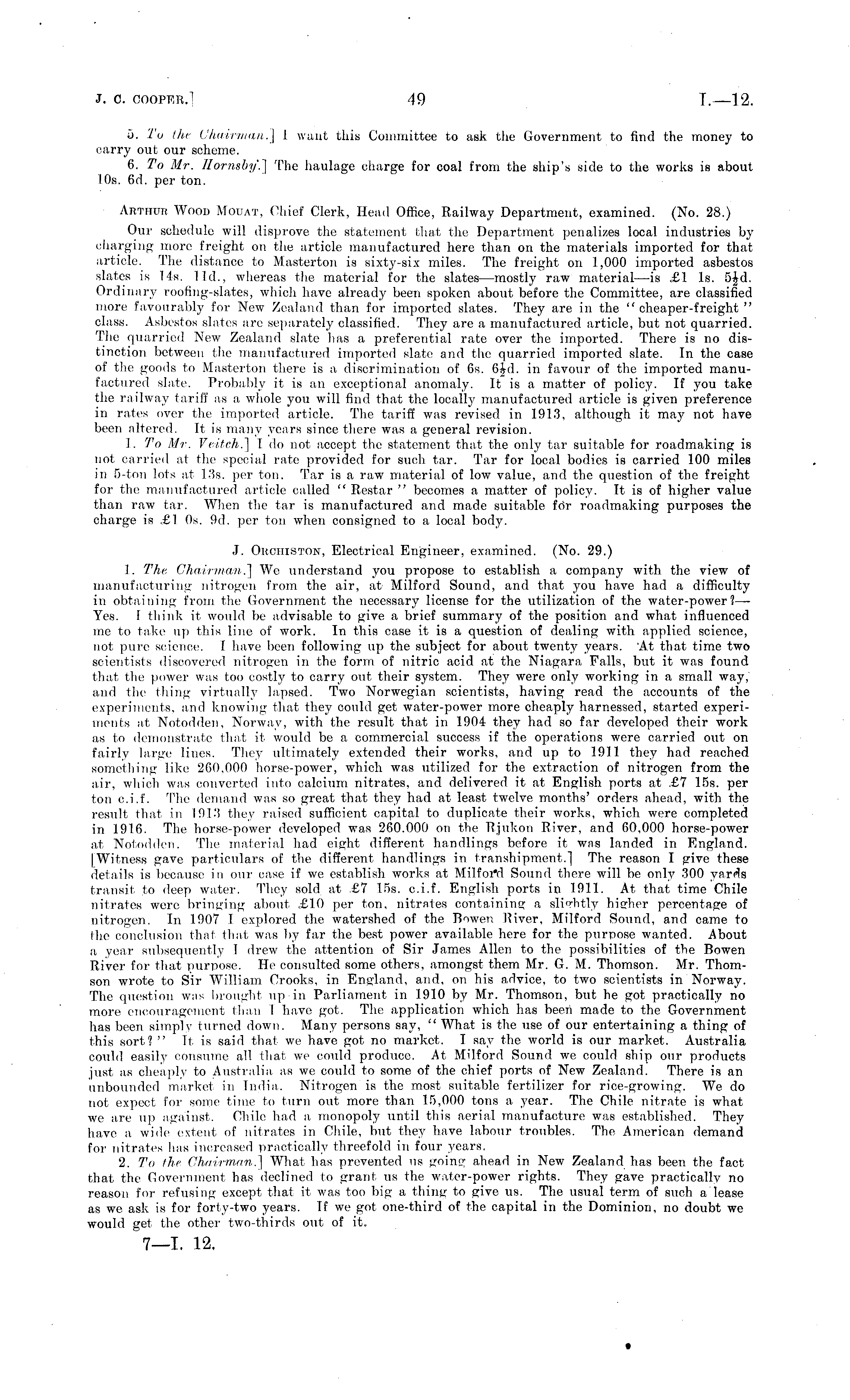 5. To the Chairman.] 1 want this Committee to ask the Government to find the money to carry out our scheme. 6. To Mr. Hornsby'.] The haulage charge for coal from the ship's side to the works is about 10s. 6d. per ton. Arthur Wood Mouat, Chief Clerk, Head Office, Railway Department, examined. (No. 28.) Our schedule will disprove the statement that the Department penalizes local industries by charging more freight on the article manufactured here than on the materials imported for that article. The distance to Masterton is sixty-six miles. The freight on 1,000 imported asbestos slates is 14s. lid., whereas the material for the slates —mostly raw material —is £1. Is. s|d. Ordinary roofing-slates, which have already been spoken about before the Committee, are classified more favourably for New Zealand than for imported slates. They are in the " cheaper-freight " class. Asbestos slates are separately classified. They are a manufactured article, but not quarried. The quarried New Zealand slate has a preferential rate over the imported. There is no distinction between the manufactured imported slate and the quarried imported slate. In the case of the goods to Masterton there is a discrimination of 6s. 6|d. in favour of the imported manufactured slate. Probably it is an exceptional anomaly. It is a matter of policy. If you take the railway tariff as a whole you will find that the locally manufactured article is given preference in rates over the imported article. The tariff was revised in 1913, although it may not have been altered. It is many years since there was a general revision. 1. To Mr. Veitch.] I do not accept the statement that the only tar suitable for roadmaking is not carried at the special rate provided for such tar. Tar for local bodies is carried 100 miles in 5-ton lots at 13s. per ton. Tar is a raw material of low value, and the question of the freight for the manufactured article called " Restar " becomes a matter of policy. It is of higher value than raw tar. When the tar is manufactured and made suitable fdr roadmaking purposes the charge is £1 os. 9d. per ton when consigned to a local body. J. Orchiston, Electrical Engineer, examined. (No. 29.) 1. The Chairman.] We understand you propose to establish a company with the view of manufacturing nitrogen from the air, at Milford Sound, and that you have had a difficulty in obtaining from the Government the necessary license for the utilization of the water-power?— Yes. I think it would be advisable to give a brief summary of the position and what influenced me to take up this line of work. In this case it is a question of dealing with applied science, not pure science. I have been following up the subject for about twenty years. At that time two scientists discovered nitrogen in the form of nitric acid at the Niagara Falls, but it was found that the power was too costly to carry out their system. They were only working in a small way, and the thing virtually lapsed. Two Norwegian scientists, having read the accounts of the experiments, and knowing that they could get water-power more cheaply harnessed, started experiments at Notodden, Norway, with the result that in 1904 they had so far developed their work as to demonstrate that it would be a commercial success if the operations were carried out on fairly large lines. They ultimately extended their works, and up to 1911 they had reached something like 260,000 horse-power, which was utilized for the extraction of nitrogen from the air, which was converted into calcium nitrates, and delivered it at English ports at £7 15s. per ton c.i.f. The demand was so great that they had at least twelve months' orders ahead, with the result that in 1913 they raised sufficient capital to duplicate their works, which were completed in 1916. The horse-power developed was 260.000 on the Rjukon River, and 60,000 horse-power at Notodden. The material had eight different handlings before it was landed in England. [Witness gave particulars of the different handlings in transhipment.] The reason I give these details is because in our case if we establish works at MilforYl Sound there will be only 300 yards transit to deep water. They sold at £7 1.55. c.i.f. English ports in 1911. At that time Chile nitrates were bringing about £10 per ton, nitrates containing a slightly higher percentage of nitrogen. In 1907 I explored the watershed of the Bowen River, Milford Sound, and came to the conclusion that that was by far the best power available here for the purpose wanted. About a year subsequently I drew the attention of Sir James Allen to the possibilities of the Bowen River for that purpose. He consulted some others, amongst them Mr. G. M. Thomson. Mr. Thomson wrote to Sir William Crooks, in England, and, on his advice, to two scientists in Norway. The question was brought up in Parliament in 1910 by Mr. Thomson, but he got practically no more encouragement than I have got. The application which has been made to the Government has been simply turned down. Many persons say, " What is the use of our entertaining a thing of this sort? " It is said that we have got no market. I say the world is our market. Australia could easily consume all that we could produce. At Milford Sound we could ship our products just as cheaply to Australia as we could to some of the chief ports of New Zealand. There is an unbounded market in India, Nitrogen is the most suitable fertilizer for rice-growing. We do not expect for some time to turn out more than 15,000 tons a year. The Chile nitrate is what we are up against. Chile had a monopoly until this aerial manufacture was established. They have a wide extent of nitrates in Chile, but they have labour troubles. The American demand for nitrates has increased practically threefold in four years. 2. To the Chairman.] What has prevented us going ahead in New Zealand has been the fact that the Government has declined to grant us the water-power rights. They gave practical