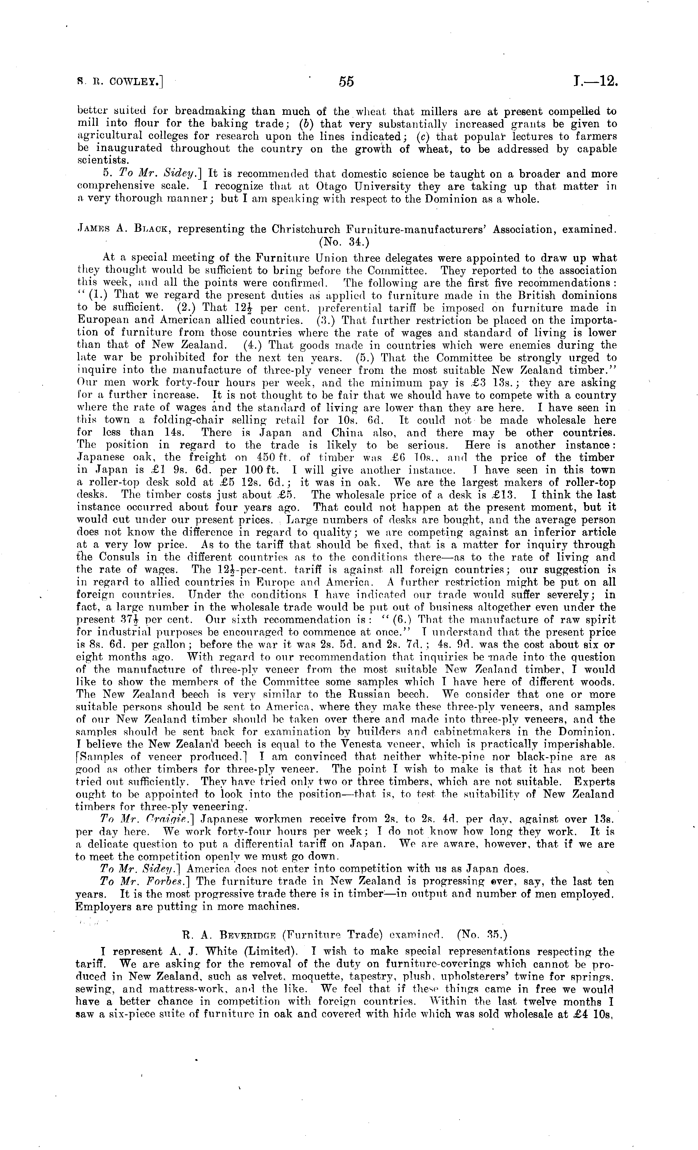 better suited for breadmaking than much of the wheat that millers are at present compelled to mill into flour for the baking trade; (b) that very substantially increased grants be given to agricultural colleges for research upon the lines indicated; (c) that popular lectures to farmers be inaugurated throughout the country on the growth of wheat, to be addressed by capable scientists. 5. To Mr. Sidey.] It is recommended that domestic science be taught on a broader and more comprehensive scale. I recognize that at Otago University they are taking up that matter in a very thorough manner; but I am speaking with respect to the Dominion as a whole. James A. Black, representing the Christchurch Furniture-manufacturers' Association, examined. (No. 34.) At a special meeting of the Furniture Union three delegates were appointed to draw up what they thought would be sufficient to bring before the Committee. They reported to the association this week, and all the points were confirmed. The following are the first five recommendations: " (1.) That we regard the present duties as applied to furniture made in the British dominions to be sufficient. (2.) That 12J per cent, preferential tariff be imposed on furniture made in European and American allied countries. (3.) That further restriction be placed on the importation of furniture from those countries where the rate of wages and standard of living is lower than that of New Zealand. (4.) That goods made in countries which were enemies during the late war be prohibited for the next ten years. (5.) That the Committee be strongly urged to inquire into the manufacture of three-ply veneer from the most suitable New Zealand timber." Our men work forty-four hours per week, and the minimum pay is £3 135.; they are asking for a further increase. It is not thought to be fair that we should have to compete with a country where the rate of wages and the standard of living are lower than they are here. I have seen in this town a folding-chair selling retail for 10s. 6d. It could not be made wholesale here for less than 14s. There is Japan and China also, and there may be other countries. The position in regard to the trade is likely to be serious. Here is another instance: Japanese oak, the freight on 450 ft. of timber was £6 10s., and the price of the timber in Japan is £1 9s. 6d. per 100 ft. I will give another instance. T have seen in this town a roller-top desk sold at £5 1.25. 6d.; it was in oak. We are the largest makers of roller-top desks. The timber costs just about £5. The wholesale price of a desk is £13. I think the last instance occurred about four years ago. That could not happen at the present moment, but it would cut under our present prices. Large numbers of desks are bought, and the average person does not know the difference in regard to quality; we are competing against an inferior article at a very low price. As to the tariff that should be fixed, that is a matter for inquiry through the Consuls in the different countries as to the conditions there—as to the rate of living and the rate of wages. The 12|-per-cent. tariff is against, all foreign countries; our suggestion is in regard to allied countries in Europe, and America. A further restriction might be put on all foreign countries. Under the conditions T have indicated our trade would suffer severely; in fact, a large number in the wholesale trade would be put out of business altogether even under the present 37J per cent. Our sixth recommendation is : " (6.) That the manufacture of raw spirit for industrial purposes be encouraged to commence at once." T understand that the present price is Bs. 6d. per gallon ; before the war it was 2s. sd. and 2s. 7d. ; 4s. 9d. was the cost about six or eight months ago. With regard to our recommendation that inquiries be made into the question of the manufacture of three-ply veneer from the most suitable New Zealand timber, I would like to show the members of the Committee some samples which I have here of different woods. The New Zealand beech is very similar to the Russian beech. We consider that one or more suitable persons should be sent to America, where they make these three-ply veneers, and samples of our New Zealand timber should be, taken over there and made into three-ply veneers, and the samples should be sent back for examination by builders and cabinetmakers in the Dominion. I believe the New Zealand beech is equal to the Venesta veneer, which is practically imperishable. [Samples of veneer produced.] I am convinced that neither white-pine nor black-pine are as good as other timbers for three-ply veneer. The point I wish to make is that it has not been tried out sufficiently. They have tried only two or three timbers, which are not suitable. Experts ought to be appointed to look into the position—that is, to test the suitability of New Zealand timbers for three-ply veneering. To Mr. Cra,igie.] Japanese workmen receive from 2s. to 2s. -Id. per day, against over 13s. per day here. We work forty-four hours per week; T do not know how long they work. It is a delicate question to put a differential tariff on Japan. We are aware, however, that if we are to meet the competition openly we must go down. To Mr. Sidey.] America does not enter into competition with us as Japan does. To Mr. Forbes.] The furniture trade in New Zealand is progressing ever, say, the last ten years. It is the most progressive trade there is in timber —in output and number of men employed. Employers are putting in more machines. R. A. Beveridge (Furniture Trade) examined. (No. 35.) I represent A. J. White (Limited). I wish to make special representations respecting the tariff. We are asking for the removal of the duty on furniture-coverings which cannot be produced in New Zealand, such as velvet, moquette, tapestry, plush, upholsterers' twine for springs, sewing, and mattress-work, and the like. We feel that if these things came in free we would have a better cha