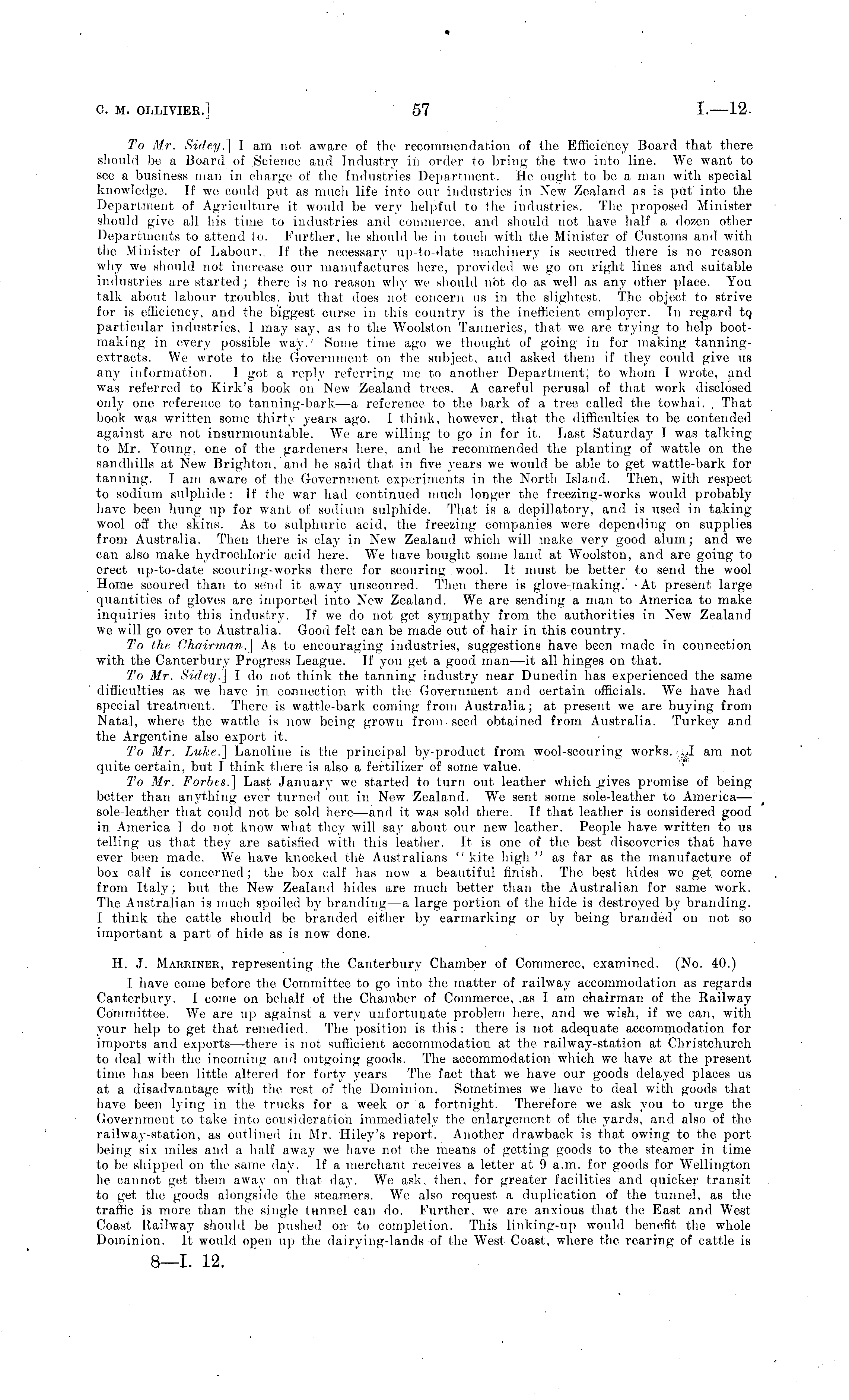 To Mr. Sidey.] 1 am not aware of the recommendation of the Efficiency Board that there should be a Board of Science and Industry in order to bring the two into line. We want to see a business man in charge of the Industries Department, He ought to be a man with special knowledge, If we could put as much life into our industries in New Zealand as is put into the Department of Agriculture it would be very helpful to the industries. The proposed Minister should give all his time to industries and commerce, and should not have half a dozen other Departments to attend to. Further, he should be in touch with the Minister of Customs and with the Minister of Labour., If the necessary up-to-date machinery is secured there is no reason why we should not increase our manufactures here, provided we go on right lines and suitable industries are started; there is no reason why we should not do as well as any other place. You talk about labour troubles, but that does not concern us in the slightest. The object to strive for is efficiency, and the biggest curse in this country is the inefficient employer. In regard tq particular industries, J may say, as to the Woolston Tanneries, that we are trying to help bootmaking in every possible way.' Some time ago we thought of going in for making tanningextracts. We wrote to the Government on the subject, and asked them if they could give us any information. 1 got a reply referring me to another Department, to whom I wrote, and was referred to Kirk's book on New Zealand trees. A careful perusal of that work disclosed only one reference to tanning-bark—a reference to the bark of a tree called the towhai. , That book was written some thirty years ago. I think, however, that the difficulties to be contended against are not insurmountable. We are willing to go in for it. Last Saturday 1 was talking to Mr. Young, one of the gardeners here, and he recommended the planting of wattle on the sandhills at New Brighton, and he said that, in five years we would be able to get wattle-bark for tanning. I am aware of the Government experiments in the North Island. Then, with respect to sodium sulphide: If the war had continued much longer the freezing-works would probably have been hung up for want of sodium sulphide. That is a dcpillatory, and is used in taking wool off the skins. As to sulphuric acid, the freezing companies were depending on supplies from Australia. Then there is clay in New Zealand which will make very good alum; and we can also make hydrochloric acid here. We have bought some land at Woolston, and are going to erect up-to-date scouring-works there for scouring wool. It must be better to send the wool Home scoured than to send it away unsecured. Then there is glove-making. -At present large quantities of gloves are imported into New Zealand. We are sending a man to America to make inquiries into this industry. If we do not get sympathy from the authorities in New Zealand we will go over to Australia. Good felt can be made out of hair in this country. To the Chairman.] As to encouraging industries, suggestions have been made in connection with the Canterbury Progress League. If you get a good man—it all hinges on that. To Mr. Sidey.] I do not think the tanning industry near Dunedin has experienced the same difficulties as we have in connection with the Government and certain officials. We have had special treatment, There is wattle-bark coming from Australia; at present we are buying from Natal, where the wattle is now being grown from seed obtained from Australia. Turkey and the Argentine also export it. To Mr. Luke.] Lanoline is the principal by-product from wool-scouring works, wl am not quite certain, but I think there is also a fertilizer of some value. To Mr. Forbes.] Last January we started to turn out leather which gives promise of being better than anything ever turned out in New Zealand. We sent some sole-leather to America— sole-leather that could not be sold here—and it was sold there. If that leather is considered good in America I do not know what they will say about our new leather. People have written to us telling us that they are satisfied with this leather. It is one of the best discoveries that have ever been made. We have knocked the Australians " kite high " as far as the manufacture of box calf is concerned; the box calf has now a beautiful finish. The best hides we get. come from Italy; but the New Zealand hides are much better than the Australian for same work. The Australian is much spoiled by branding—a large portion of the hide is destroyed by branding. I think the cattle should be branded either by earmarking or by being branded on not so important a part of hide as is now done. H. J. Marriner, representing the Canterbury Chamber of Commerce, examined. (No. 40.) I have come before the Committee to go into the matter of railway accommodation as regards Canterbury. I come on behalf of the Chamber of Commerce, .as I am chairman of the Railway Committee. We are up against a very unfortunate problem here, and we wish, if we can, with your help to get that remedied. The position is this: there is not adequate accommodation for imports and exports—there is not sufficient accommodation at the railway-station at Christchurch to deal with the incoming and outgoing goods. The accommodation which we have at the present time has been little altered for forty years The fact that we have our goods delayed places us at a disadvantage with the rest of the Dominion. Sometimes we have to deal with goods that have been lying in the trucks for a week or a fortnight. Therefore we ask you to urge the Government to take into consideration immediately the enlargement of the yards, and also of the railway-station, as outlined in Mr. Hiley's report, Another drawback is that owing to the port being six miles and a half away we have not the means of getting goods to the steamer in time to be shipped on the same day. If a merchant receives a lett