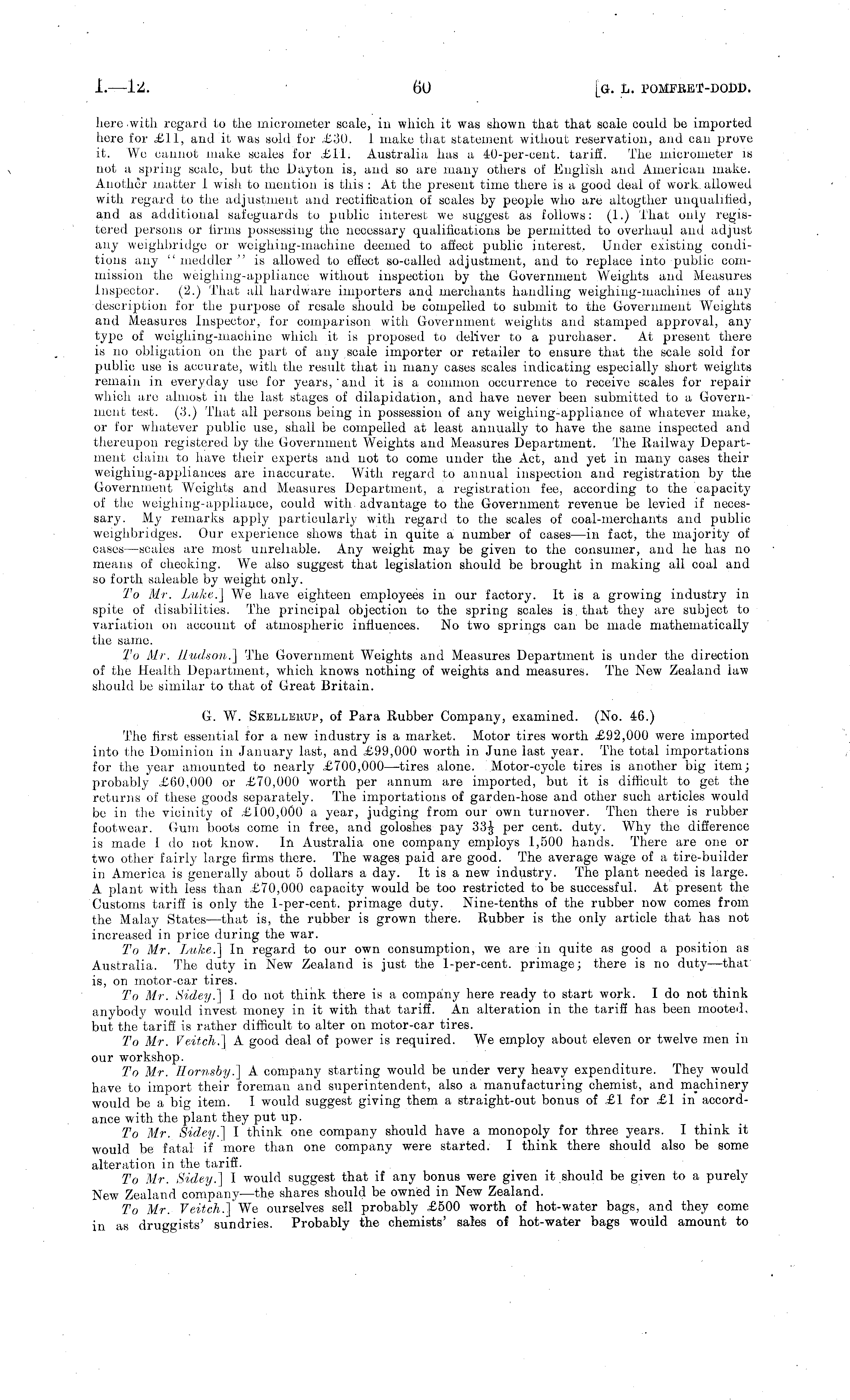 here with regard to the micrometer scale, in which it was shown that that scale could be imported here for £11, and it was sold for £30. 1 make that statement without reservation, and can prove it. We cannot make scales for £11. Australia has a 40-per-cent. tariff. The micrometer is not a spring scale, but the Dayton is, and so are many others of English and American make. Another matter I wisli to mention is this : At the present time there is a good deal of work allowed with regard to the adjustment and rectification of scales by people who are altogthor unqualified, and as additional safeguards to public interest we suggest as follows: (1.) That only registered persons or firms possessing the necessary qualifications be permitted to overhaul and adjust any weighbridge or weighing-machine deemed to affect public interest. Under existing conditions any " meddler " is allowed to effect so-called adjustment, and to replace into public commission the weighing-appliance without inspection by the Government Weights and Measures inspector. (2.) That all hardware importers and merchants handling weighing-machines of any description for the purpose of resale should be compelled to submit to the Government Weights and Measures Inspector, for comparison with Government weights and stamped approval, any type of weighing-machine which it is proposed to deliver to a purchaser. At present there is no obligation on the part of any scale importer or retailer to ensure that the scale sold for public use is accurate, with the result that in many cases scales indicating especially short weights remain in everyday use for years, "and it is a common occurrence to receive scales for repair which are almost in the last stages of dilapidation, and have never been submitted to a Government test. (3.) That all persons being in possession of any weighing-appliance of whatever make, or for whatever public use, shall be compelled at least annually to have the same inspected and thereupon registered by the Government Weights and Measures Department. The Railway Department claim to have their experts and not to come under the Act, and yet in many cases their weighing-appliances are inaccurate. With regard to annual inspection and registration by the Government Weights and Measures Department, a registration fee, according to the capacity of the weighing-appliance, could with advantage to the Government revenue be levied if necessary. My remarks apply particularly with regard to the scales of coal-merchants and public weighbridges. Our experience shows that in quite a number of cases —in fact, the majority of cases —scales are most unreliable. Any weight may be given to the consumer, and he has no means of checking. We also suggest that legislation should be brought in making all coal and so forth saleable by weight only. To Mr. Luke.]' We have eighteen employees in our factory. It is a growing industry in spite of disabilities. The principal objection to the spring scales is. that they are subject to variation on account of atmospheric influences. No two springs can be made mathematically the same. To Mr. Hudson.] The Government Weights and Measures Department is under the direction of the Health Department, which knows nothing of weights and measures. The New Zealand iaw should be similar to that of Great Britain. G. W. Skellerup, of Para Rubber Company, examined. (No. 46.) The first essential for a new industry is a market. Motor tires worth £92,000 were imported into the Dominion in January last, and £99,000 worth in June last year. The total importations for the year amounted to nearly £700,000 —tires alone. Motor-cycle tires is another big item; probably £60,000 or £70,000 worth per annum are imported, but it is difficult to get the returns of these goods separately. The importations of garden-hose and other such articles would be in the vicinity of £100,000 a year, judging from our own turnover. Then there is rubber footwear. Gum boots come in free, and goloshes pay per cent. duty. Why the difference is made Ido not know. In Australia one company employs 1,500 hands. There are one or two other fairly large firms there. The wages paid are good. The average wage of a tire-builder in America is generally about 5 dollars a day. It is a new industry. The plant needed is large. A plant with less than £70,000 capacity would be too restricted to be successful. At present the Customs tariff is only the 1-per-cent. primage duty. Nine-tenths of the rubber now comes from the Malay States —that is, the rubber is grown there. Rubber is the only article that has not increased in price during the war. To Mr. Luke.] In regard to our own consumption, we, are in quite as good a position as Australia. The duty in New Zealand is just the 1-per-cent. primage; there is no duty—that is, on motor-car tires. To Mr. Sidey.] I do not think there is a company here ready to start work. Ido not think anybody would invest money in it with that tariff. An alteration in the tariff has been mooted, but the tariff is rather difficult to alter on motor-car tires. To Mr. Veitch.] A good deal of power is required. We employ about eleven or twelve men in our workshop. To Mr. Hornsby.] A company starting would be under very heavy expenditure. They would have to import their foreman and superintendent, also a manufacturing chemist, and machinery would be a big item. I would suggest giving them a straight-out bonus of £1 for £1 in accordance with the plant they put up. To Mr. Sidey.] I think one company should have a monopoly for three years. I think it would be fatal if more than one company were started. I think there should also be some alteration in the tariff. To Mr. Sidey.] I would suggest that if any bonus were given it should be given to a purely New Zealand company —the shares should be owned in New Zealand. To Mr. Veitch.] We ourselves sell probably £500 worth of hot-water bags, and they come in as druggists' sundries.