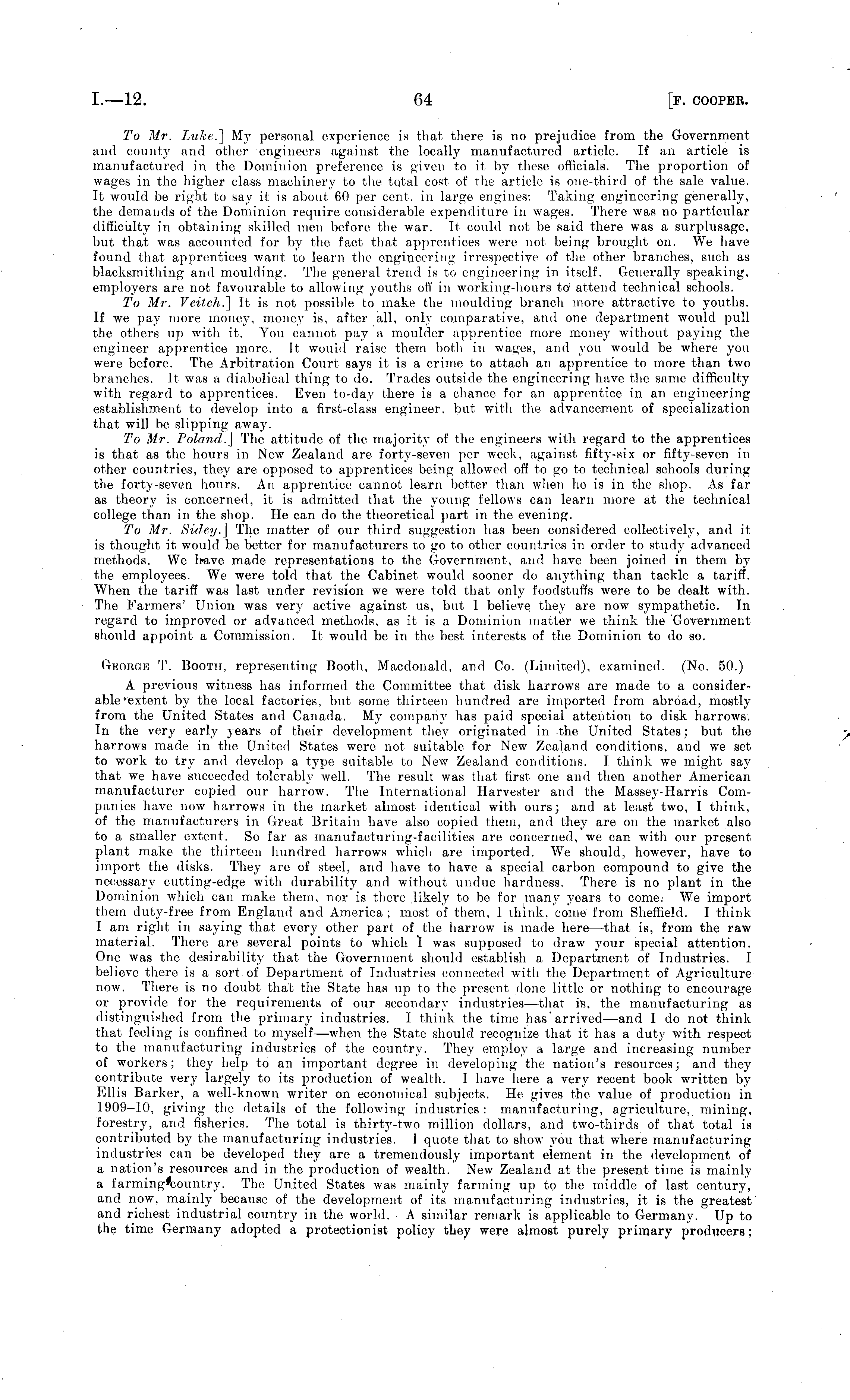 To Mr. Luke.] My personal experience is that there is no prejudice from the Government and county and other engineers against the locally manufactured article. If an article is manufactured in the Dominion preference is given to it by these officials. The proportion of wages in the higher class machinery to the total cost of the article is one-third of the sale value. It would be right to say it is about 60 per cent, in large engines: Taking engineering generally, the demands of the Dominion require considerable expenditure in wages. There was no particular difficulty in obtaining skilled men before the war. It could not be said there was a surplusage, but that was accounted for by the fact that apprentices were, not being brought on. We have found that apprentices want to learn the engineering irrespective of the other branches, such as blacksmithing and moulding. The general trend is to engineering in itself. Generally speaking, employers are not favourable to allowing youths off in working-hours to 1 attend technical schools. To Mr. Veitch.] It is not possible to make the moulding branch more attractive to youths. If we pay more money, money is, after all, only comparative, and one department would pull the others up with it. You cannot pay a moulder apprentice more money without paying the engineer apprentice more. It would raise them both in wages, and you would be where you were before. The Arbitration Court says it is a crime to attach an apprentice to more than two branches. It was a diabolical thing to do. Trades outside the engineering have the same difficulty with regard to apprentices. Even to-day there is a chance for an apprentice in an engineering establishment to develop into a first-class engineer, but with the advancement of specialization that will be slipping away. To Mr. Poland,.] The attitude of the majority of the engineers with regard to the apprentices is that as the hours in New Zealand are forty-seven per week, against fifty-six or fifty-seven in other countries, they are opposed to apprentices being allowed off to go to technical schools during the forty-seven hours. An apprentice cannot learn better than when he is in the shop. As far as theory is concerned, it is admitted that the young fellows can learn more at the technical college than in the shop. He can do the theoretical part in the evening. To Mr. Sidey.] The matter of our third suggestion has been considered eollectivelj - , and it is thought it would be better for manufacturers to go to other countries in order to study advanced methods. We have made representations to the Government, and have been joined in them by the employees. We were told that the Cabinet would sooner do anything than tackle a tariff. When the tariff was last under revision we were told that only foodstuffs were to be dealt with. The Farmers' Union was very active against us, but 1 believe they are now sympathetic. In regard to improved or advanced methods, as it is a Dominion matter we think the 'Government should appoint a Commission. It would be in the best interests of the Dominion to do so. George T. Booth, representing Booth, Macdonald, and Co. (Limited), examined. (No. 50.) A previous witness has informed the Committee that disk, harrows are made to a consider-able-extent by the local factories, but some thirteen hundred arc imported from abroad, mostly from the United States and Canada. My company has paid special attention to disk harrows. In the very early years of their development they originated in .the United States; but the harrows made in the United States were not suitable for New Zealand conditions, and we set to work to try and develop a type suitable to New Zealand conditions. I think we might say that we have succeeded tolerably well. The result was that first one and then another American manufacturer copied our harrow. The International Harvester and the Massey-Harris Companies have now harrows in the market almost identical with ours; and at least two, I think, of the manufacturers in Great Britain have also copied them, and they are on the market also to a smaller extent. So far as manufacturing-facilities are concerned, we can with our present plant make the thirteen hundred harrows which are imported. We should, however, have to import the disks. They are of steel, and have to have a special carbon compound to give the necessary cutting-edge with durability and without undue hardness. There is no plant in the Dominion which can make them, nor is there likely to be for many years to come. We import them duty-free from England and America; most of them, I think, come from Sheffield. I think I am right in saying that every other part of the harrow is made here—that is, from the raw material. There are several points to which I was supposed to draw your special attention. One was the desirability that the Government should establish a Department of Industries. I believe there is a sort of Department of Industries connected with the Department of Agriculture now. There is no doubt that the State has up to the present done little or nothing to encourage or provide for the requirements of our secondary industries—that is, the manufacturing as distinguished from the primary industries. I think the time has'arrived—and I do not think that feeling is confined to myself—when the State should recognize that it has a duty with respect to the manufacturing industries of the country. They employ a large and increasing number of workers; they help to an important degree in developing the nation's resources; and they contribute very largely to its production of wealth. I have here a very recent book written byEllis Barker, a well-known writer on economical subjects. He gives the value of production in 1909-10, giving the details of the following industries: manufacturing, agriculture, mining, forestry, and fisheries. The total is thirty-two million dollars, and two-thirds of that total is contributed by the ma