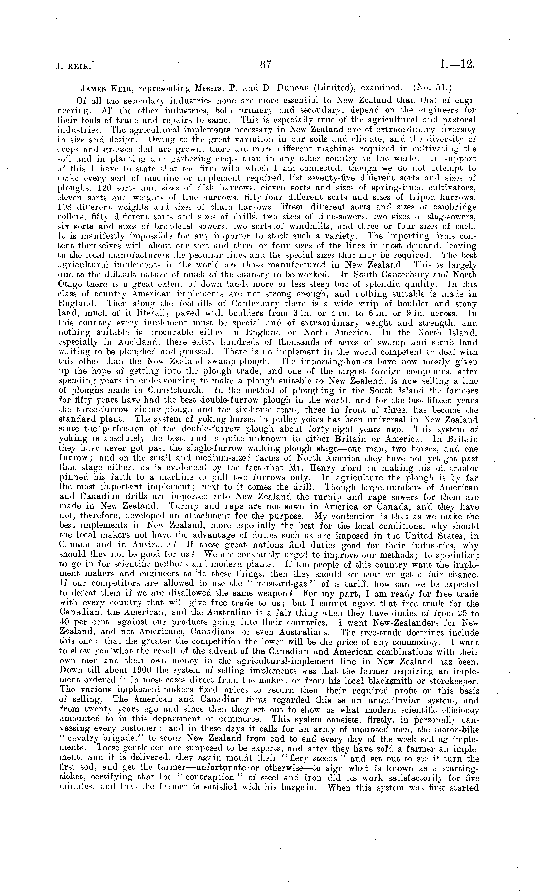 James Keir, representing Messrs. P. and D. Duncan (Limited), examined. (No, 51.) Of all the secondary industries none are more essential to New Zealand than that of engineering. All the other industries, both primary and secondary, depend on the engineers for their tools of trade and repairs to same. This is especially true of the agricultural and pastoral industries. The agricultural implements necessary in New Zealand are of extraordinary diversity in size and design. Owing to the great variation in our soils and climate, and the diversity of crops and .grasses that are grown, there are more different machines required in cultivating the soil and in planting and gathering crops than in any other country in the world. In support of this 1 have to state that the firm with which I am connected, though we do not attempt to make every sort of machine or implement required, list seventy-five different sorts and sizes of ploughs, 120 sorts and sizes of disk harrows, eleven sorts and sizes of spring-tined cultivators, eleven sorts and weights of tine harrows, fifty-four different sorts and sizes of tripod harrows, 108 different weights and sizes of chain harrows, fifteen different sorts and sizes of Cambridge rollers, fifty different sorts and sizes of drills, two sizes of lime-sowers, two sizes of slag-sowers, six sorts and sizes of broadcast sowers, two sorts .of windmills, and three or four sizes of eaqh. It is manifestly impossible for any importer to stock such a variety. The importing firms content themselves with about one sort and three or four sizes of the lines in most demand, leaving to the local manufacturers the peculiar lines and the special sizes that may be required. The best agricultural implements in the world are those manufactured in New Zealand. This is largely due to the difficult nature of much of the country to be worked. In South Canterbury and North Otago there is a great extent of down lands more or less steep but of splendid quality. In this class of country American implements are not strong enough, and nothing suitable is made in England. Then along the foothills of Canterbury there is a wide strip of boulder and stony land, much of it literally paved with boulders from 3 in. or 4 in. to 6 in. or 9 in. across. In this country every implement must be special and of extraordinary weight and strength, and nothing suitable is procurable either in England or North America. In the North Island, especially in Auckland, there exists hundreds of thousands of acres of swamp and scrub land waiting to be ploughed and grassed. There is no implement in the world competent to deal with this other than the New Zealand swamp-plough. The importing-houses have now mostly given up the hope of getting into the plough trade, and one of the largest foreign companies, after spending years in endeavouring to make a plough suitable to New Zealand, is now selling a line of ploughs made in Christchurch. In the method of ploughing in the South Island the farmers for fifty years have had the best double-furrow plough in the world, and for the last fifteen years the three-furrow riding-plough and the six-horse team, three in front of three, has become the standard plant. The system of yoking horses in pulley-yokes has been universal in New Zealand since the perfection of the double-furrow plough aboiit forty-eight years ago. This system of yoking is absolutely the best, and is quite unknown in either Britain or America. In Britain they have never got past the single-furrow walking-plough stage—one man, two horses, and one furrow; and on the small and medium-sized farms of North America they have not yet got past that stage either, as is evidenced by the fact that Mr. Henry Ford in making his oil-tractor pinned his faith to a machine to pull two furrows only. , In agriculture the plough is by far the most important implement; next to it comes the drill. Though large numbers of American and Canadian drills are imported into New Zealand the turnip and rape sowers for them are made in New Zealand. Turnip and rape are not sown in America or Canada, and they have not, therefore, developed an attachment for the purpose. My contention is that as we make the best implements in New Zealand, more especially the best for the local conditions, why should the local makers not have the advantage of duties such as are imposed in the United States, in Canada and in Australia? If these great nations' find duties good for their industries, why should they not be good for us? We are constantly urged to improve our methods; to specialize; to go in for scientific methods and modern plants. If the people of this country want the implement makers and engineers to 'do these things, then they should see that we get a fair chance. If our competitors are allowed to use the " mustard-gas " of a tariff, how can we be expected to defeat them if we are disallowed the same weapon? For my part, I am ready for free trade with every country that will give free trade to us; but I cannot agree that free trade for the Canadian, the American, and the Australian is a fair thing when they have duties of from 25 to 40 per cent, against our products going into their countries. I want New-Zealanders for New Zealand, and not Americans, Canadians, or even Australians. The free-trade doctrines include this one : that the greater the competition the lower will be the price of any commodity. I want to show you what the result of the advent of the Canadian and American combinations with their own men and their own money in the agricultural-implement line in New Zealand has been. Down till about 1900 the system of selling implements was that the farmer requiring an implement ordered it in most cases direct from the maker, or from his local blacksmith or storekeeper. The various implement-makers fixed prices to return them their required profit on this basis of selling. The American and Canadian firms regarded this as an antediluvian system, an