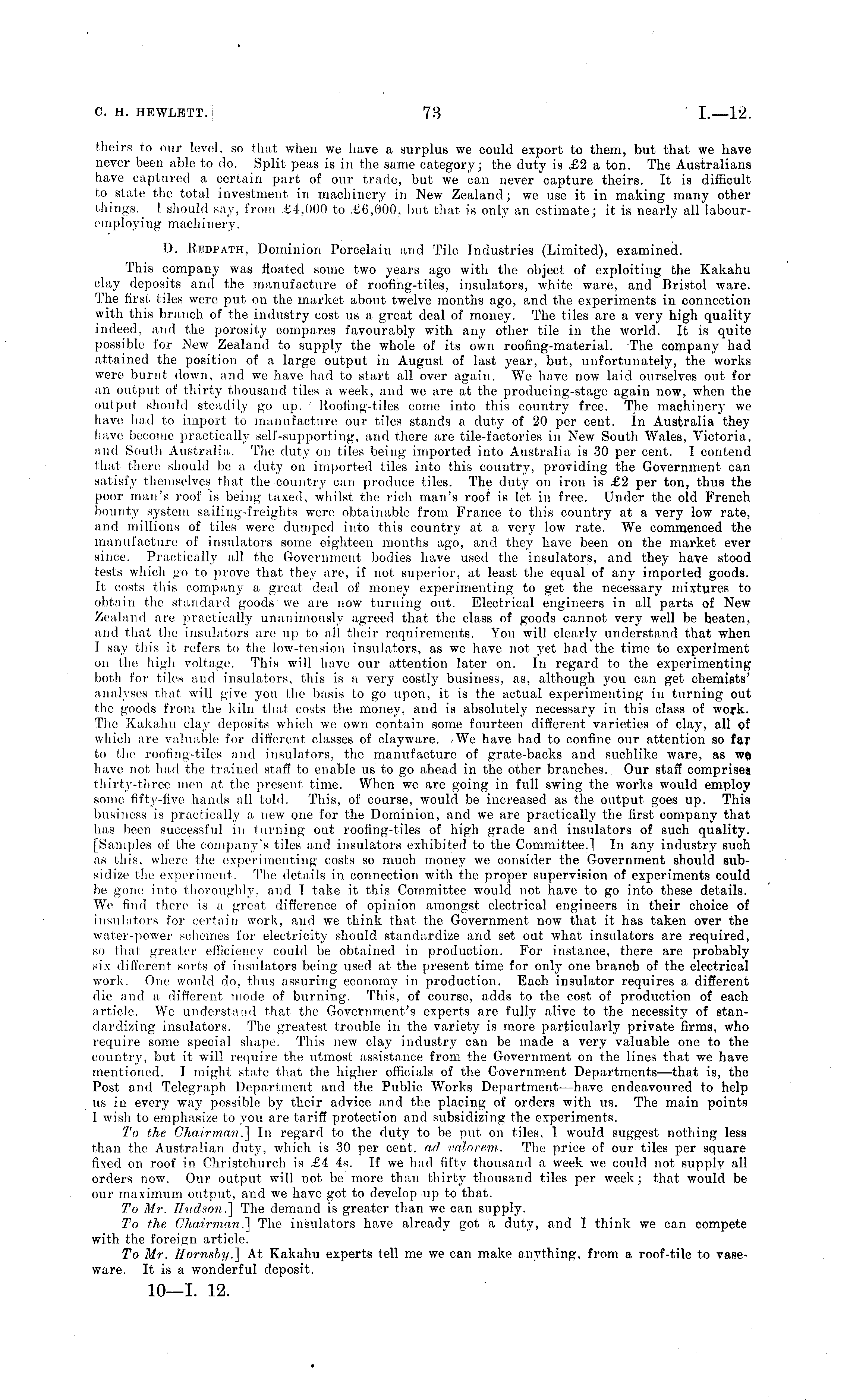 theirs to our level, so that when we have a surplus we could export to them, but that we have never been able to do. Split peas is in the same category; the duty is £2 a ton. The Australians have captured a certain part of our trade, but we can never capture theirs. It is difficult to state the total investment in machinery in New Zealand; we use it in making many other things._ I should say, from £4,000 to £6,000, but that is only an estimate; it is nearly all laboureinpioying machinery. D. Redpath, Dominion Porcelain and Tile Industries (Limited), examined. This company was floated some two years ago with the object of exploiting the Kakahu clay deposits and the manufacture of roofing-tiles, insulators, white ware, and Bristol ware. The first tiles were put on the market about twelve months ago, and the experiments in connection with this branch of the industry cost us a great deal of money. The tiles are a very high quality indeed, and the porosity compares favourably with any other tile in the world. It is quite possible for New Zealand to supply the whole of its own roofing-material. The company had attained the position of a large output in August of last year, but, unfortunately, the works were burnt down, and we have had to start all over again. We have now laid ourselves out for an output of thirty thousand tiles a week, and we are at the producing-stage again now, when the output should steadily go up, ' Roofing-tiles come into this country free. The machinery we have had to import to manufacture our tiles stands a duty of 20 per cent. In Australia they have become practically self-supporting, and there are tile-factories in New South Wales, Victoria, and South Australia. The duty on tiles being imported into Australia is 30 per cent. I contend that there should be a duty on imported tiles into this country, providing the Government can satisfy themselves that the -country can produce tiles. The duty on iron is £2 per ton, thus the poor man's roof is being taxed, whilst the rich man's roof is let in free. Under the old French bounty system sailing-freights were obtainable from France to this country at a very low rate, and millions of tiles were dumped into this country at a very low rate. We commenced the manufacture of insulators some eighteen months ago, and they have been on the market ever since. Practically all the Government bodies have used the insulators, and they have stood tests which go to prove that they are, if not superior, at least the equal of any imported goods. It costs this company a great deal of money experimenting to get the necessary mixtures to obtain the standard goods we are now turning out. Electrical engineers in all parts of New Zealand are practically unanimously agreed that the class of goods cannot very well be beaten, and that the insulators are up to all their requirements. You will clearly understand that when I say this it refers to the low-tension insulators, as we have not yet had the time to experiment on the high voltage. This will have our attention later on. In regard to the experimenting both for tiles and insulators, this is a very costly business, as, although you can get chemists' analyses that will give you the basis to go upon, it is the actual experimenting in turning out the goods from the kiln that costs the money, and is absolutely necessary in this class of work. The Kakahu clay deposits which we own contain some fourteen different varieties of clay, all of which are valuable for different classes of clayware. /We have had to confine our attention so far to the roofing-tiles and insulators, the manufacture of grate-backs and suchlike ware, as we have not had the trained staff to enable us to go ahead in the other branches. Our staff comprises thirty-three men at the present time. When we are going in full swing the works would employ some fifty-five hands all told. This, of course, would be increased as the output goes up. This business is practically a new one for the Dominion, and we are practically the first company that has been successful in turning out roofing-tiles of high grade and insulators of such quality. [Samples of the company's tiles and insulators exhibited to the Committee.] In any industry such as this, where the experimenting costs so much money we consider the Government should subsidize the experiment. The details in connection with the proper supervision of experiments could be gone into thoroughly, and I take it this Committee would not have to go into these details. We find there is a great difference of opinion amongst electrical engineers in their choice of insulators for certain work, and we think that the Government now that it has taken over the water-power schemes for electricity should standardize and set out what insulators are required, so that greater efficiency could be obtained in production. For instance, there are probably six different sorts of insulators being used at the present time for only one branch of the electrical work. One would do, thus assuring economy in production. Each insulator requires a different die and a different mode of burning. This, of course, adds to the cost of production of each article. We understand that the Government's experts are fully alive to the necessity of standardizing insulators. The greatest trouble in the variety is more particularly private firms, who require some special shape. This new clay industry can be made a very valuable one to the country, but it will require the utmost assistance from the Government on the lines that we have mentioned. I might state that the higher officials of the Government Departments—that is, the Post and Telegraph Department and the Public Works Department—have endeavoured to help us in every way possible by their advice and the placing of orders with us. The main points I wish to emphasize to you are tariff protection and subsidizing the experiments. To the Chairman.] In regard to the duty to be put on ti