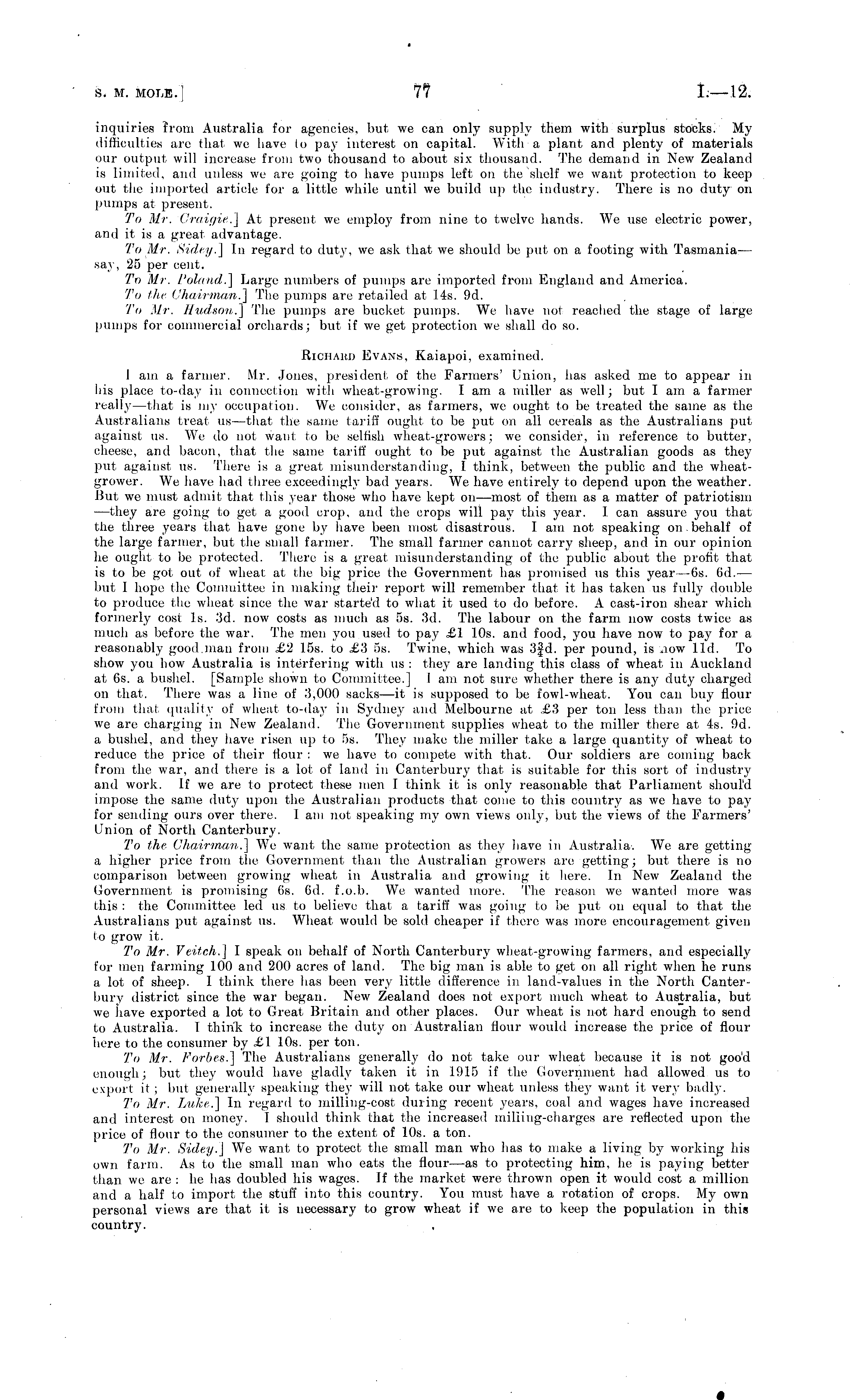 inquiries from Australia for agencies, but we can only supply them with surplus stocks. My difficulties are that we have Io pay interest on capital. With a plant and plenty of materials our output will increase from two thousand to about six thousand. The demand in New Zealand is limited, and unless we are going to have pumps left on the shelf we want protection to keep out the imported article for a little while until we build up the industry. There is no duty on pumps at present, To Mr. Graigie.] At present we employ from nine to twelve hands. We use electric power, and it is a great advantage. To Mr. Sidey.] In regard to duty, we ask that we should be put on a footing with Tasmania— say, 25 per cent. To Mr. Poland.] Large numbers of pumps are imported from England and America. To the Chairman.] The pumps are retailed at 14s. 9d. To Mr. Hudson.] The pumps are bucket pumps. We have not reached the stage of large pumps for commercial orchards; but if we get protection we shall do so. Richard Evans, Kaiapoi, examined. 1 am a farmer. Mr. Jones, president of the Farmers' Union, has asked me to appear in his place to-day in connection with wheat-growing. I am a miller as well; but I am a farmer really —that is my occupation. We consider, as farmers, we ought to be treated the same as the Australians treat vs —that the same tariff ought to be put on all cereals as the Australians put against us. We do not want to be selfish wheat-growers; we consider, in reference to butter, cheese, and bacon, that the same tariff ought to be put against the Australian goods as they put against us. There is a great misunderstanding, I think, between the public and the wheatgrower. We have had three exceedingly bad years. We have entirely to depend upon the weather. But we must admit that this year those who have kept on —most of them as a matter of patriotism —they are going to get a good crop, and the crops will pay this year. I can assure you that the three years that have gone by have been most disastrous. I am not speaking on behalf of the large farmer, but the small farmer. The small farmer cannot carry sheep, and in our opinion he ought to be protected. There is a great misunderstanding of the public about the profit that is to be got out of wheat at the big price the Government has promised us this year —6s. 6d.— but I hope the Committee in making their report will remember that it has taken us fully double to produce the wheat since the war started to what it used to do before. A cast-iron shear which formerly cost Is. 3d. now costs as much as ss. 3d. The labour on the farm now costs twice as much as before the war. The men you used to pay £1 10s. and food, you have now to pay for a reasonably good.man from £2 15s. to £3 ss. Twine, which was 3£d. per pound, is aow lid. To show you how Australia is interfering with us : they are landing this class of wheat in Auckland at 6s. a bushel. [Sample, shown to Committee.] 1 am not sure whether there is any duty charged on that. There was a line of 3,000 sacks—it is supposed to be fowl-wheat. You can buy flour from that, quality of wheat to-day in Sydney and Melbourne at £3 per ton less than the price we are charging in New Zealand. The Government supplies wheat to the miller there at 4s. 9d. a bushel, and they have risen up to ss. They make the miller take a large quantity of wheat to reduce the price of their flour :we have to compete with that, Our soldiers are coming back from the war, and there is a lot of land in Canterbury that is suitable for this sort of industry and work. If we are to protect these men I think it is only reasonable that Parliament should impose the same duty upon the Australian products that come to this country as we have to pay for sending ours over there. lam not speaking my own views only, but the views of the Farmers' Union of North Canterbury. To the. Chairman.] We want the same protection as they have in Australia. We are getting a higher price from the Government than the Australian growers are getting; but there is no comparison between growing wheat in Australia and growing it here. In New Zealand the Government is promising 6s. 6d. f.o.b. We wanted more. The reason we wanted more was this : the Committee led us to believe that a tariff was going to be put on equal to that the Australians put against us. Wheat, would be sold cheaper if there was more encouragement given to grow it. To Mr. Veitch.] I speak on behalf of North Canterbury wheat-growing farmers, and especially for men farming 100 and 200 acres of land. The big man is able to get on all right when he runs a lot of sheep. I think there has been very little difference in land-values in the North Canterbury district since the war began. New Zealand does not export much wheat to Australia, but we have exported a lot to Great Britain and other places. Our wheat is not hard enough to send to Australia. I think to increase the duty on Australian flour would increase the price of flour here to the consumer by £1 10s. per ton. To Mr. Forbes.] The Australians generally do not take our wheat because it is not good enough; but they would have gladly taken it in 1915 if the Government had allowed us to export it ; but generally speaking they will not take our wheat unless they want it very badly. To Mr. Luke.] In regard to milling-cost during recent years, coal and wages have increased and interest on money. 1 should think that the increased milling-charges are reflected upon the price of flour to the consumer to the extent of 10s. a ton. To Mr. Sidey.] We want to protect the small man who has to make a living by working his own farm. As to the small man who eats the flour —as to protecting him, he is paying better than we are :he has doubled his wages. If the market were thrown open it would cost a million and a half to import the stuff into this country. You must have a rotation of crops. My own personal views are that it is necessary to grow wheat if