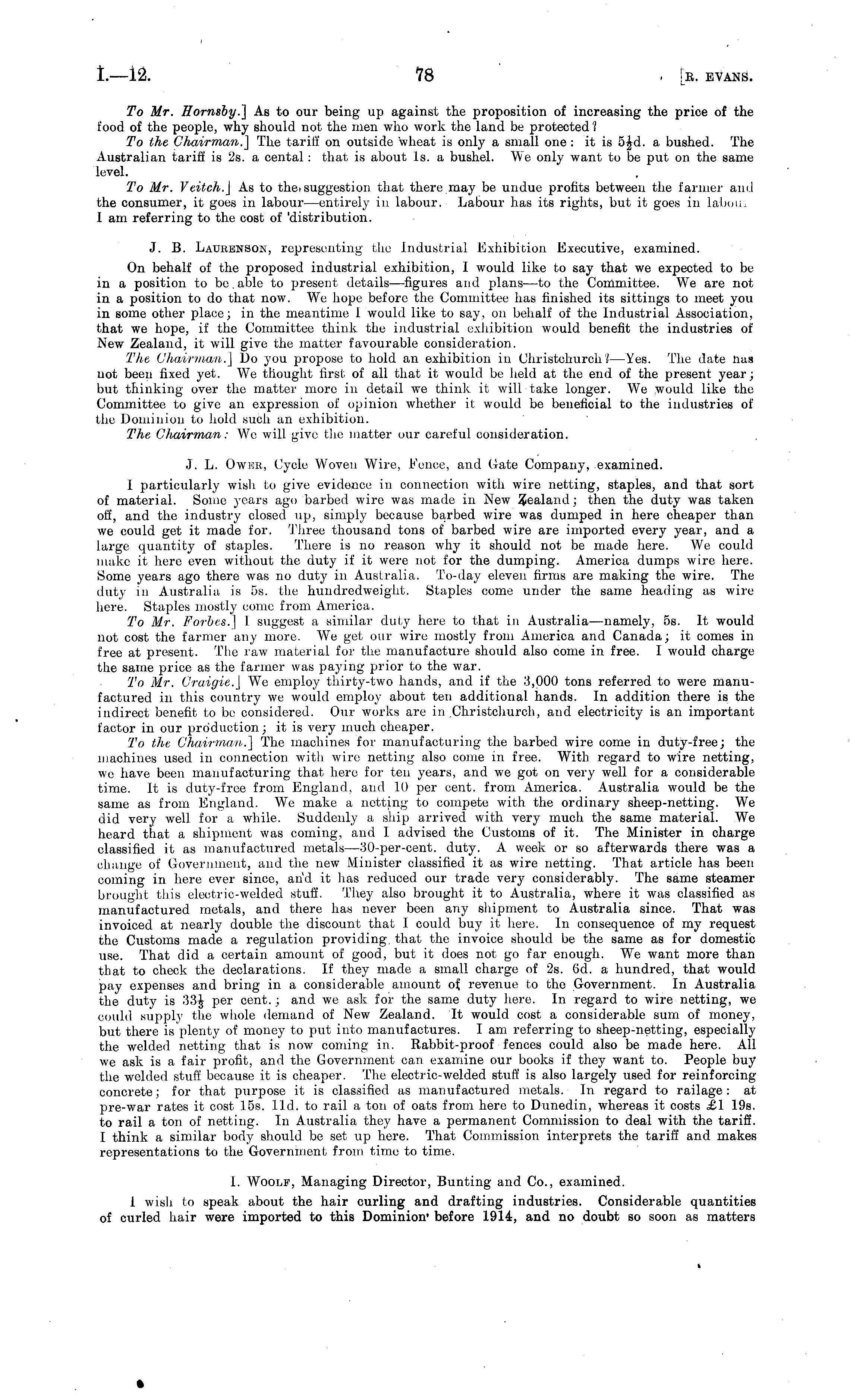 To Mr. Hornsby.] As to our being up against the proposition of increasing the price of the food of the people, why should not the men who work tiie land be protected ? To the Chairman.] The tariff on outside wheat is only a small one :it is a bushed. The Australian tariff is 2s. a cental: that is about Is. a bushel. We only want to be put on the same level. To Mr. Veitch.] As to thei suggestion that there may be undue profits between the fanner and the consumer, it goes in labour—entirely in labour. Labour has its rights, but it goes in laboui I am referring to the cost of 'distribution. J. B. Laurenson, representing the Industrial Exhibition Executive, examined. On behalf of the proposed industrial exhibition, 1 would like to say that we expected to be in a position to be. able to present details—figures and plans—to the Committee. We are not in a position to do that now. We hope before the Committee has finished its sittings to meet you in some other place; in the meantime I would like to say, on behalf of the Industrial Association, that we hope, if the Committee think the industrial exhibition would benefit the industries of New Zealand, it will give the matter favourable consideration. The Chairman.] Do you propose to hold an exhibition in Christchurch? —Yes. The date lias not been fixed yet. We thought first of all that it would be held at the end of the present year; but thinking over the matter more in detail we think it will take longer. We would like the Committee to give an expression of opinion whether it would be beneficial to the industries of the Dominion to hold such an exhibition. The. Chairman: We will give the matter our careful consideration. J. L. Ower, Cycle Woven Wire, Fence, and Gate Company, examined. I particularly wish to give evidence in connection with wire netting, staples, and that sort of material. Some years ago barbed wire was made in New Zealand; then the duty was taken off, and the industry closed up, simply because barbed wire was dumped in here cheaper than we could get it made for. Three thousand tons of barbed wire are imported every year, and a large quantity of staples. There is no reason why it should not be made here. We could make it here even without the duty if it were not for the dumping. America dumps wire here. Some years ago there was no duty in Australia. To-day eleven firms are making the wire. The duty in Australia is ss. the hundredweight. Staples come under the same heading as wire here. Staples mostly come from America. To Mr. Forbes.] I suggest a similar duty here to that in Australia—namely, ss. It would not cost the farmer any more. We get our wire mostly from America and Canada; it comes in free at present. The raw material for the manufacture should also come in free. I would charge the same price as the farmer was paying prior to the war. To Mr. Graigie.] We employ thirty-two hands, and if the 3,000 tons referred to were manufactured in this country we would employ about ten additional hands. In addition there is the indirect benefit to be considered. Our works are in Christchurch, and electricity is an important factor in our production; it is very much cheaper. To the Chairman.] The machines for manufacturing the barbed wire come in duty-free; the machines used in connection with wire netting also come in free. With regard to wire netting, we have been manufacturing that here for ten years, and we got on very well for a considerable time. It is duty-free from England, and 10 per cent, from America. Australia would be the same as from England. We make a netting to compete with the ordinary sheep-netting. We did very well, for a while. Suddenly a ship arrived with very much the same material. We heard that a shipment was coming, and I advised the Customs of it. The Minister in charge classified it as manufactured metals—3o-per-cent. duty. A week or so afterwards there was a change of Government, and the new Minister classified it as wire netting. That article has been coining in here ever since, and it has reduced our trade very considerably. The same steamer brought this electric-welded stuff. They also brought it to Australia, where it was classified as manufactured metals, and there has never been any shipment to Australia since. That was invoiced at nearly double the discount that I could buy it here. In consequence of my request the Customs made a regulation providing, that the invoice should be the same as for domestic use. That did a certain amount of good, but it does not go far enough. We want more than that to check the declarations. If they made a small charge of 2s. 6d. a hundred, that would pay expenses and bring in a considerable amount of revenue to the Government. In Australia the duty is 33J per cent.; and we ask for the same duty here. In regard to wire netting, we could supply the whole demand of New Zealand. It would cost a considerable sum of money, but there is plenty of money to put into manufactures. lam referring to sheep-netting, especially the welded netting that is now coming in. Rabbit-proof fences could also be made here. All we ask is a fair profit, and the Government can examine our books if they want to. People buy the welded stuff because it is cheaper. The electric-welded stuff is also largely used for reinforcing concrete; for that purpose it is classified as manufactured metals. In regard to railage: at pre-war rates it cost 15s. lid. to rail a ton of oats from here to Dunedin, whereas it costs £1 19s. to rail a ton of netting. In Australia they have a permanent Commission to deal with the tariff. I think a similar body should be set up here. That Commission interprets the tariff and makes representations to the Government from time to time. I. Woolf, Managing Director, Bunting and Co., examined. 1 wish to speak about the hair curling and drafting industries. Considerable quantities of curled hair were imported to this Dominion' before 1914, and no doubt so soon as matters