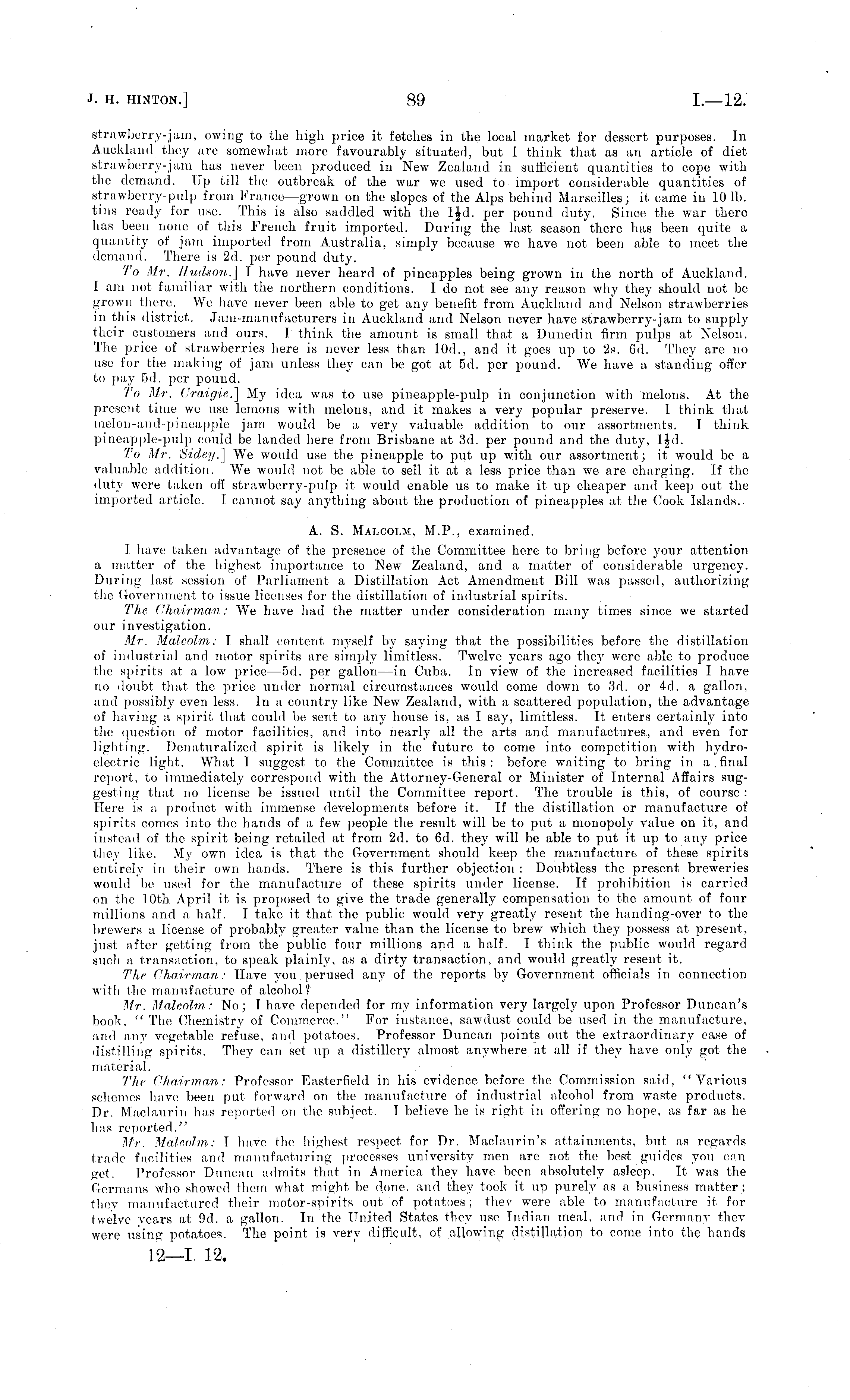 strawberry-jam, owing to the high price it fetches in the local market for dessert purposes. In Auckland they are somewhat more favourably situated, but I think that as an article of diet strawberry-jam has never been produced in New Zealand in sufficient quantities to cope with the demand. Up till the outbreak of the war we used to import considerable quantities of strawberry-pulp from France—grown on the slopes of the Alps behind Marseilles; it came in 10 lb. tins ready for use. This is also saddled with the l|d. per pound duty. Since the war there has been none of this French fruit imported. During the last season there has been quite a quantity of jam imported from Australia, simply because we have not been able to meet the demand. There is 2d. per pound duty. To Mr. Hudson.] I have never heard of pineapples being grown in the north of Auckland. lam not familiar with the northern conditions. Ido not see any reason why they should not be grown there. We, have never been able to get any benefit from Auckland and Nelson strawberries in this district. Jam-manufacturers in Auckland and Nelson never have strawberry-jam to supply their customers and ours. I think the amount is small that a Dunedin firm pulps at Nelson. The price of strawberries here is never less than 10d., and it goes up to 2s. (id. They are no use for the making of jam unless they can be got at sd. per pound. We have a standing offer to pay sd. per pound. To Mr. Graigie.] My idea was to use pineapple-pulp in conjunction with melons. At the present time we use lemons with melons, and it makes a very popular preserve. I think that melon-and-pineapple jam would be a very valuable addition to our assortments. I think pineapple-pulp could be landed here from Brisbane at 3d. per pound and the duty, l|d. To Mr. Sidey.] We would use the pineapple to put up with our assortment; it would be a valuable addition. We would not be able to sell it at a less price than we are charging. If the duty were taken off strawberry-pulp it would enable us to make it up cheaper and keep out the imported article. I cannot say anything about the production of pineapples at the Cook Islands. A. S. Malcolm, M.P., examined. 1 have taken advantage of the presence of the Committee here to bring before your attention a matter of the highest importance to New Zealand, and a matter of considerable urgency. During last session of Parliament a Distillation Act Amendment Bill was passed, authorizing the Government to issue licenses for the distillation of industrial spirits. The Chairman: We have had the matter under consideration many times since we started our investigation. Mr. Malcolm: I shall content myself by saying that the possibilities before the distillation of industrial and motor spirits are simply limitless. Twelve years ago they were able to produce the spirits at a low price—sd. per gallon —in Cuba. In view of the increased facilities I have no doubt that the price under normal circumstances would come down to 3d. or 4d. a gallon, and possibly even less. In a country like New Zealand, with a scattered population, the advantage of having a spirit that could be sent to any house is, as I say, limitless. It enters certainly into the question of motor facilities, and into nearly all the arts and manufactures, and even for lighting. Denaturalized spirit is likely in the future to come into competition with hydroelectric light. What I suggest to the Committee is this: before waiting to bring in a, final report, to immediately correspond with the Attorney-General or Minister of Internal Affairs suggesting that no license be issued until the Committee report, The trouble is this, of course: Here is a product witli immense developments before it. If the distillation or manufacture of spirits comes into the hands of a few people the result will be to put a monopoly value on it, and instead of the spirit being retailed at from 2d. to 6d. they will be able to put it up to any price they like. My own idea is that the Government should keep the manufacture of these spirits entirely in their own hands. There is this further objection : Doubtless the present breweries would be used for the manufacture of these spirits under license. If prohibition is carried on the 10th April it is proposed to give the trade generally compensation to the amount of four millions and a half. I take it that the public would very greatly resent the handing-over to the brewers a license of probably greater value than the license to brew which they possess at present, just after getting from the public four millions and a half. I think the public would regard such a transaction, to speak plainly, as a dirty transaction, and would greatly resent it. The Chairman: Have you, perused any of the reports by Government officials in connection with the manufacture of alcohol? Mr. Malcolm: No; I have depended for my information very largely upon Professor Duncan's book. " The Chemistry of Commerce." For instance, sawdust could be used in the manufacture, and any vegetable refuse, and potatoes. Professor Duncan points out the extraordinary ease of distilling spirits. They can set up a distillery almost anywhere at all if they have only got the material. The Chairman: Professor Easterfield in his evidence before the Commission said, "Various schemes have been put forward on the manufacture of industrial alcohol from waste products. Dr. Maclaurin has reported on the subject, T believe he is right in offering no hope, as far as he has reported." Mr, Malcerfm,: T have the highest respect for Dr. Maclaurin's attainments, but as regards trade facilities and manufacturing processes university men arc not the best guides you can get. Professor Duncan admits that in America they have been absolutely asleep. It was the Germans who showed them what might be done, and they took it up purely as a business matter: they manufactured their motor-spirits out of potatoes ; they were able to manufacture it