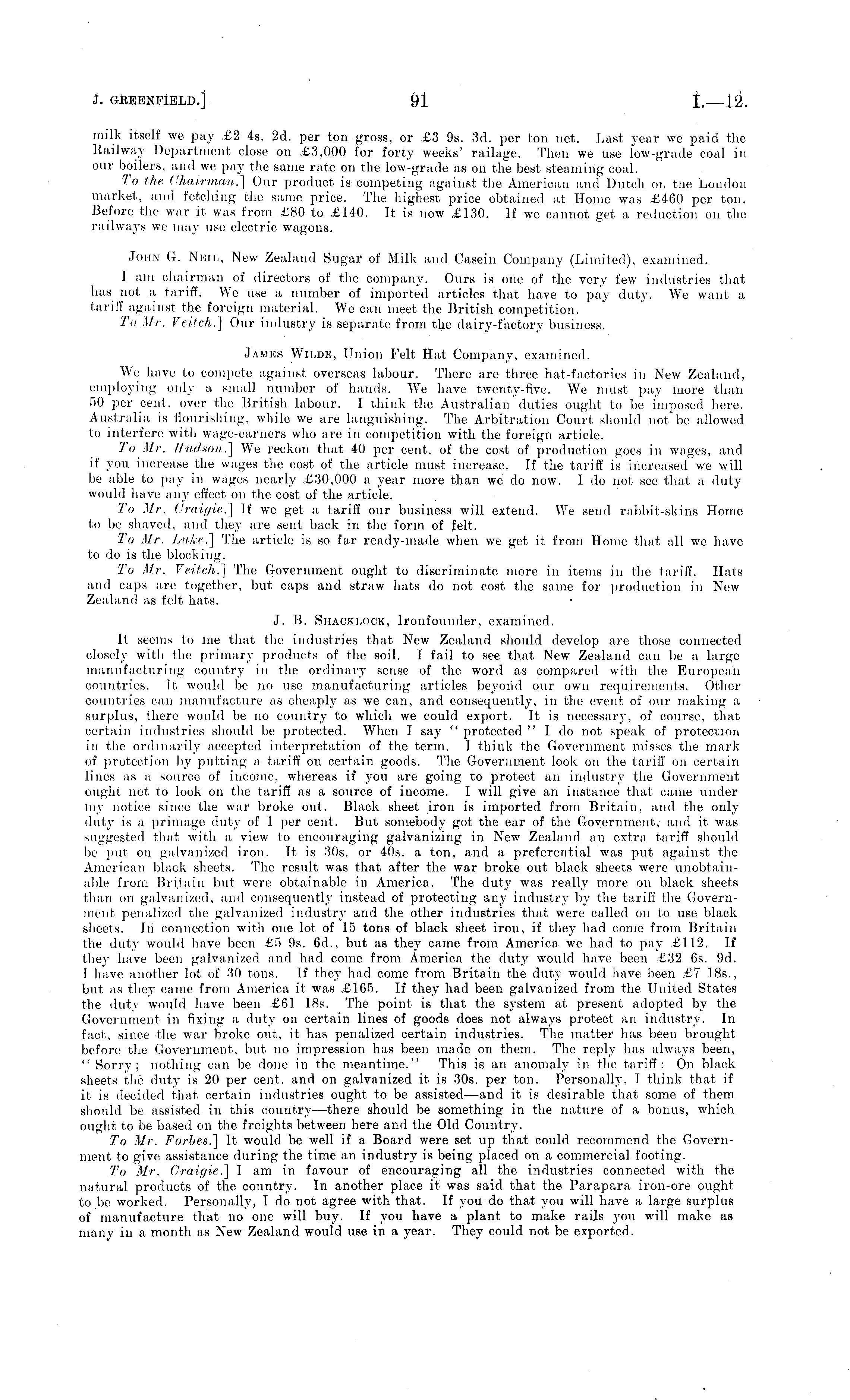 milk itself we pay £2 4s. 2d. per ton gross, or £8 9s. 3d. per ton net. Last year we paid the Railway Department close on £3,000 for forty weeks' railage. Then we use low-grade coal in our boilers, and we pay the same rate on the low-grade as on the best steaming coal. To the Chairman.] Our product is competing against the American and Dutch on tlie London market, and fetching the same price. The highest price obtained at Home was £460 per ton. Before the war it was from £80 to £140. It is now £130. If we cannot get a reduction on the railways we may use electric wagons. Joiim (I. Neil, New Zealand Sugar of Milk and Casein Company (Limited), examined. I am chairman of directors of the company. Ours is one of the very few industries that has not a tariff. We use a number of imported articles that have to pay duty. AYe want a tariff against the foreign material. We can meet the British competition. To Mr. Veitch.] Our industry is separate from the dairy-factory business. James Wilde, Union Felt Hat Company, examined. We have Io compete against overseas labour. There are three hat-factories in New Zealand, employing only a small number of hands. We have twenty-five. We must pay more than 50 per cent, over the British labour. I think the Australian duties ought to be imposed here. Australia is flourishing, while we are languishing. The Arbitration Court should not be allowed to interfere with wage-earners who are in competition with the foreign article. Te> Mr. Hudson.] We reckon that 40 per cent, of the cost of production goes in wages, and if you increase the wages the cost of the article must increase. If the tariff is increased we will be able to pay in wages nearly £30,000 a year more than we do now. I do not sec that a duty would have any effect on the cost of the article. To Mr. Graigie.] If we get a tariff our business will extend. We send rabbit-skins Home to be shaved, and they are sent back in the form of felt. To Mr. Luke.] The article is so far ready-made when we get it from Home that all we have to do is the blocking. To Mr. Veitch.] The Government ought to discriminate more in items in the tariff. Hats and caps are together, but caps and straw hats do not cost the same for production in New Zealand as felt hats. J. B. Shacklock, Ironfouuder, examined. It seems to me that the industries that New Zealand should develop arc those connected closely with the primary products of the soil. I fail to see that New Zealand can lie a large manufacturing country in the ordinary sense of the word as compared with the European countries. If, would be no use manufacturing articles beyond our own requirements. Other countries can manufacture as cheaply as we can, and consequently, in the event, of our making a surplus, there would be no country to which we could export. It is necessary, of course, that certain industries should be protected. When I say " protected " I do not speak of protection in the ordinarily accepted interpretation of the term. I think the Government misses the mark of protection by putting a tariff on certain goods. The Government look on the tariff on certain lines as a source of income, whereas if you are going to protect an industry the Government ought not, to look on the tariff as a source of income. I will give an instance that came under my notice since the war broke out, Black sheet iron is imported from Britain, and the only duty is a primage duty of 1 per cent. But somebody got the ear of the Government, and it was suggested that with a view to encouraging galvanizing in New Zealand an extra tariff should be put on galvanized iron. It is 30s. or 40s. a ton, and a preferential was put against the American black sheets. The result was that after the war broke out black sheets were unobtainable from Britain but were obtainable in America. The duty was really more on black sheets than on galvanized, and consequently instead of protecting any industry by the tariff the Government penalized the galvanized industry and the other industries that were called on to use black sheets. lii connection with one lot of 15 tons of black sheet iron, if they had come from Britain the duty would have been £5 9s. 6d., but as they came from America we had to pay £112. If the}? have been galvanized and had come from America the duty would have been £32 6s. 9d. 1 have another lot of 30 tons. If they had come from Britain the duty would have been £7 18s., but as they came from America it was £165. If they had been galvanized from the United States the duty would have been £61 18s. The point is that the system at present adopted by the Government in fixing a duty on certain lines of goods does not always protect an industry. In fact, since the war broke out, it has penalized certain industries. The matter has been brought before the Government, but no impression has been made on them. The reply has always been, "Sorry; nothing can be done in the meantime." This is an anomaly in the tariff: On black sheets the duty is 20 per cent, and on galvanized it is 30s. per ton. Personally, I think that, if it is decided that certain industries ought, to be assisted—and it is desirable that some of them should be assisted in this country—there should be something in the nature of a bonus, which ought to be based on the freights between here and the Old Country. To Mr. Forbes.] It would be well if a Board were set up that could recommend the Government to give assistance during the time an industry is being placed on a commercial footing. To Mr. Graigie.] I am in favour of encouraging all the industries connected with the natural products of the country. In another place it was said that the Parapara iron-ore ought to be worked. Personally, Ido not agree with that. If you do that you will have a large surplus of manufacture that no one will buy. If you have a plant to make rails you will make as many in a month as New Zealand would use in a year. They could not be exported.
