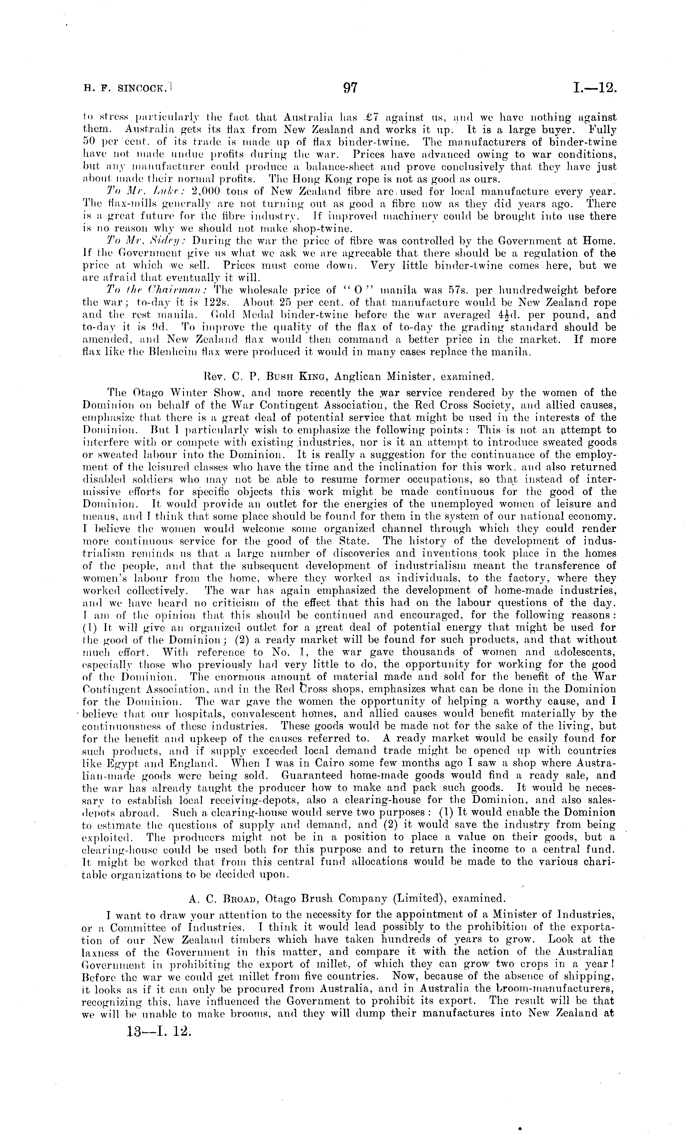 to stress particularly the fact that Australia has £7 against us, and we have nothing against them. Australia gets its flax from New Zealand and works it up. It is a large buyer. Fully 50 per cent, of its trade is made up of flax binder-twine. The manufacturers of binder-twine have not made undue profits during the war. Prices have advanced owing to war conditions, but any manufacturer could produce a balance-sheet and prove conclusively that thejr have just about made their normal profits. The Hong Kong rope is not as good as ours. To Mr. Luke: 2,000 tons of New Zealand fibre are.used for local manufacture every year. The flax-mills generally are not turning out as good a fibre now as they did years ago. There is a great future for the fibre industry. If improved machinery could be brought into use there is no reason why we should not make shop-twine. To Mr. Sidey: During the war the price of fibre was controlled by the Government at Home. If the Government give us what we ask we are agreeable that there should be a regulation of the price at which we sell. Prices must come down. Very little binder-twine comes here, but we are afraid that eventually it will. To the Chairman: The wholesale price of "O" manila was 575. per hundredweight before the war; to-day it is 1225. About 25 per cent, of that manufacture would be New Zealand rope and the rest manila, Gold Medal binder-twine before the war averaged 4|d. per pound, and to-day it is 9d. To improve the quality of the flax of to-day the grading standard should be amended, and New Zealand flax would then command a better price in the market, If more flax like the Blenheim flax were produced it would in many cases replace the manila. Rev. C. P. Bush Kino, Anglican Minister, examined. The Otago Winter Show, and more recently the .war service rendered by the women of the Dominion on behalf of the War Contingent Association, the Red Cross Society, and allied causes, emphasize that there is a great deal of potential service that might be used in the interests of the Dominion. But 1 particularly wish to emphasize the following points : This is not an attempt to interfere with or compete with existing industries, nor is it an attempt to introduce sweated goods or sweated labour into the Dominion. It is really a suggestion for the continuance of the employment of the leisured classes who have the time and the inclination for this work, and also returned disabled soldiers who may not be able to resume former occupations, so that instead of intermissive efforts for specific objects this work might be made continuous for the good of the Dominion. It would provide an outlet for the energies of the unemployed women of leisure and means, and I think that some place should be found for them in the system of our national economy. I believe the women would welcome some organized channel through which they could render more continuous service for the good of the State. The history of the development of industrialism reminds us that a large number of discoveries and inventions took place in the homes of the people, and that the subsequent development of industrialism meant the transference of women's labour from the home, where they worked as individuals, to the factory, where they worked collectively. The war has again emphasized the development of home-made industries, and we have heard no criticism of the effect that this had on the labour questions of the day. I am of the opinion that this should be continued and encouraged, for the following reasons: (1) It, will give an organized outlet for a great deal of potential energy that might be used for the good of the Dominion; (2) a ready market will be found for such products, and that without much effort. With reference to No. 1, the war gave thousands of women and adolescents, especially those who previously had very little to do, the opportunity for working for the good of the Dominion. The enormous amount of material made and sold for the benefit of the War Contingent Association, and in the Red Cross shops, emphasizes what can be done in the Dominion for the Dominion. The war gave the women the opportunity of helping a worthy cause, and I believe that our hospitals, convalescent homes, and allied causes would benefit materially by the continuousness of these industries. These goods would be made not for the sake of the living, but for the benefit and upkeep of the causes referred to. A ready market would be easily found for such products, and if supply exceeded local demand trade might be opened up with countries like Egypt and England. When I was in Cairo some few months ago I saw a shop where Austra-lian-made goods were being sold. Guaranteed home-made goods would find a ready sale, and the war has already taught the producer how to make and pack such goods. It would be necessary to establish local receiving-depots, also a clearing-house for the Dominion, and also salesdepots abroad. Such a. clearing-house would serve two purposes : (1) It would enable the Dominion to estimate the questions of supply and demand, and (2) it would save the industry from being exploited. The producers might not be in a position to place a value on their goods, but a clearing-house could be used both for this purpose and to return the income to a central fund. It might be worked that from this central fund allocations would be made to the various charitable organizations to be decided upon. A. C. Broad, Otago Brush Company (Limited), examined. I want to draw your attention to the necessity for the appointment of a Minister of Industries, or a, Committee of Industries. I think it would lead possibly to the prohibition of the exportation of our New Zealand timbers which have taken hundreds of years to grow. Look at the laxness of the Government in this matter, and compare it with the action of the Australian Government in prohibiting the export of millet, of which they can grow two crops in a year 1 Before the war we coul
