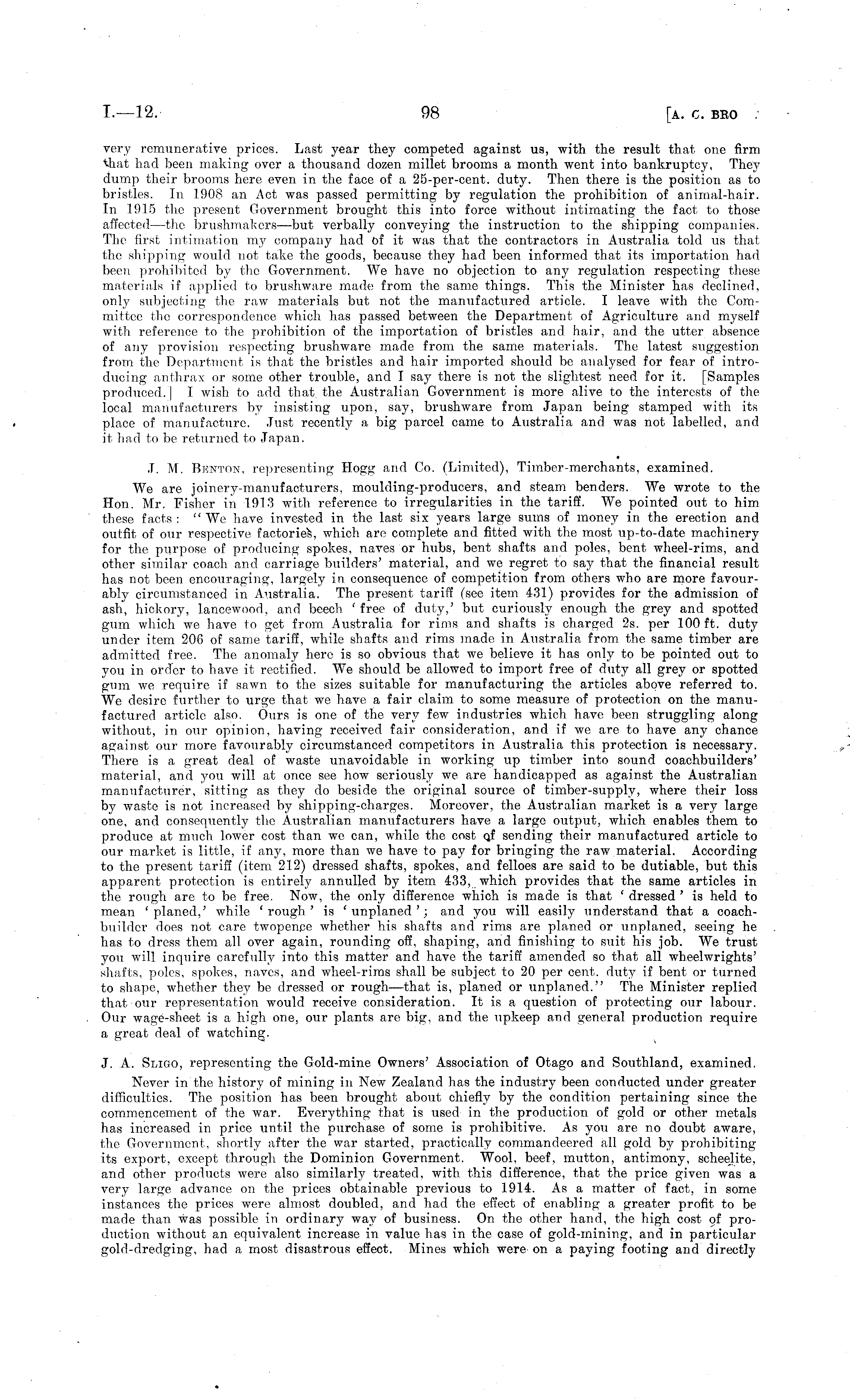 very remunerative prices. Last year they competed against us, with the result that one firm that had been making over a thousand dozen millet brooms a month went into bankruptcy. They dump their brooms here even in the face of a 25-per-cent. duty. Then there is the position as to bristles. In 1908 an Act was passed permitting by regulation the prohibition of animal-hair. In 1915 the present Government brought this into force without intimating the fact to those affected —the brushmakers —but verbally conveying the instruction to the shipping companies. The first intimation my company had of it was that the contractors in Australia told us that the shipping would not take the goods, because they had been informed that its importation had been prohibited by the Government. We have no objection to any regulation respecting these materials if applied to brushware made from the same things. This the Minister has declined, only subjecting the raw materials but not the manufactured article. I leave with the Committee the correspondence which has passed between the Department of Agriculture and myself with reference to the prohibition of the importation of bristles and hair, and the utter absence of any provision respecting brushware made from the same materials. The latest suggestion from the Department is that the bristles and hair imported should be analysed for fear of introducing anthrax or some other trouble, and I say there is not the slightest need for it. [Samples produced. | I wish to add that, the Australian Government is more alive to the interests of the local manufacturers by insisting upon, say, brushware from Japan being stamped with its place of manufacture. Just recently a big parcel came to Australia and was not labelled, and it had to be returned to Japan. J. M. Benton, representing Hogg and Co. (Limited), Timber-merchants, examined. We are joinery-manufacturers, moulding-producers, and steam benders. We wrote to the Hon. Mr. Fisher in 1913 with reference to irregularities in. the tariff. We pointed out to him these facts : " We have invested in the last six years large sums of money in the erection and outfit of our respective factories, which are complete and fitted with the most up-to-date machinery for the purpose of producing spokes, naves or hubs, bent shafts and poles, bent wheel-rims, and other similar coach and carriage builders' material, and we regret to say that the financial result has not been encouraging, largely in consequence of competition from, others who are more favourably circumstanced in Australia. The present tariff (see item 431) provides for the admission of ash, hickory, lancewood, and beech ' free of duty,' but curiously enough the grey and spotted gum which we have to get from Australia for rims and shafts is charged 2s. per 1.00 ft. duty under item 206 of same tariff, while shafts and rims made in Australia from the same timber are admitted free. The anomaly here is so obvious that we believe it has only to be pointed out to you in order to have it rectified. We should be allowed to import free of duty all grey or spotted gum we require if sawn to the sizes suitable for manufacturing the articles above referred to. We desire further to urge that we have a fair claim to some measure of protection on the manufactured article also. Ours is one of the very few industries which have been struggling along without, in our opinion, having received fair consideration, and if we are to have any chance against our more favourably circumstanced competitors in Australia this protection is necessary. There is a great deal of waste unavoidable in working up timber into sound coachbuilders' material, and you will at once see how seriously we are handicapped as against the Australian manufacturer, sitting as they do beside the original source of timber-supply, where their loss by waste is not increased by shipping-charges. Moreover, the Australian market is a very large one, and consequently the Australian manufacturers have a large output, which enables them to produce at much lower cost than we can, while the cost qf sending their manufactured article to our market is little, if any, more than we have to pay for bringing the raw material. According to the present tariff (item 21.2) dressed shafts, spokes, and felloes are said to be dutiable, but this apparent protection is entirely annulled by item 433, which provides that the same articles in the rough are to be free. Now, the only difference which is made is that ' dressed ' is held to mean 'planed,' while 'rough' is ' unplaned '; and you will easily understand that a coachbuilder does not care twopence whether his shafts and rims are planed or unplaned, seeing he has to dress them all over again, rounding off, shaping, and finishing to suit his job. We trust you will inquire carefully into this matter and have the tariff amended so that all wheelwrights' shafts, poles, spokes, naves, and wheel-rims shall be subject to 20 per cent, duty if bent or turned to shape, whether they be dressed or rough —that is, planed or unplaned." The Minister replied that our representation would receive consideration. It is a question of protecting our labour. Our wage-sheet is a high one, our plants are big, and the upkeep and general production require a great deal of watching. J. A. Sligo, representing the Gold-mine Owners' Association of Otago and Southland, examined. Never in the history of mining in New Zealand has the industry been conducted under greater difficulties. The position has been brought about chiefly by the condition pertaining since the commencement of the war. Everything' that is used in the production of gold or other metals has increased in price until the purchase of some is prohibitive. As you are no doubt aware, the Government, shortly after the war started, practically commandeered all gold by prohibiting its export, except through the Dominion Government. Wool, beef, mutton, antimony, scheelite