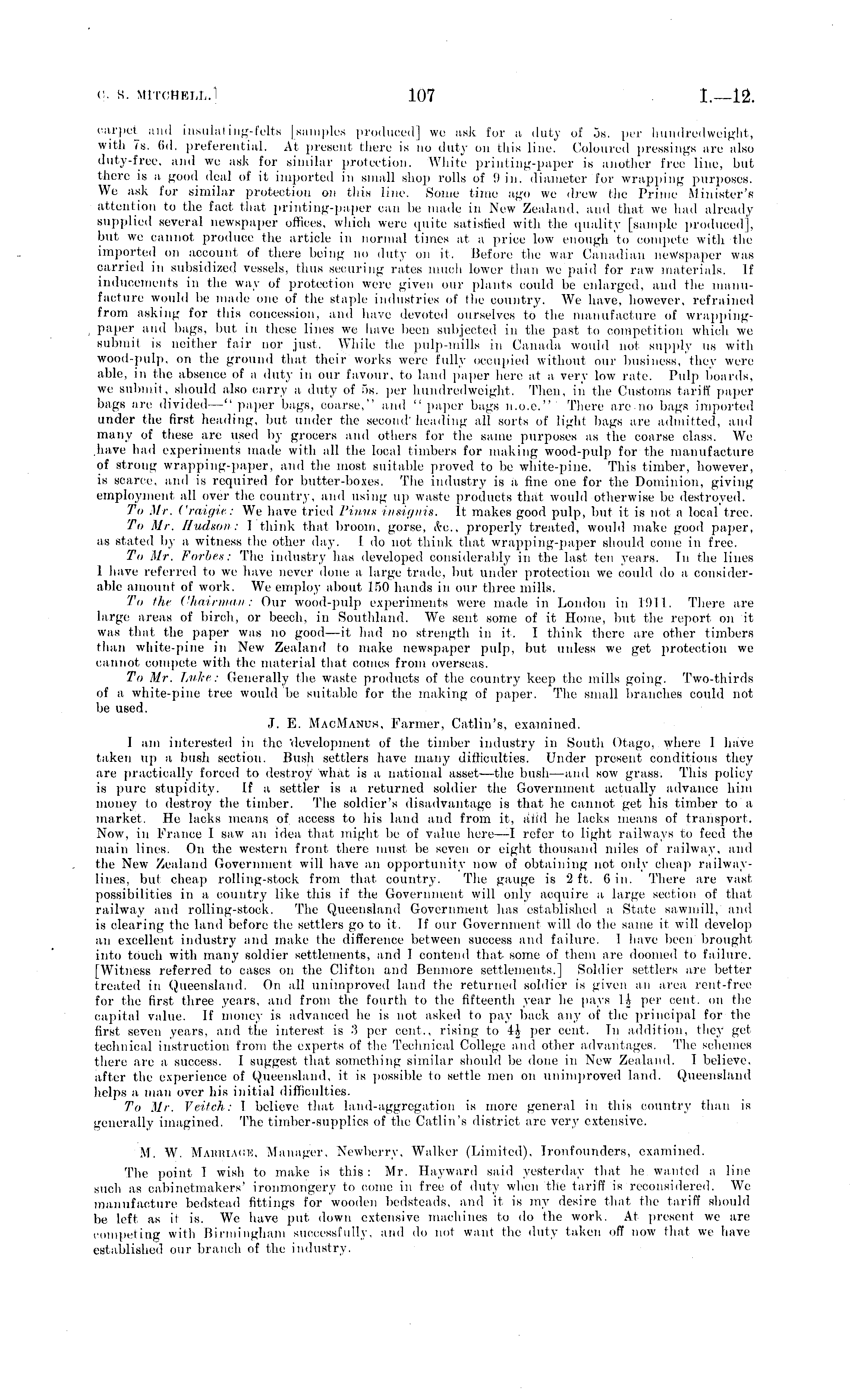 carpet and insulating-fells [samples produced] We ask for a duty of ss. per hundredweight, with 7s. (id. preferential, At present there is no duty on this line. Coloured pressings are also duty-free, and we ask for similar protection. White printing-paper is another free line, bid there is a good deal of it imported in small shop rolls of !) in. diameter for wrapping purposes. We ask for similar protection on this line. Some time ago we drew the Prime Minister's attention to the fact that printing-paper can be made in New Zealand, and that we had already supplied several newspaper offices, which were quite satisfied with the quality [sample produced], but we cannot produce the article in normal times at a price low enough to compete with the imported on account of there being no duly on it. Before the war Canadian newspaper was carried in subsidized vessels, thus securing rates much lower than we paid for raw materials; If inducements in the way of protection were given our plants could be enlarged, and Hie manufacture would be made one of the staple industries of Hie country. We have, however, refrained from asking for this concession, ami have devoted ourselves to the manufacture of wrappingpaper and bags, but in these lines we have been subjected in Hie past lo competition which we submit is neither fair nor just. While the pulp-mills in Canada would no! supply us with wood-pulp, on the ground that their works were fully occupied without our business, they were able, in the absence of a duty in our favour, to land paper here at a very low rate. Pulp boards, we submit, should also carry a duty of ss. per hundredweight. Then, in the Customs tariff paper bags are divided —" paper bags, coarse," and " paper bags n.0.e." There are uo bags imported under the first heading, but under the second'heading all sorts of light bags are admitted, and many of these are used by grocers and others for the same purposes as the coarse class. We .have had experiments made with all the local timbers for making wood-pulp for the manufacture of strong wrapping-paper, and the most suitable proved to be White-pine, This timber, however, is scarce, and is required for butter-boxes. The industry is a fine one for the Dominion, giving employment all over the country, and using up waste products that would otherwise be destroyed. To Mr. Graigie: We have tried Pinus insignis. It makes good pulp, but it is not a local tree. To Mr. Hudson: I think that broom, gorse, &c., properly treated, would make good paper, as stated by a witness the other day. Ido not think that wrapping-paper should come in free. To Mr. Forbes: The industry has developed considerably in the last, ten years. In the lines 1 have referred to we have never done a large trade, but under protection we could do a considerable amount of work. We employ about 150 hands in our three mills. To the Chairman: Our wood-pulp experiments were made in London in 1911. There- are large areas of birch, or beech, in Southland. We sent some of it Home, but the report on it was that the paper was no good—it, had no strength in it. I think there are other limbers than white-pine in New Zealand to make newspaper pulp, but unless we get protection we cannot compete with the material that comes from overseas. To Mr. Luke: Generally the waste products of the country keep the mills going. Two-thirds of a white-pine tree would be suitable for the making of paper. The small branches could not be used. J. E. MacManus, Farmer, Catlin's, examined. I am interested in the development of the timber industry in South Otago, where I have taken up a bush section. Bush settlers have many difficulties. Under present conditions they are practically forced to destroy what is a national asset —the bush—and sow grass. This policy is pure stupidity. If a settler is a returned soldier the Government actually advance him money to destroy the timber. The soldier's disadvantage is that lie cannot get his timber to a market. He lacks means of access to his land and from it, and he lacks means of transport, Now, in France I saw an idea, that might be of value here—l refer to light railways to feed the main lines. On the western front there must be seven or eight thousand miles of railway, and the New Zealand Government will have an opportunity now of obtaining not only cheap railwaylines, but cheap rolling-stock from that country. The gauge is 2 ft. 6 in. There are vast possibilities in a country like this if the Government will only aoquire a large section of that railway and rolling-stock. The Queensland Government has established a State sawmill, and is clearing the land before the settlers goto it. If our Government will do the same it will develop an excellent industry and make the difference between success and failure. I have been brought into touch with many soldier settlements, and I contend that some of them are doomed to failure. [Witness referred to cases on the Clifton and Benmore settlements.] Soldier settlers are better treated in Queensland. On all unimproved land the returned soldier is given an area rent-free for the first three years, and from the fourth to the fifteenth year lie pays I J, per cent, on the Capita*] value. If money is advanced he is not asked to pay back any of the principal for the first seven years, and the interest is 3 per cent., rising to 4J per cent. In addition, (hey get technical instruction from the experts of the Technical College and other advantages. The schemes there are a success. I suggest that, something similar should be done in New Zealand. I believe, after the experience of Queensland, it is possible to set He men on unimproved land. Queensland helps a man over his initial difficulties. To Mr. Veitch: 1 believe that laud-aggregation is more general in this country than is generally imagined. The timber-supplies of the Catlin's district are very extensive. M. W. MARRIAGE, Manager, Newberry, Walker (Limited), 1 ronfoundcrs, examined. 