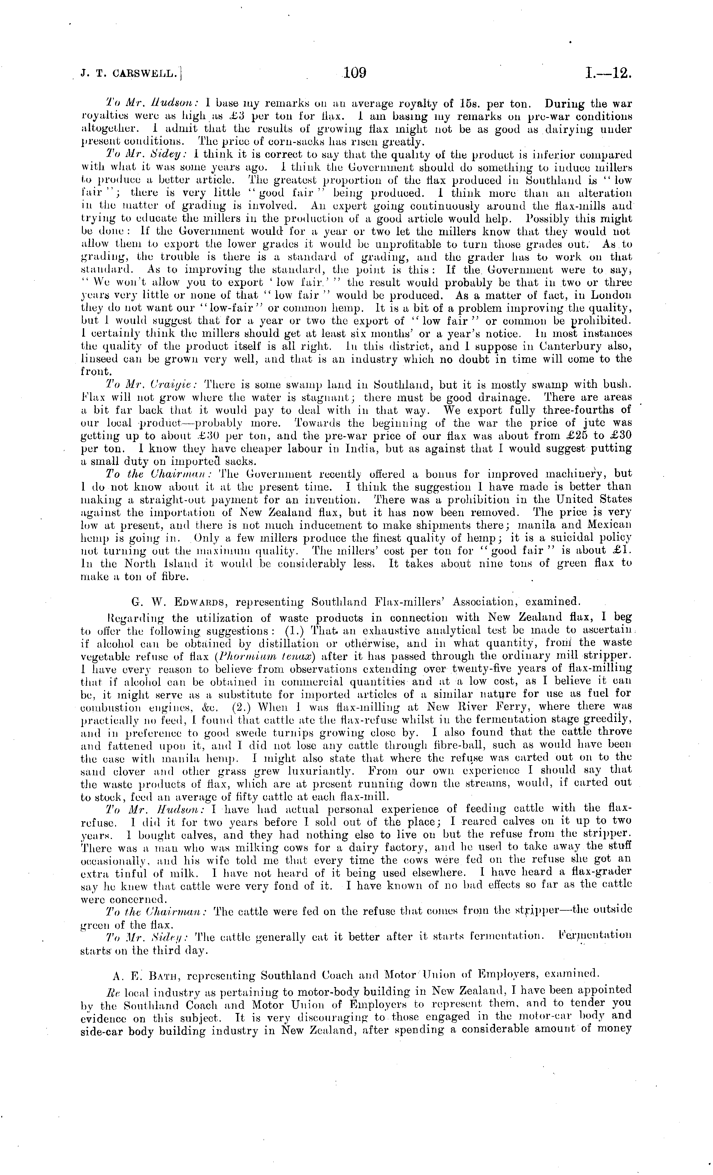 To Mr. Hudson: I base my remarks on an average royalty of 15s. per ton. During the war royalties were as high as £3 per ton for flax. 1 am basing my remarks on pre-war conditions altogether. 1 admit that the results of growing llax might not be as good as dairying under present conditions. The price of corn-sacks has risen greatly. To Mr. Sidey: I think it is correct to say that the quality of the product is inferior compared with what it was some years ago. 1 think the Government should do something to induce millers to produce a better article. The greatest proportion of the flax produced in Southland is " low fair"; there is very little "good fair" being produced. I think more than an alteration in the matter of grading is involved. An expert going continuously around the flax-mills and trying to educate the millers in the production of a good article would help. Possibly this might, be done : If the Government would for a year or two let the millers know that they would not allow them to export the lower grades it would be unprofitable to turn those grades out. As to grading, the trouble is there is a standard of grading, and the grader has to work on that standard. As to improving the standard, the point is this :If the. Government were to say, " We won't allow you to export ' low fair.' " the result would probably be that in two or three years very little or none of that " low fair " would be produced. As a matter of fact, in London they do not want our "low-fair" or common hemp. It is a bit of a problem improving the quality, but 1 would suggest that for a year or two the export of "low fair" or common be prohibited. 1 certainly think the millers should get at least six months' or a year's notice. In most instances the quality of the product itself is all right. In this district, and 1 suppose in Canterbury also, linseed can be grown very well, and that is an industry which no doubt in time will come to the front. To Mr. Graigie: There is some swamp land in Southland, but it is mostly swamp with bush. Flax will not grow where the water is stagnant; there must be good drainage. There are areas a bit far back that it would pay to deal with in that way. We export fully three-fourths of our local product—probably more, 'towards the beginning of the war the pirice of jute was getting up to about £30 per ton, and the pre-war price of our flax was about from £25 to £30 per ton. I know they have cheaper labour in India,, but as against that I would suggest putting a small duty on imported sacks. To the Chairman : The Government recently offered a bonus for improved machinery, but 1 do not know about it at the present time. I think the suggestion 1 have made is better than making a straight-out payment for an invention. There was a prohibition in the United States against the importation of New Zealand flax, but it has now been removed. The price is very low at present, and there is not much inducement to make shipments there; manila and Mexican hemp is going in. Only a few millers produce the finest quality of hemp; it is a suicidal policy not turning out the maximum quality. The millers' cost per ton for "good fair" is about £1. in the North Island it would be considerably less. It takes about nine tons of green flax to make a ton of fibre. G. W. Edwards, representing Southland Flax-millers' Association, examined. Regarding the utilization of waste products in connection with New Zealand flax, 1 beg to offer the following suggestions: (I.) That, an exhaustive analytical test be made to ascertain if alcohol can be obtained by distillation or otherwise, and in what quantity, frond the waste vegetable refuse of flax (Phormium teuax) after it has passed through the ordinary mill stripper. 1 have every reason to believe-from observations extending over twenty-five years of flax-milling that if alcohol can be obtained in commercial quantities and at a low cost, as I believe it can be, it might serve as a substitute for imported articles of a similar nature for use as fuel for combustion engines, <fee, (2.) When J was flax-milling at New River Ferry, where there was practically no feed, I found that cattle ate the flax-refuse whilst in the fermentation stage greedily, and in preference to good swede turnips growing close by. I also found that the cattle throve and fattened upon it, and I did not lose any cattle through fibre-ball, such as would have been the case with manila hemp. I might also state that where the refuse was carted out on to the sand clover and other grass grew luxuriantly. From our own experience I should say that the waste products of flax, which are at present running down the streams, would, if carted out to stock, feed an average of fifty cattle at each flax-mill. To Mr. Hudson: I have had actual personal experience of feeding cattle with the flaxrefuse. 1 did it for two years before I sold out of the place; I reared calves on it up to two years. I bought calves, and they had nothing else to live on but the refuse from the stripper. There was a man who was milking cows for a dairy factory, and he used to take away the stuff occasionally, and his wife told me that every time the cows were fed on the refuse she got an extra tinful of milk. 1 have not heard of it being used elsewhere. I have heard a flax-grader say he knew that cattle were very fond of it. I have known of no bad effects so far as the cattle were concerned. To the Chairman: The cattle were fed on the refuse that conies from the stripper—the outside green of the llax. To Mr. Sidey: The ealfle generally eat it better after it starts fermentation. Fermentation starts on the third day. A. E. Bath, representing Southland Coach and Motor Union of Employers, examined. Be local industry as pertaining to motor-body building in New Zealand, I have been appointed by the Southland Coach and Motor Union of Employers to represent them, and to tender you evidence on this subject, It, is very discouraging to those en